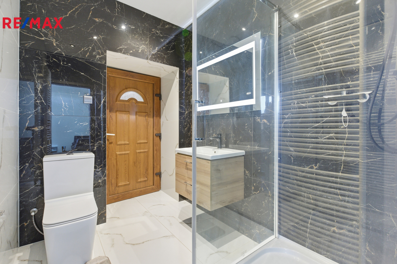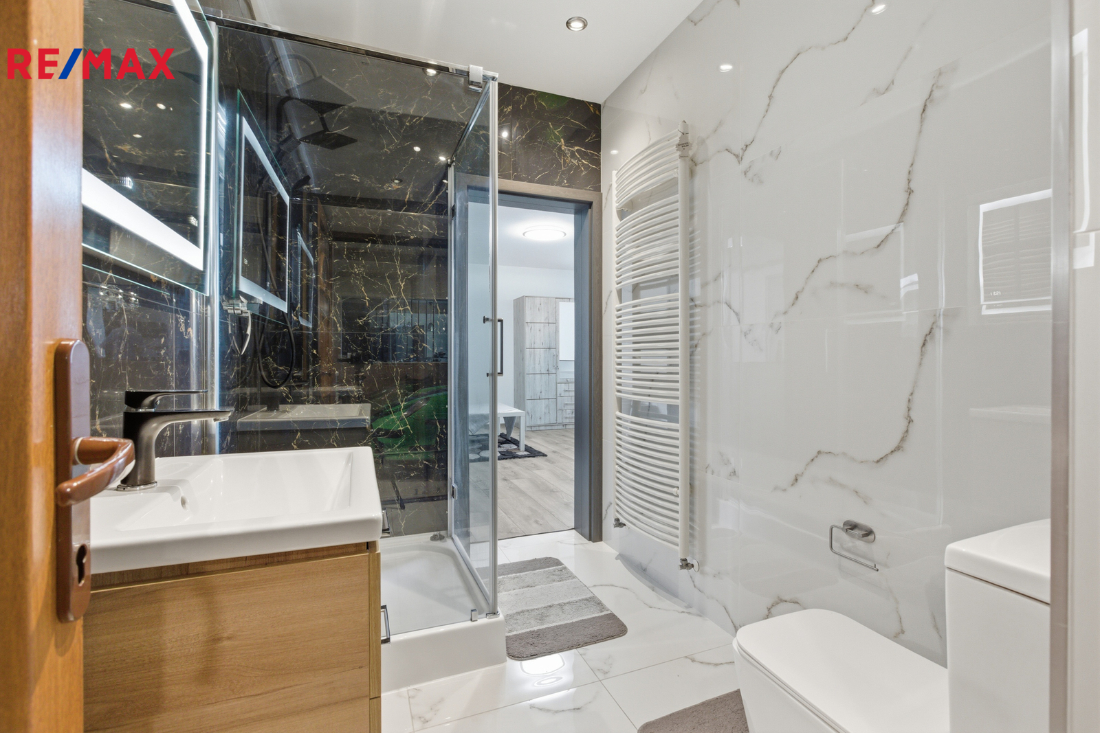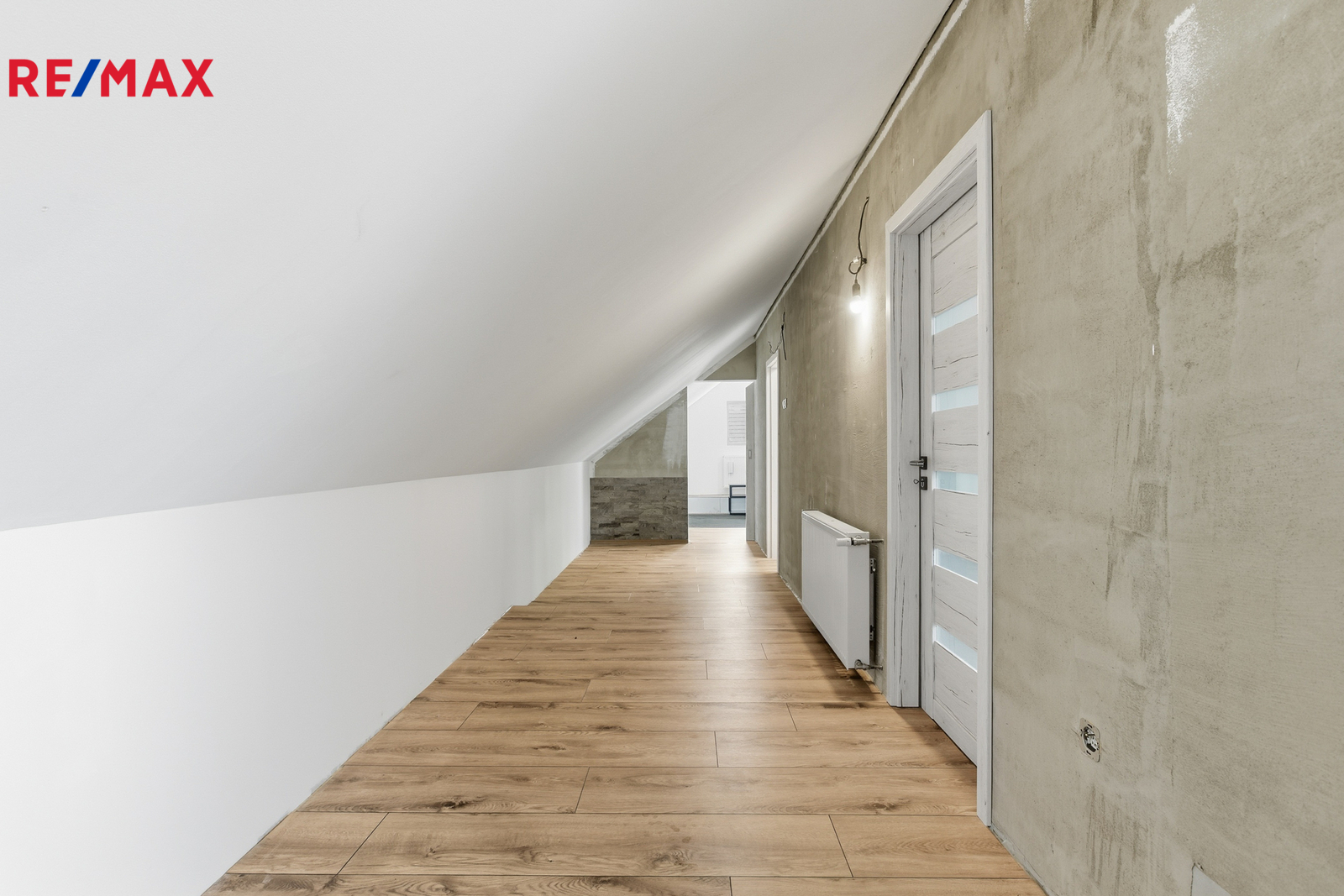 V patře je chodba (15,64 m²), koupelna s vířivou vanou, WC a bidetem (9,88 m²), ložnice (21,06 m²), pokoj (10,62 m²) a galerie (33,25 m²). Schodiště je obloženo pravým mramorem, v koupelnách jsou stejně jako v přízemí velkoformátové dlažby.