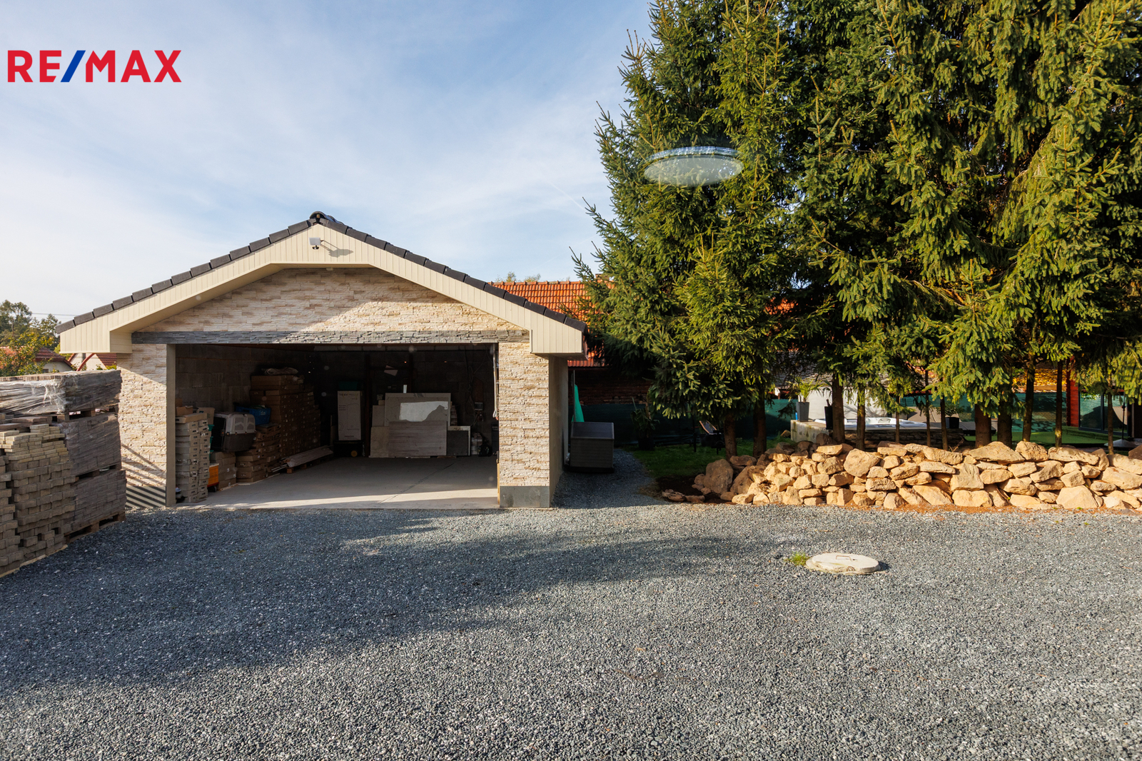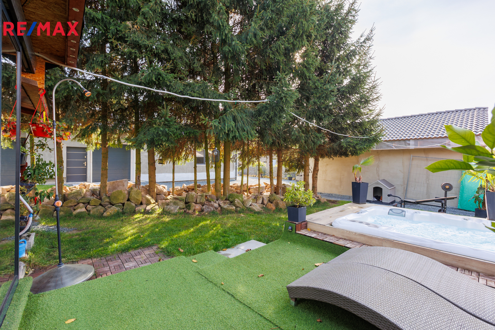 Na pozemku je elektrická vjezdová brána na dálkové ovládání a možnost parkování dalšího auta před domem. Zahrada o rozloze 570 m² nabízí altán (24 m²) s posezením, grilem a vířivkou pro čtyři osoby.