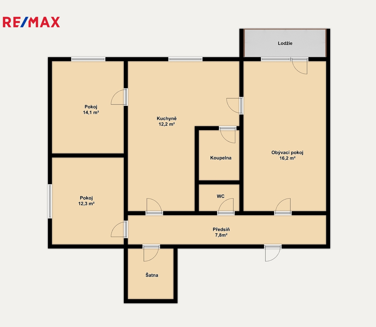 Celková plocha: 75,3 m² ( 68,95 m² podlahová plocha + sklep + lodžie)