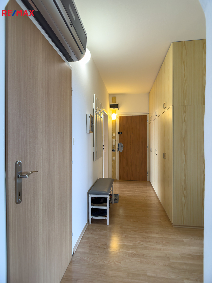 Velkým benefitem je klimatizace, která zajišťuje příjemné klima i během horkých letních měsíců. Vnitřní klimatizační jednotky jsou umístěny v chodbě a v obývacím pokoji, což umožňuje efektivní ochlazení hlavní obytné části bytu a zvýšení celkového komfortu bydlení.