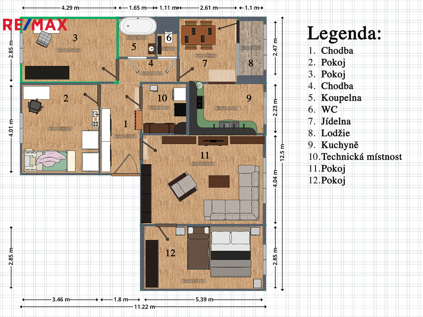 Byt je v osobním vlastnictví a nachází se v 8., tedy posledním patře revitalizovaného panelového domu s výtahem. Užitná plocha dle LV a evidenčního listu činí 97 m² včetně sklepa (bez lodžie), s lodžií pak přesahuje 100 m² – prostoru je zde opravdu dostatek pro každého člena rodiny.