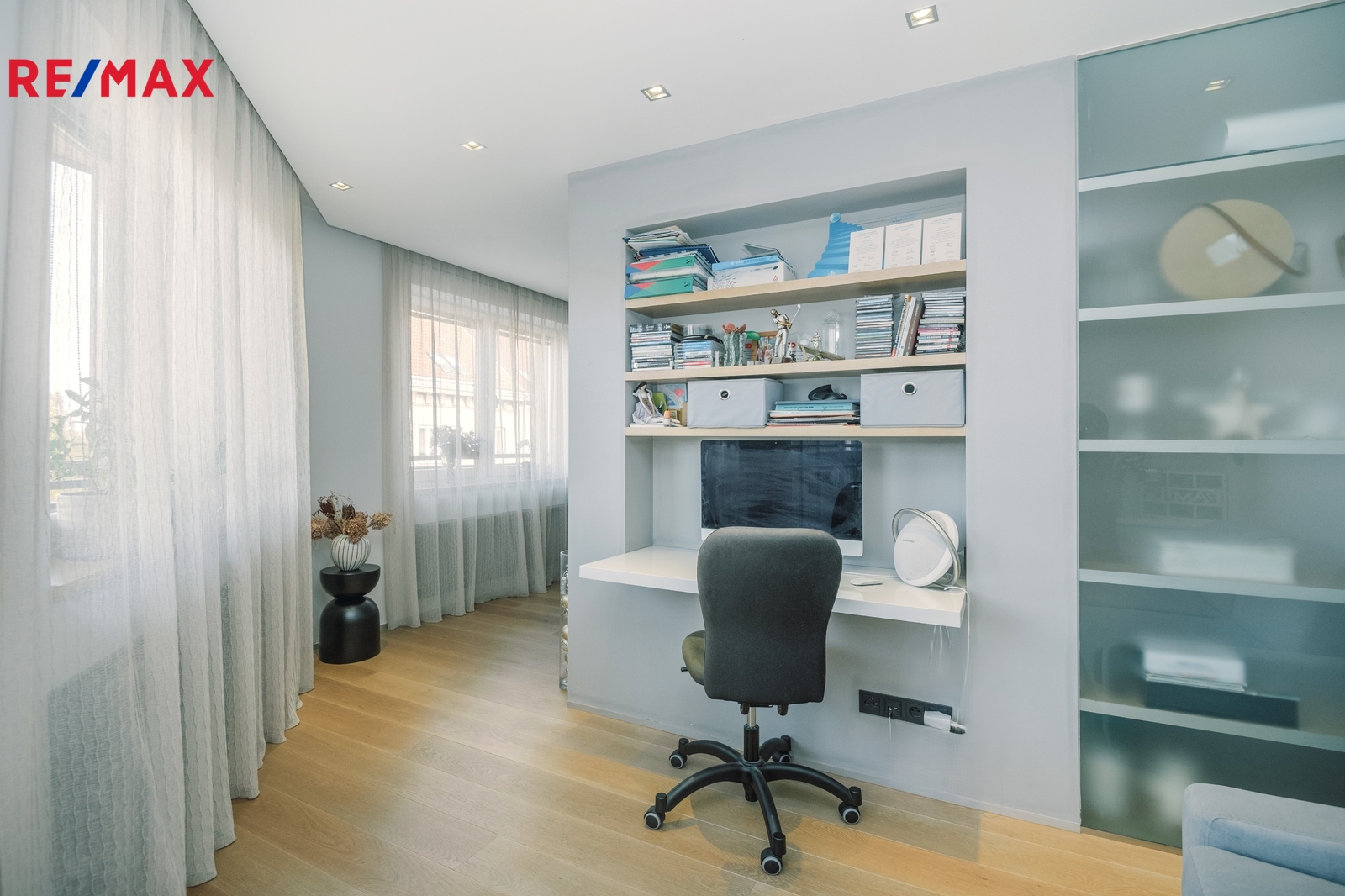 Velice prostorný byt, výborně dispozičně řešený, dominantou je vzdušný obývací pokoj s kompletně vybaveným kuchyňským koutem, který propojuje prostřednictvím předsíně a chodeb další pokoje, koupelny a technické zázemí bytu, viz přiložený půdorys. Za zmínku stojí oddělená pracovna, součást obývacího pokoje.