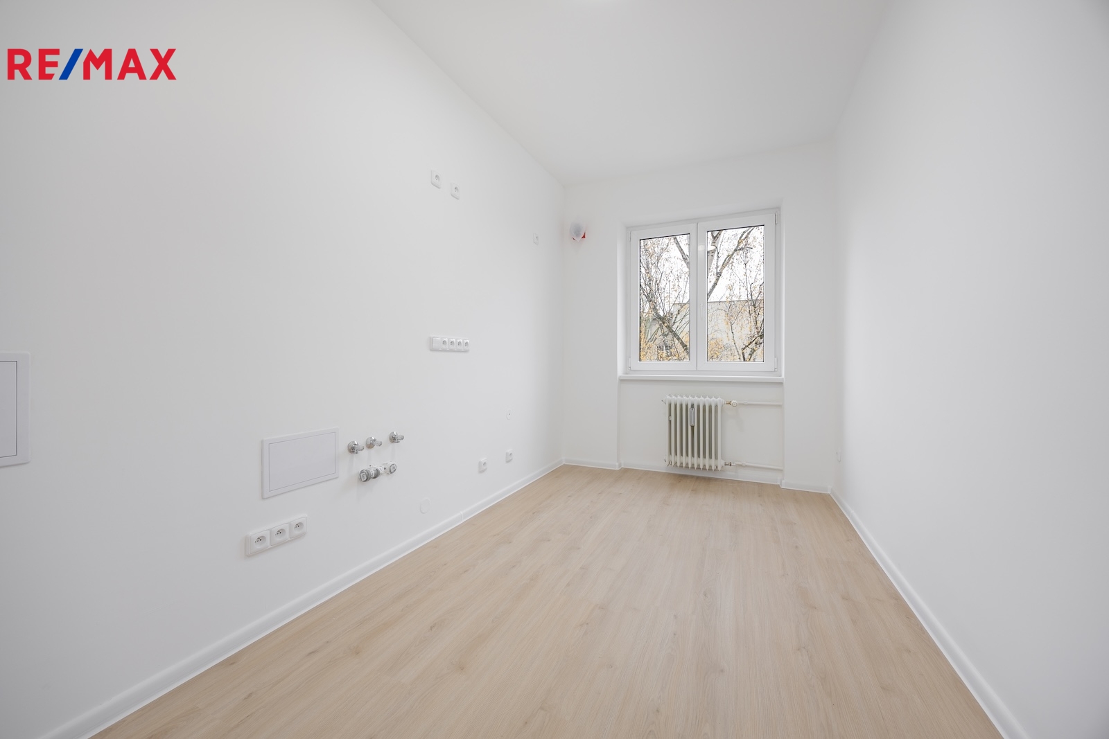 Obývák zdobí francouzské okno – ideální na to, abyste ráno mohli dramaticky roztáhnout závěsy a cítit se jako ve filmu. Kuchyň je připravena k instalaci vlastní linky, takže si můžete splnit sen o kuchyni, ve které budete vařit… nebo si aspoň budete dělat kafe s větším stylem.