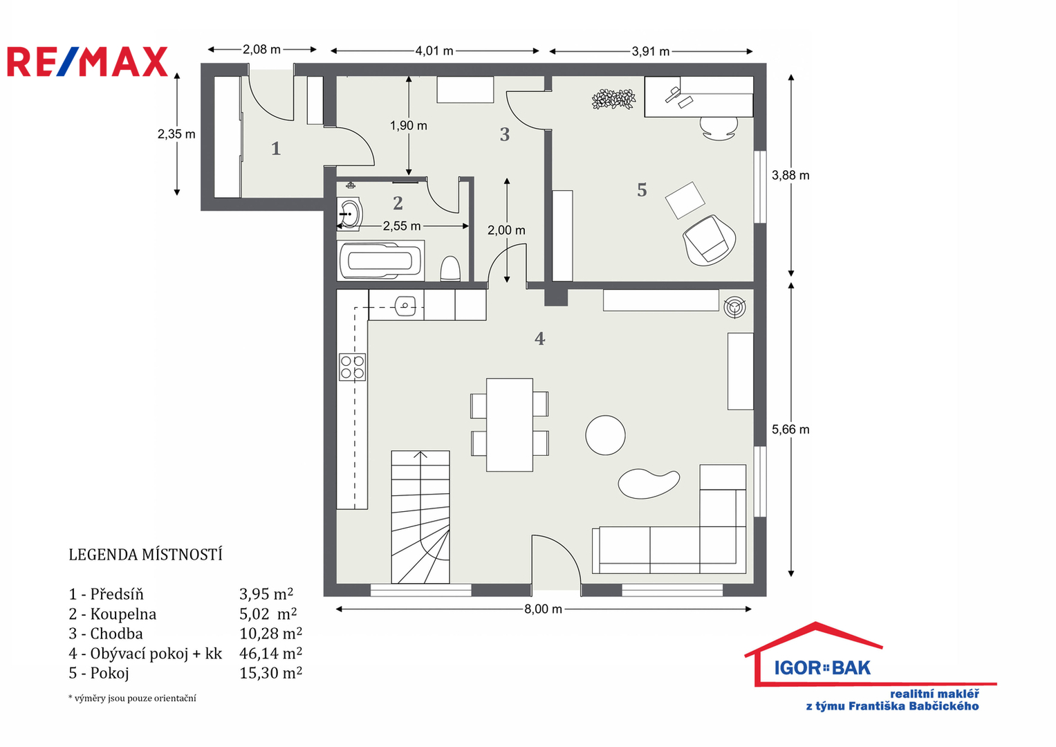 1. podlaží: obývací pokoj s přípravou na kuchyň (46,14 m²), ložnice (15,30 m²), sociální zařízení (5,02 m²), chodba (10,28 m²) a zádveří (3,95 m²).