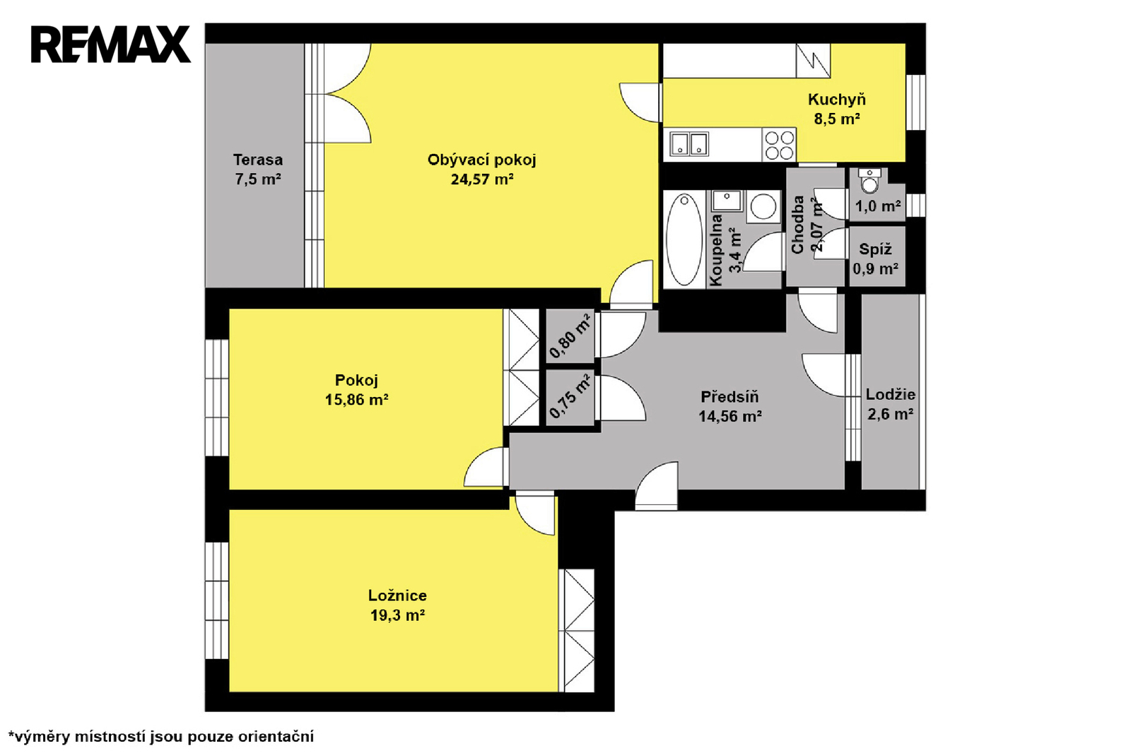 Dispozice: velká chodba s vestavěnou skříní a vstupem do lodžie, dva pokoje s vestavěnou skříní, obývací pokoj se vstupem na terasu a do kuchyně, koupelna, samostatné WC, a spíž. K bytu náleží sklepní prostor 7 m2.