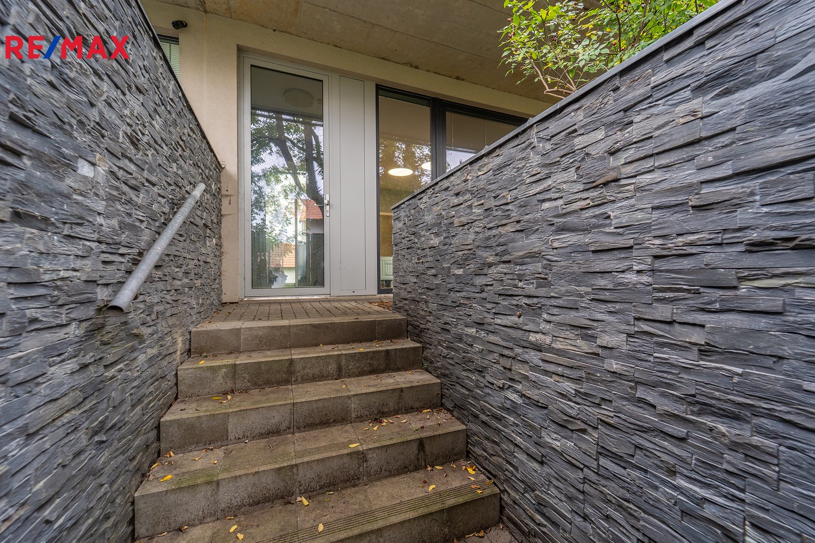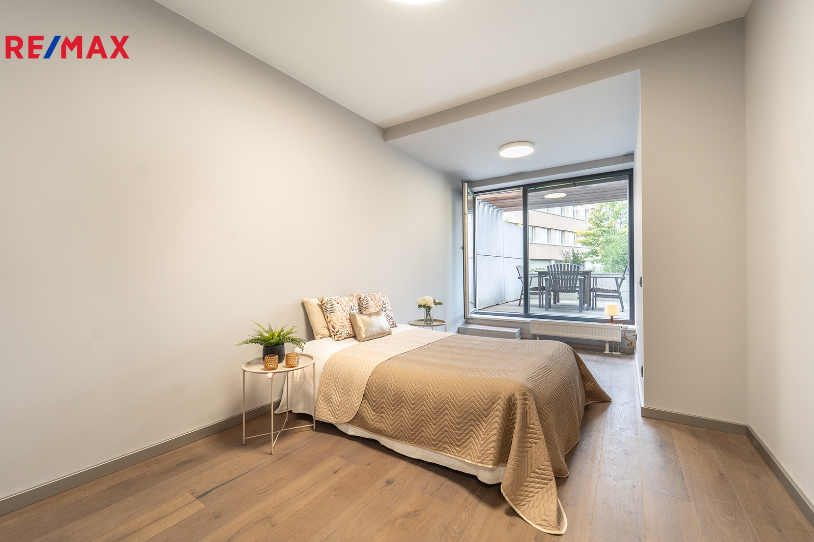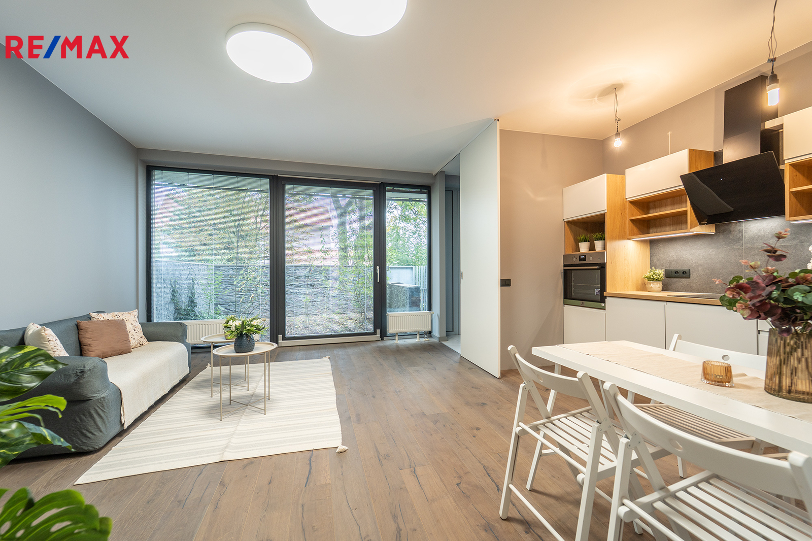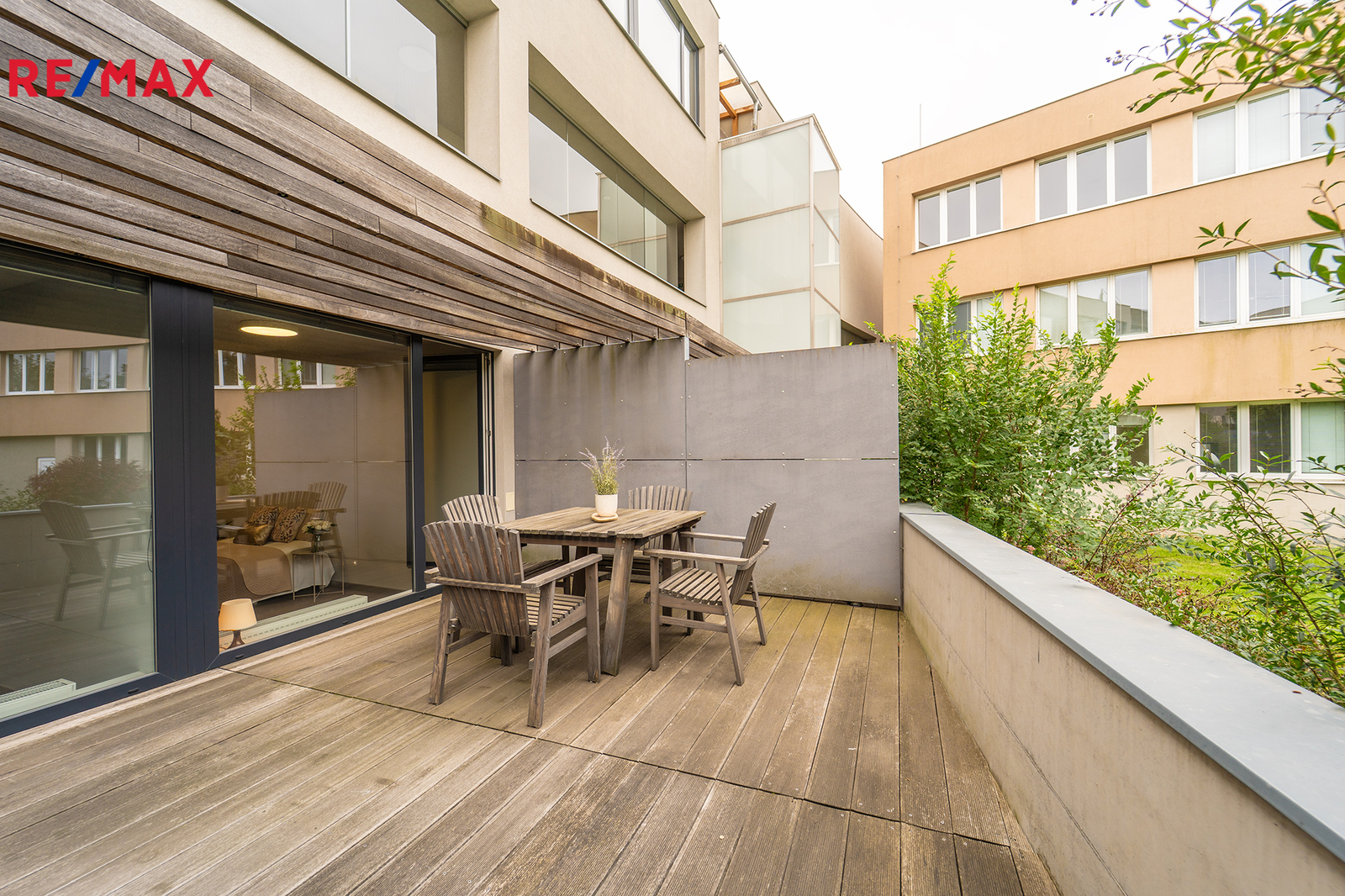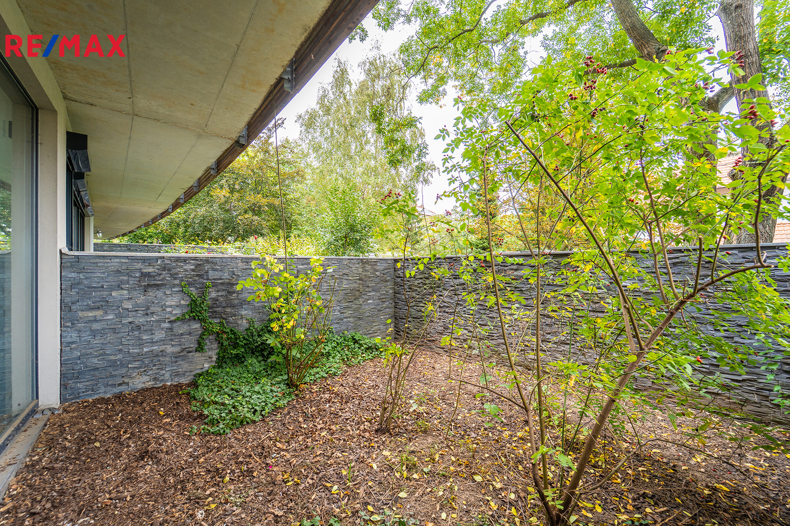 Nabízíme Vám ke koupi bytovou jednotku v perfektním stavu o celkové užitné ploše 65,6 m2 + soukromá předzahrádka o velikosti 29m2 + uzavřená terasa o velikosti 19,1 m2 + sklepní kóje 0,8 m2 a privátní garážové parkovací stání s vlastním vchodem do bytu přes předzahrádku. Byt, nacházející se v 1. nadzemním podlaží skeletového domu, se skládá z obývacího pokoje s kuchyňským koutem se vstupem na předzahrádku, dvou ložnic se vstupem na terasu, předsíně, koupelny, toalety a chodby.
