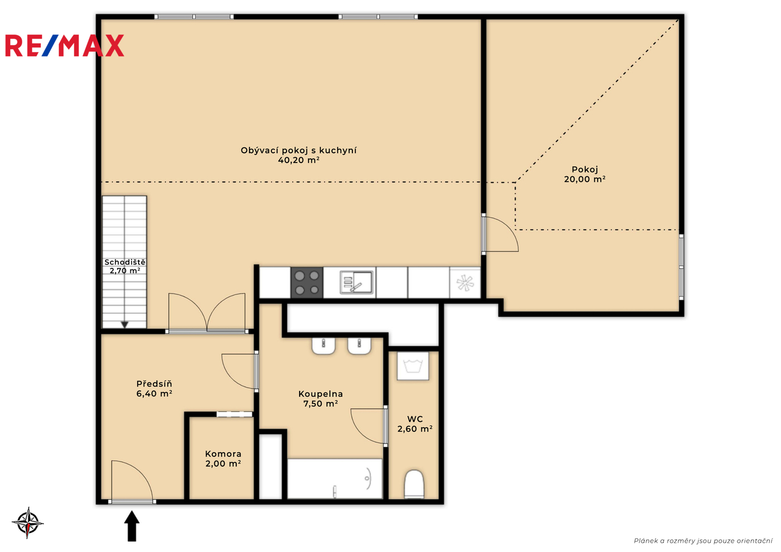 Součástí tohoto podlaží je také samostatný pokoj, koupelna a WC. Obojí prošlo kompletní rekonstrukcí na konci roku 2025, stejně jako vstupní chodba.