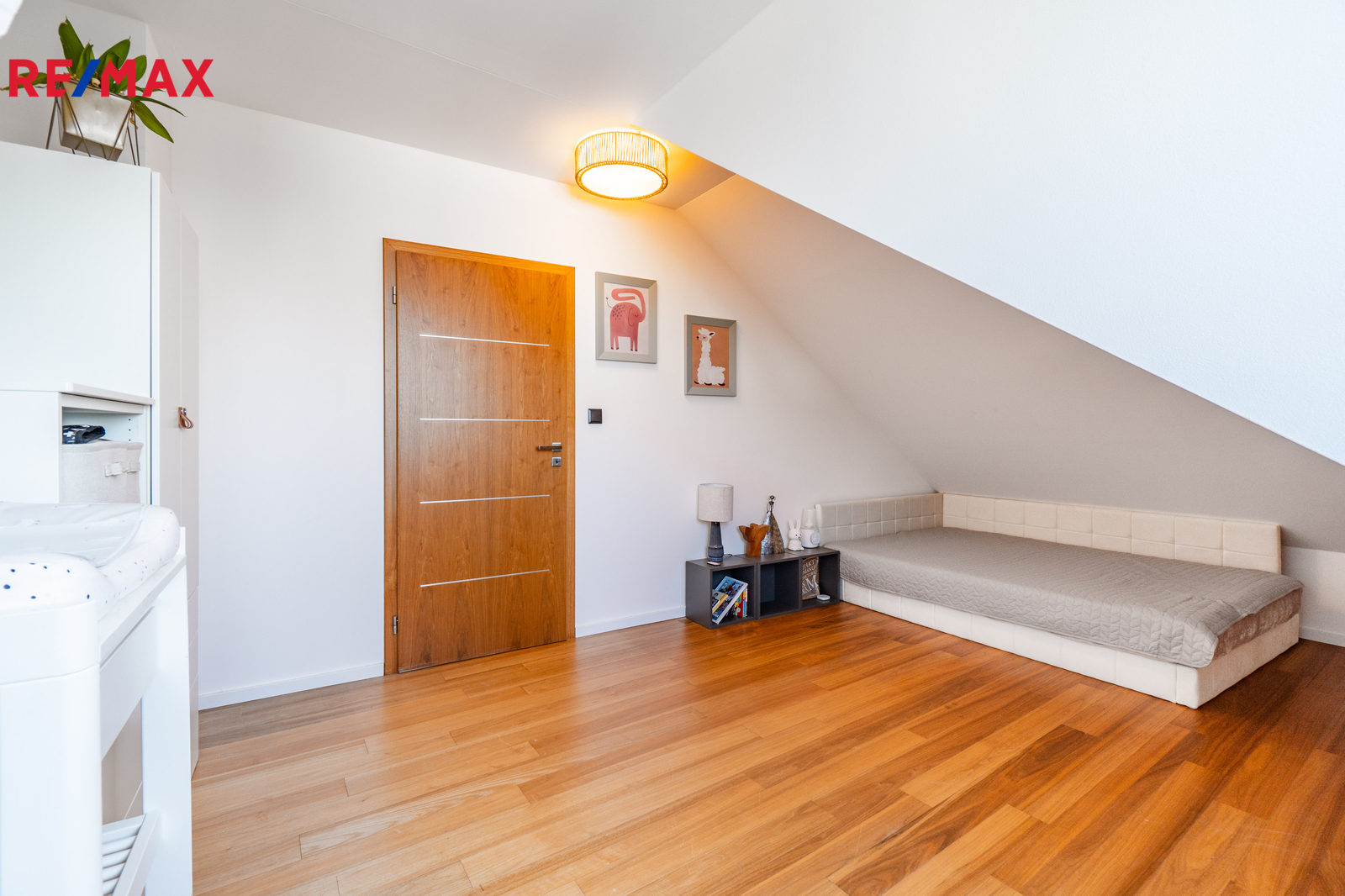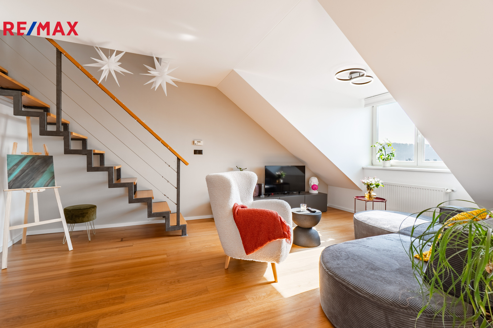 Horní patro nabízí vzdušnou ložnici se střešními okny, která dodává bytu charakter a pocit většího prostoru, než jaký bývá u klasických dispozic.