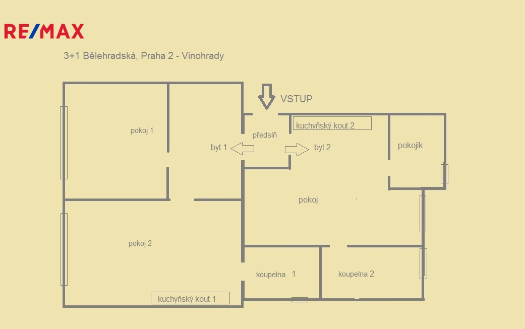 Plánek najdete u fotografií, které ukazují byt s nábytkem - opravdu tak, jak bude vybavený předán novému majiteli. Je zde nejen nová elektřina, rozvody vody, ale také 2 obývací pokoje se 2 kuchyňskými kouty, 2 koupelny s novou sprchou a WC, 2 ložnice, šatna, předsíň a navíc sklep v přízemí domu. Lze užívat samozřejmě i jako jeden velký byt.