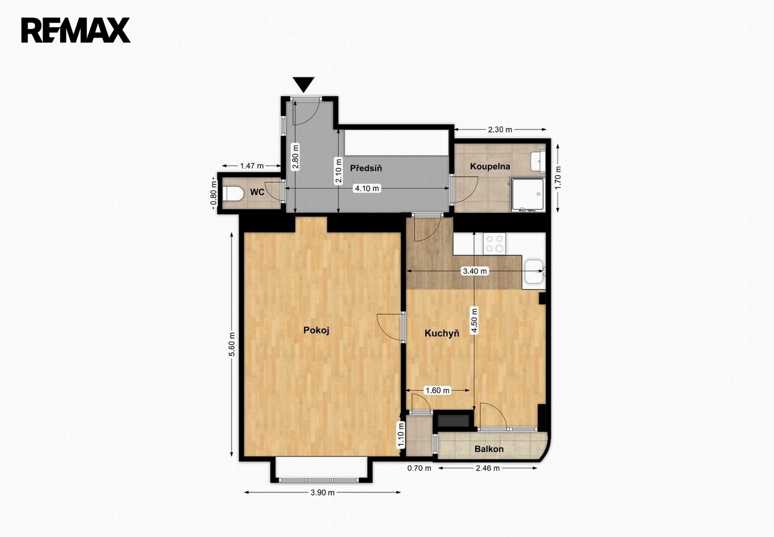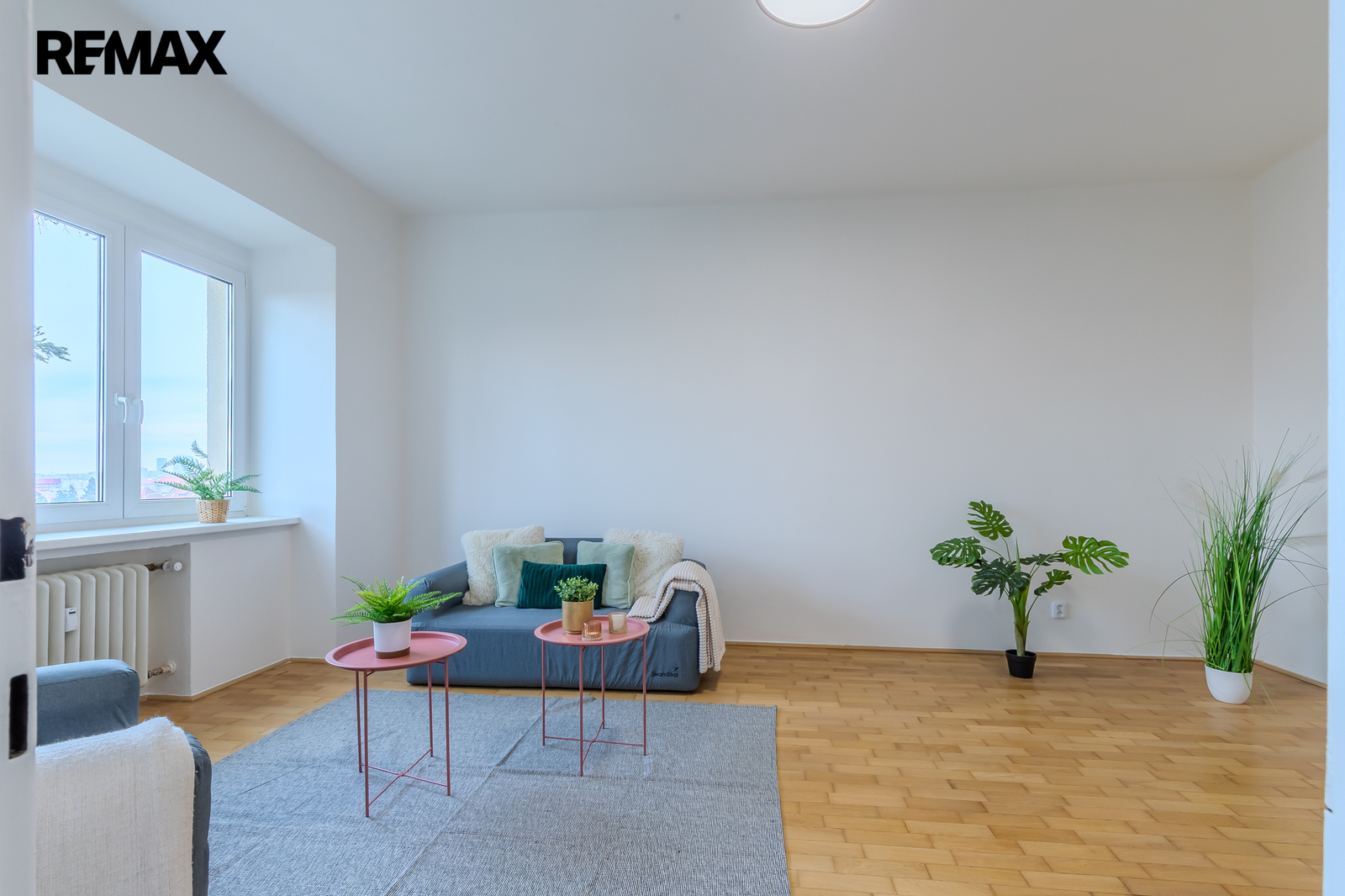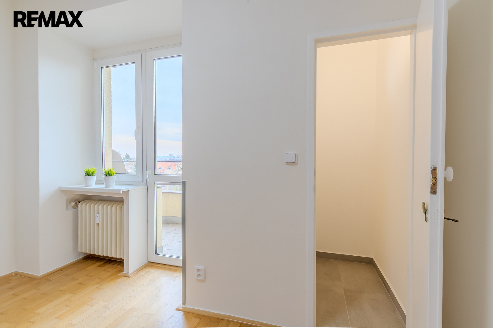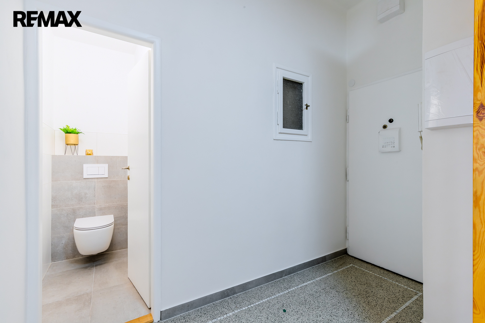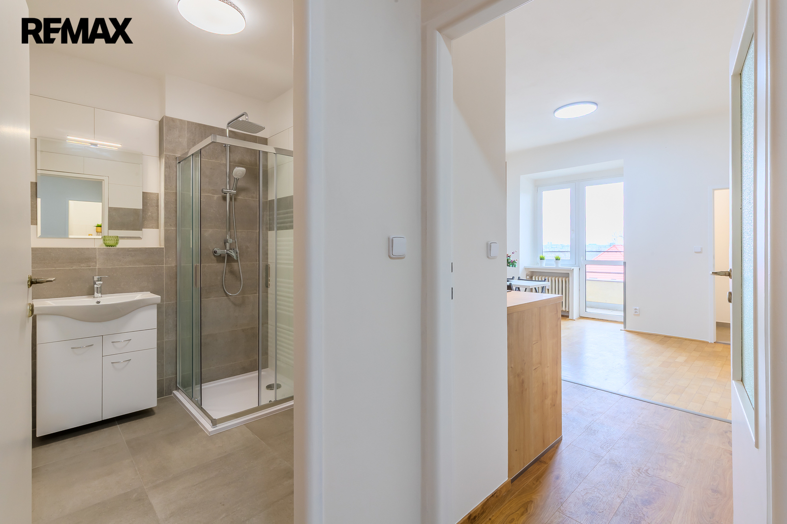 Dispozice dále nabízí samostatný, prostorný pokoj (cca 21,8 m²), který lze využít jako ložnici či hlavní obytný prostor. Z kuchyně je vstup na balkon (cca 3 m²) s příjemným výhledem do okolí. Praktickým benefitem je také komora / spíž (cca 0,8 m²), která nabízí další úložný prostor. Koupelna (cca 3,9 m²) je nově vybudovaná se sprchovým koutem, samostatná toaleta (cca 2,6 m²) je oddělená. Velkým benefitem bytu je prostorná vstupní chodba s nadstandardním úložným prostorem (cca 12,5 m²).