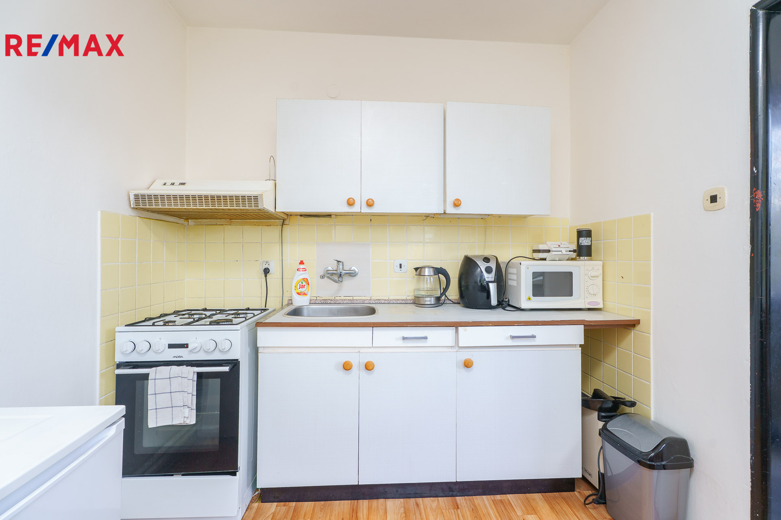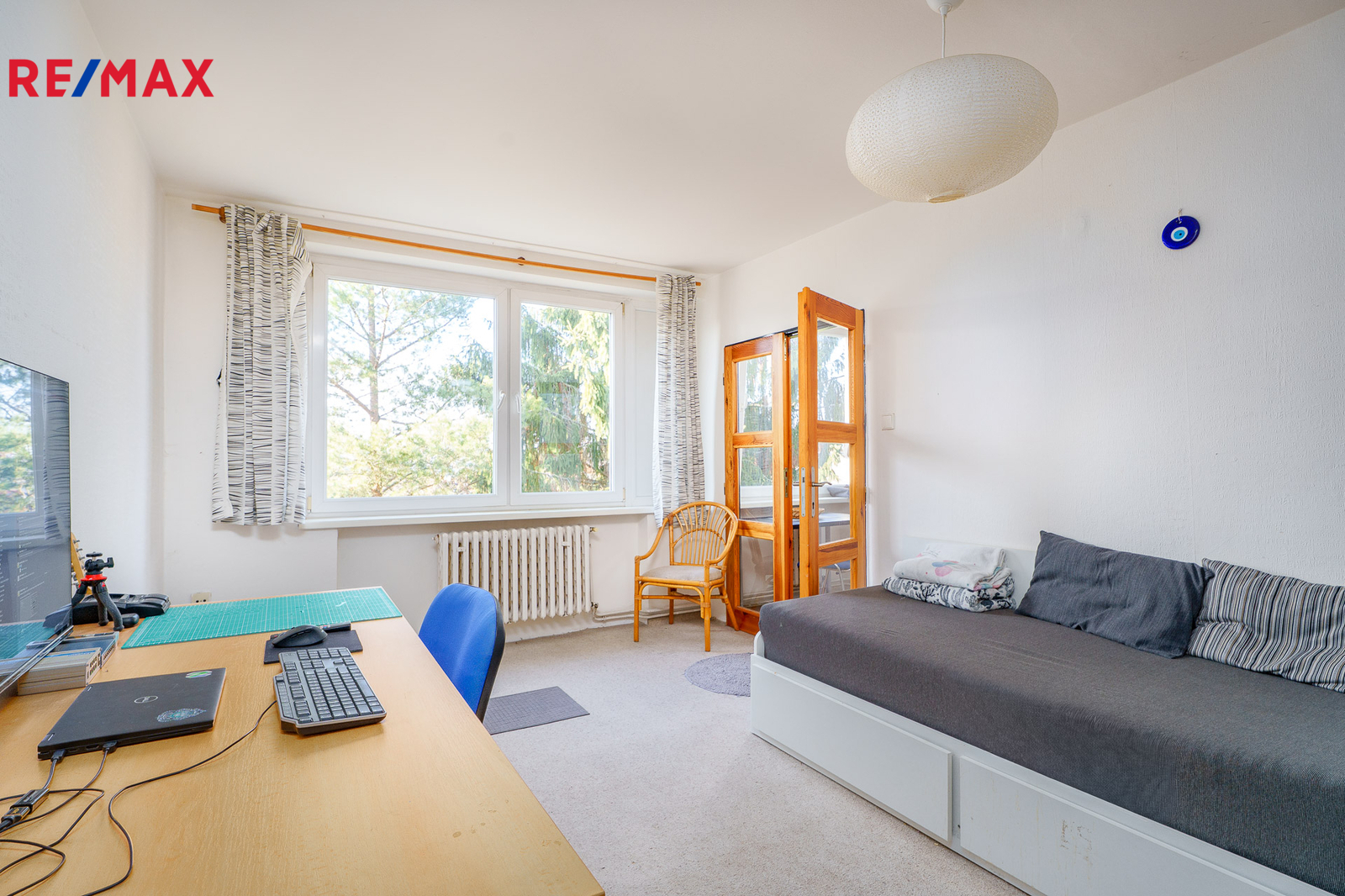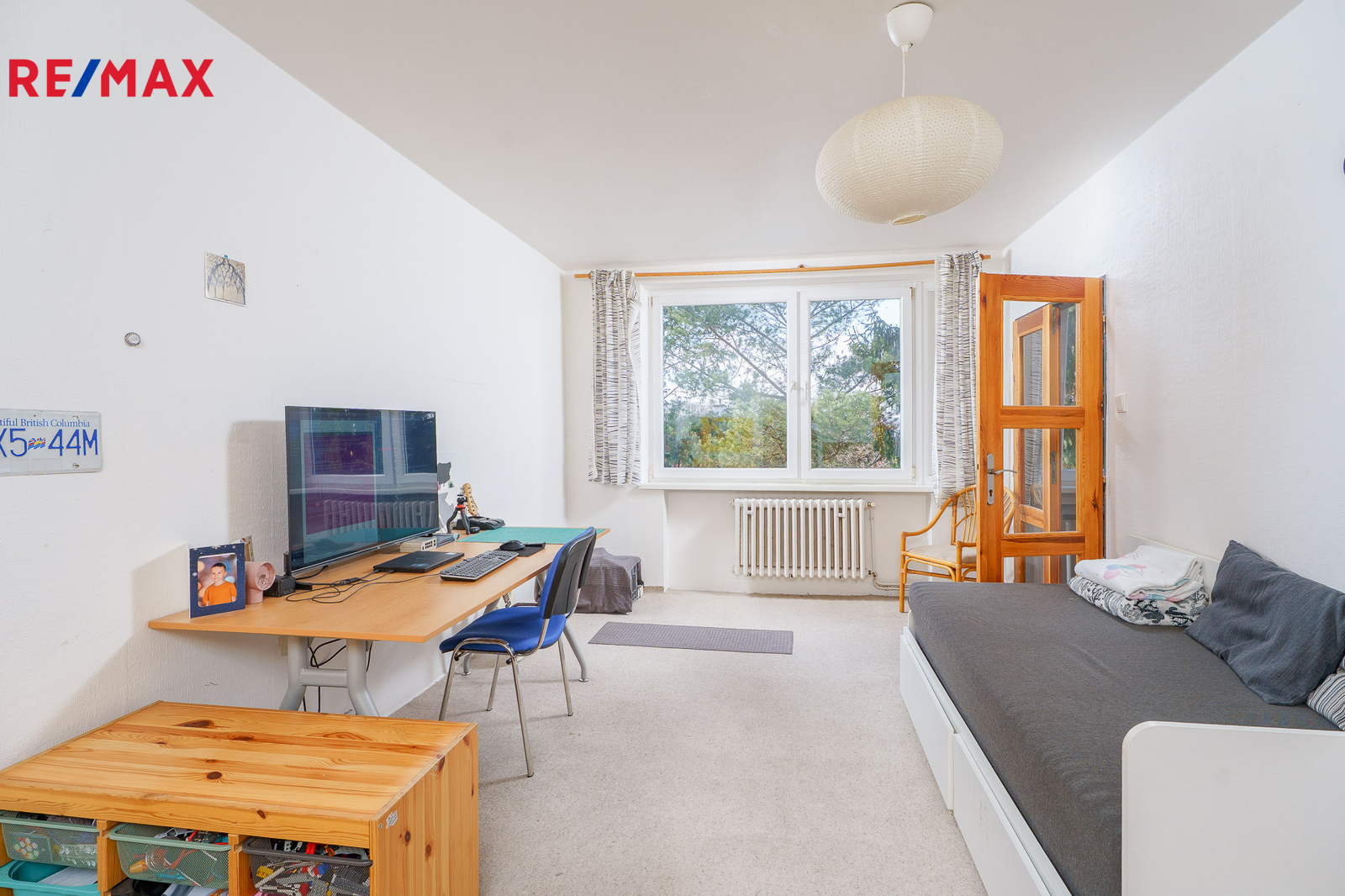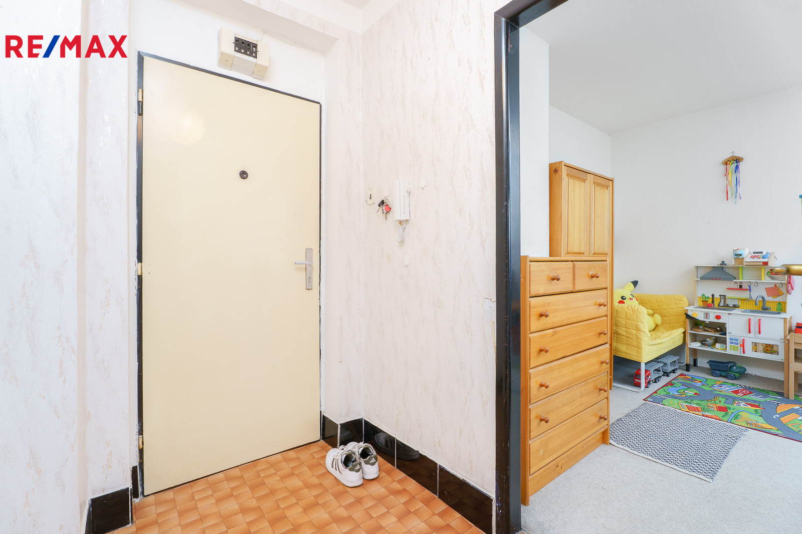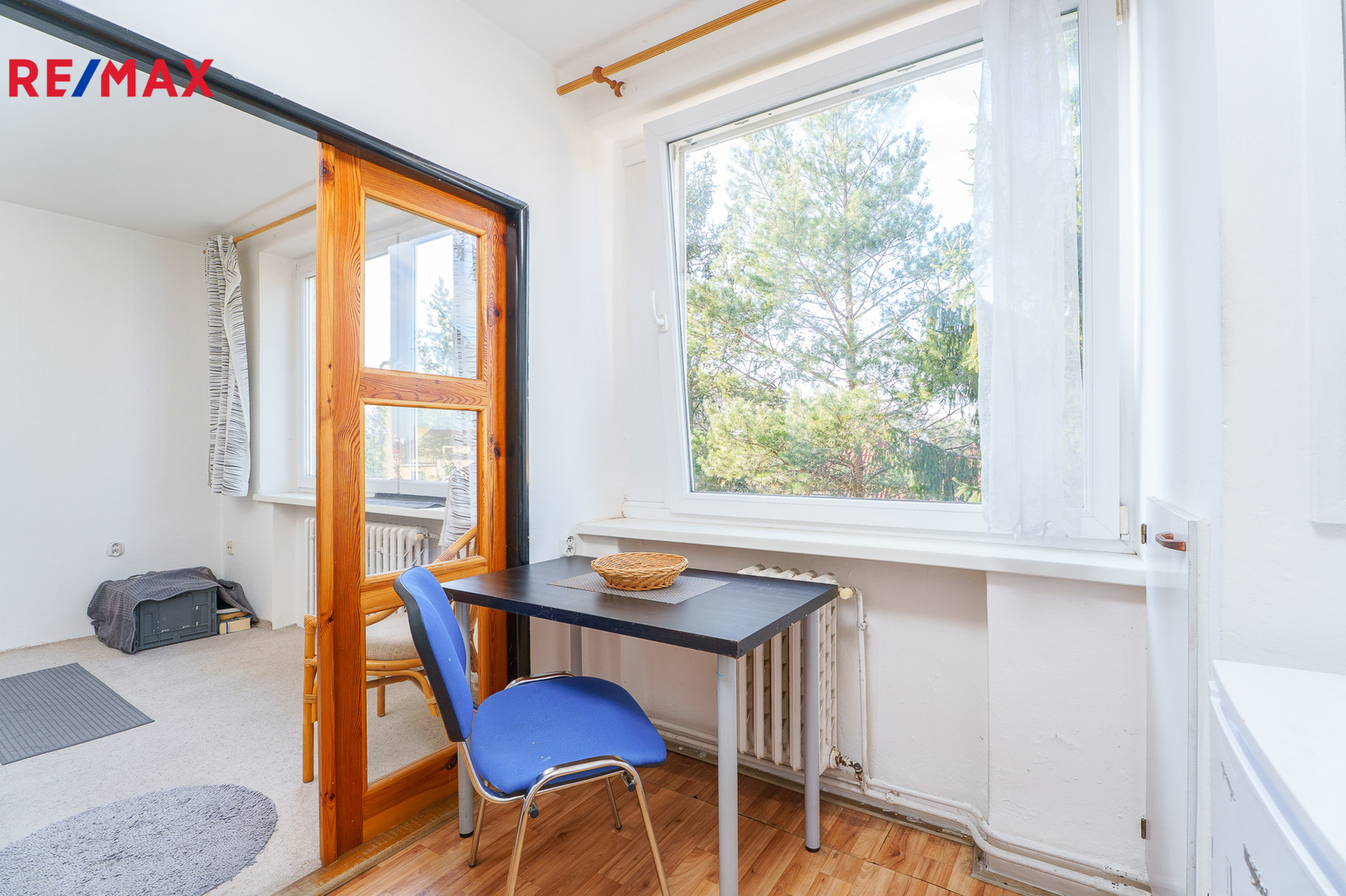 Západně orientovaný byt nabízí vstupní chodbu s komorou, která je zároveň i technickou místností s plynovým kotlem. Vlastní plynový kotel vytápí byt a zjišťuje teplou vodu nezávisle na zdrojích dálkového tepla, jak tomu bývá na velkých sídlištích. Dále WC a koupelna s vanou a umyvadlem. Velký obývací pokoj umožňuje prostorové řešení i pro spaní. Navazuje kuchyně s původní kuchyňskou linkou, vestavěnou spíží i místem pro jídelní stůl. K bytu náleží sklep.