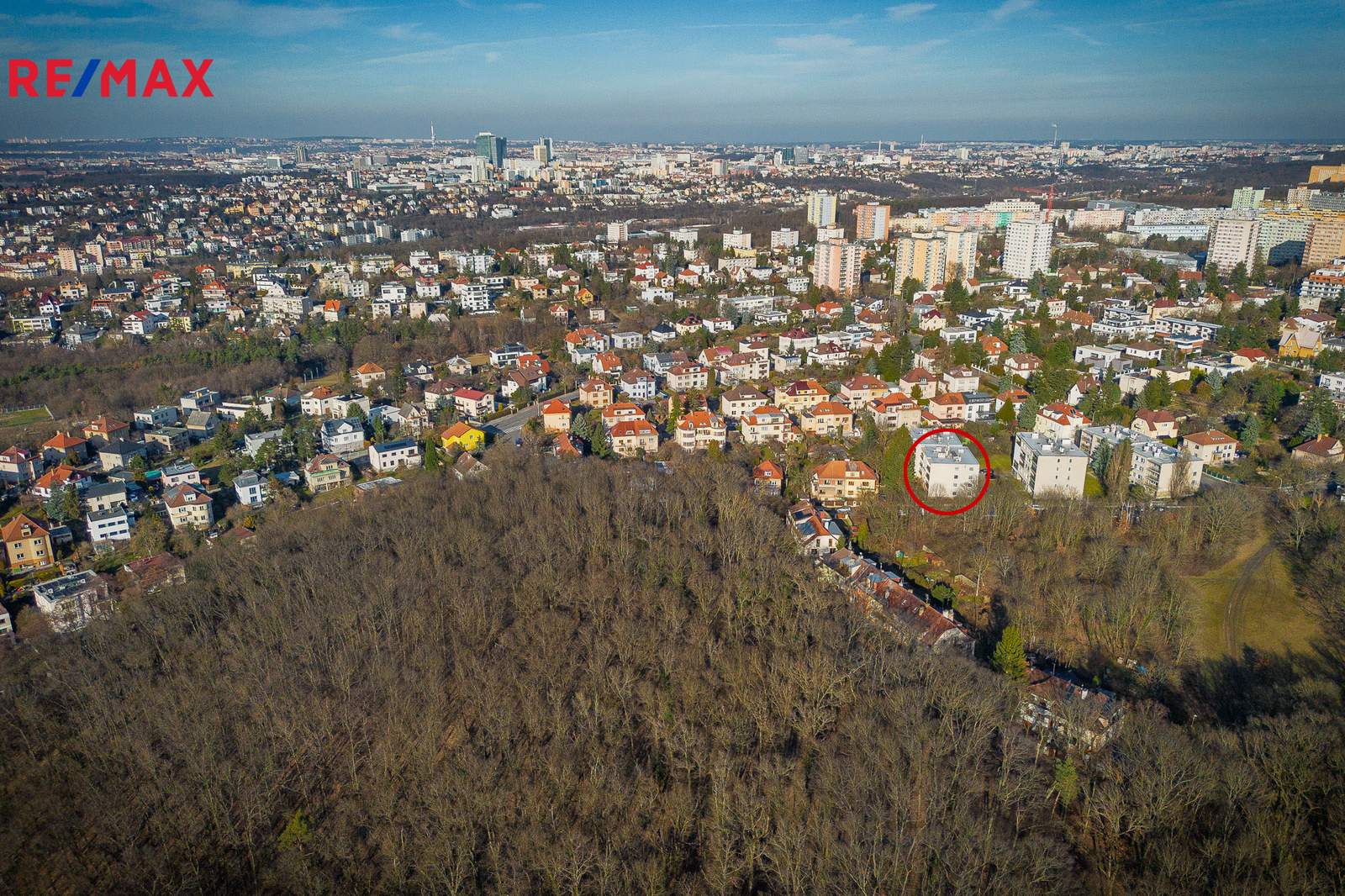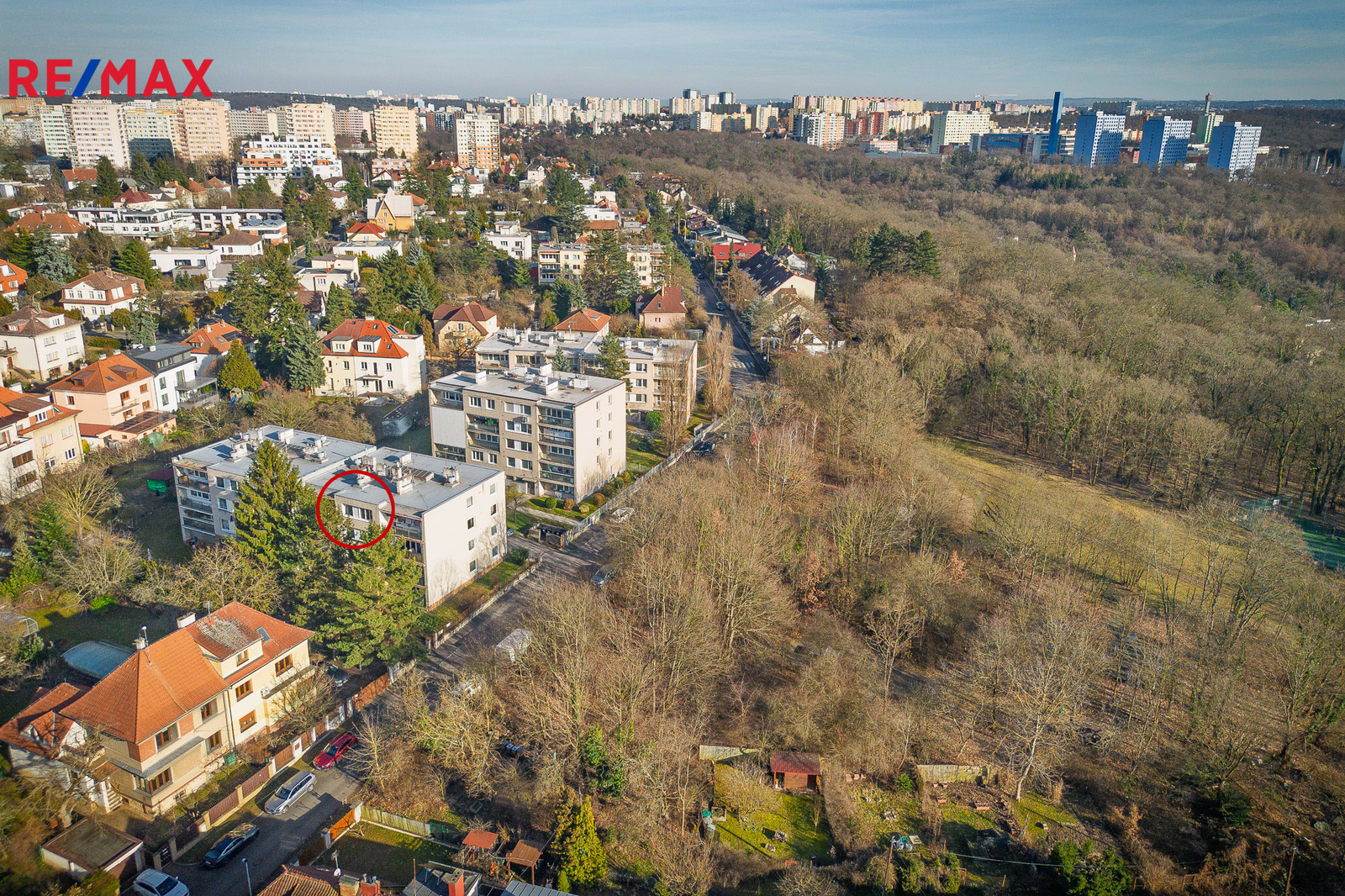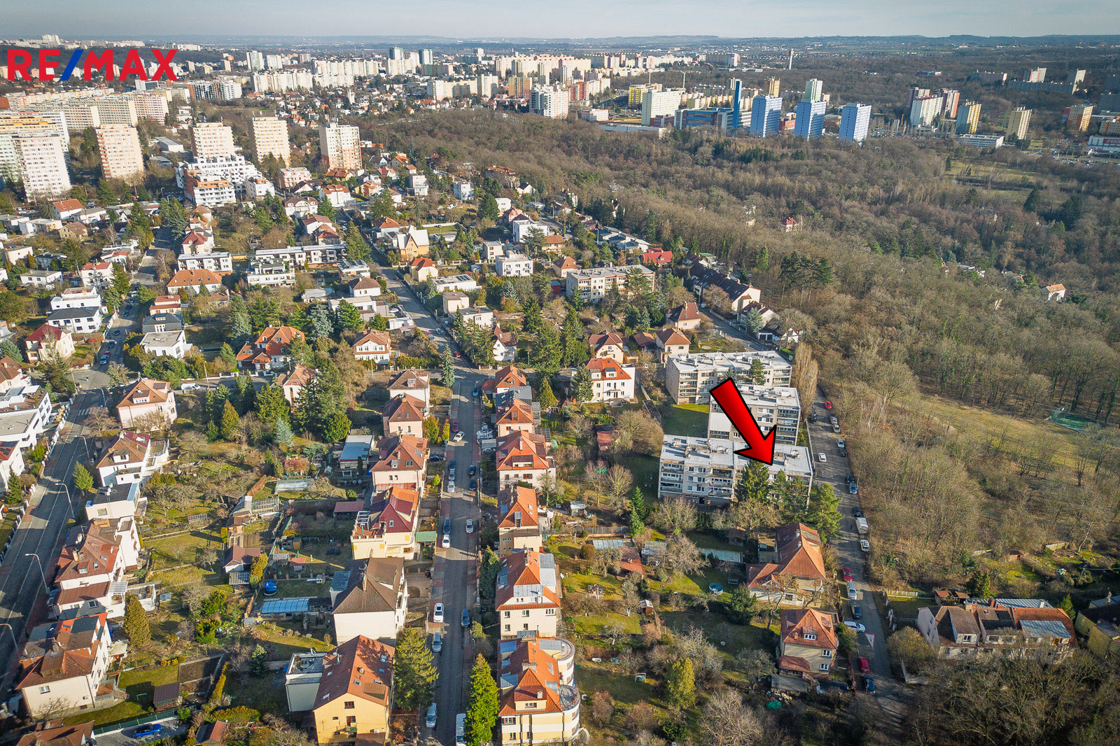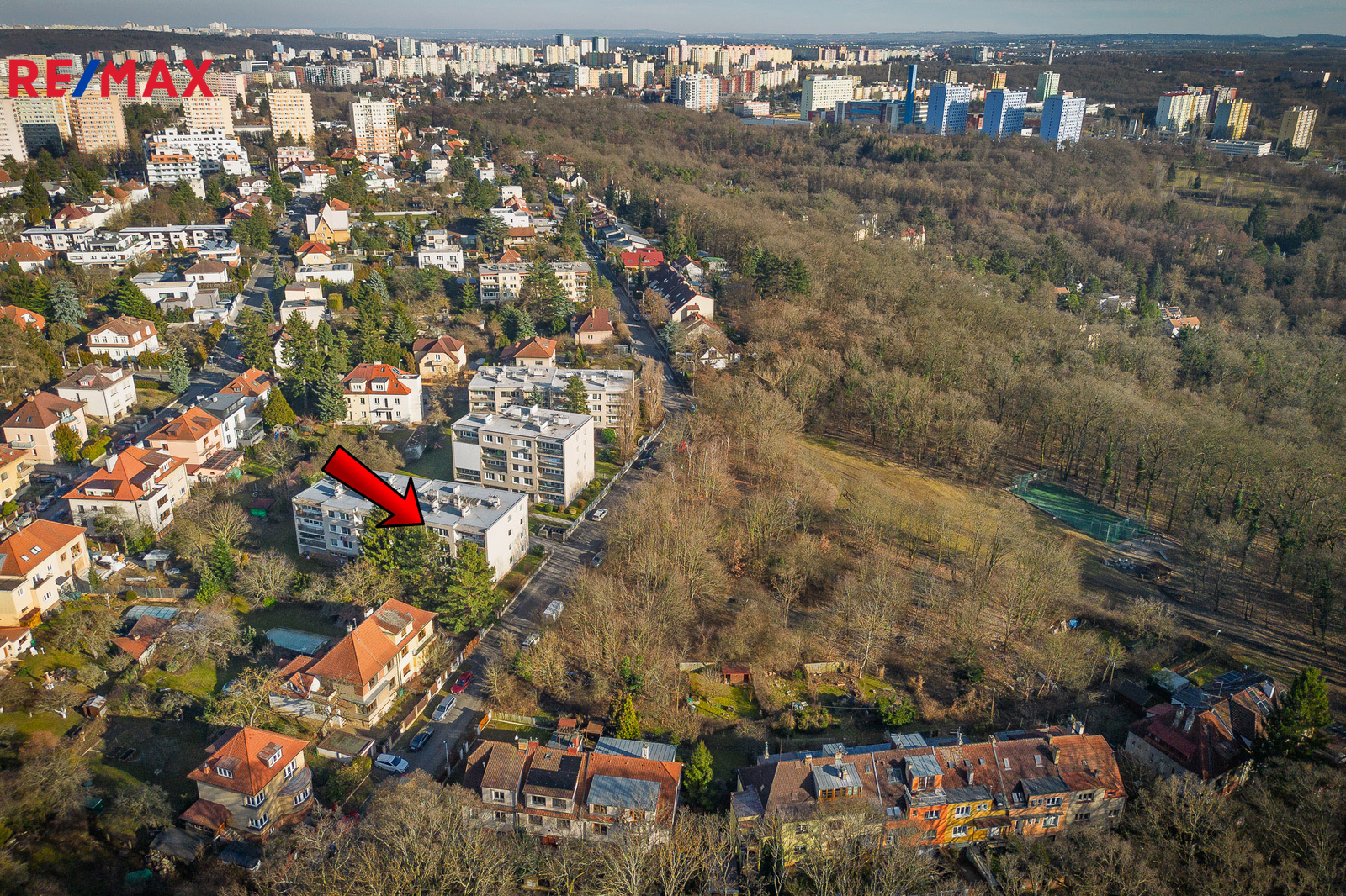 Klidný čtyřpodlažní dům na vlastním oploceném pozemku a s pouze 10 byty prakticky přiléhá k místnímu lesoparku se sportovištěm a dětským hřištěm.