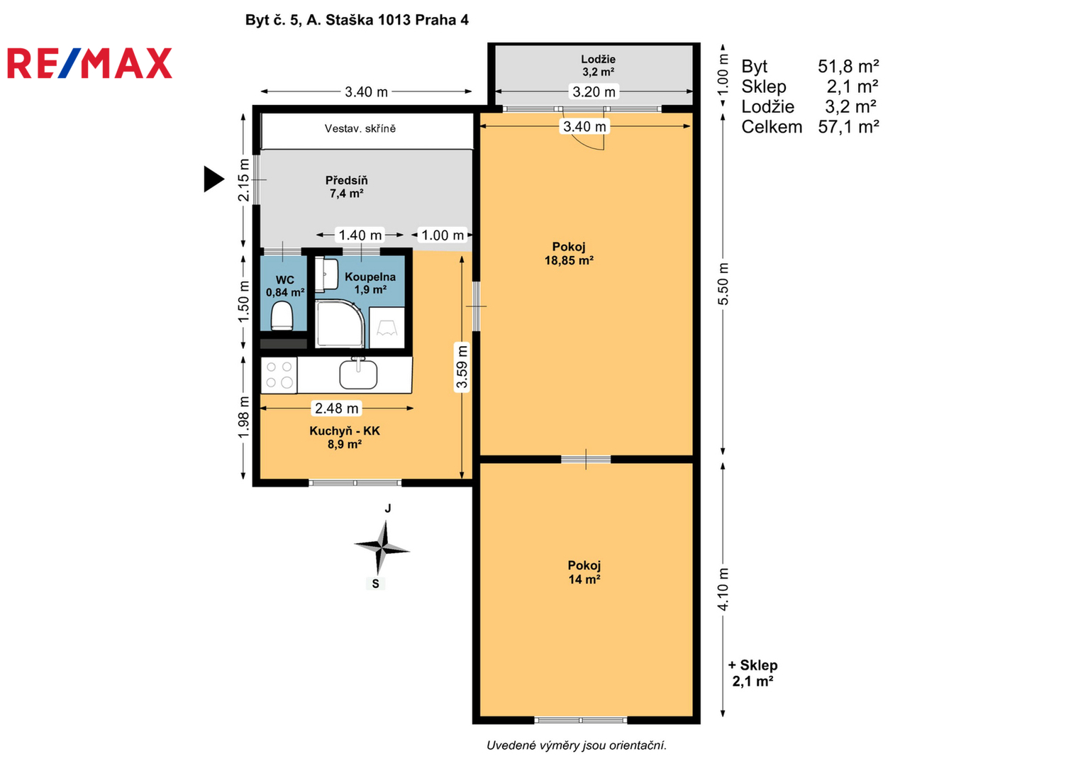 Výměry: 51,8m² byt + 3,2m² lodžie + 2,1m² sklep = celkem 57,1m². V suterénu je kryt CO, na kterém má vlastník bytu spoluvlastnický podíl.