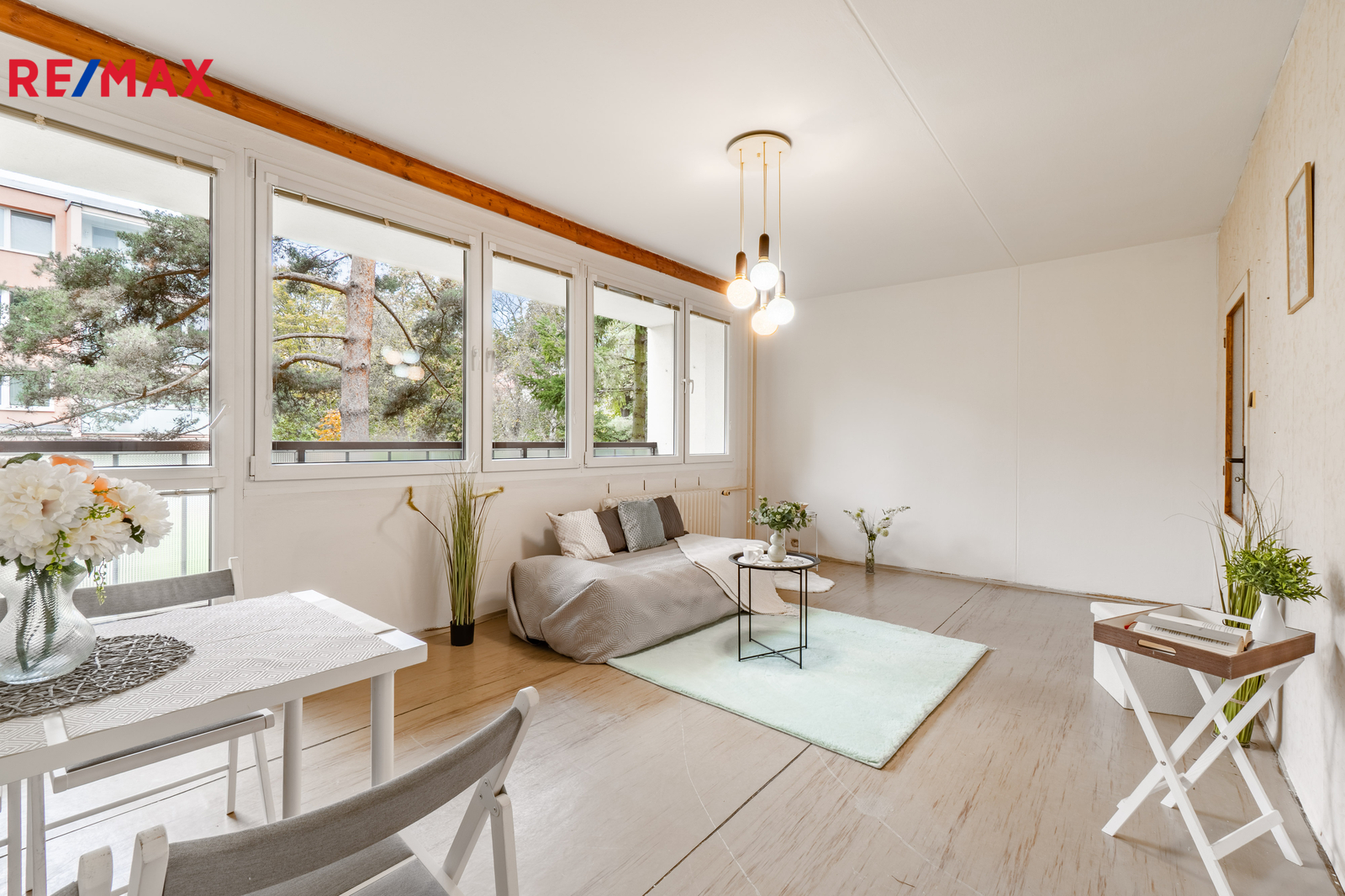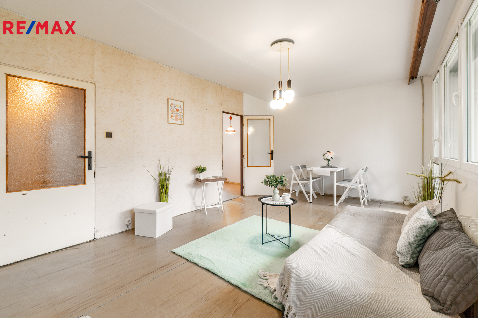 Byt je v původním, udržovaném stavu a nabízí tak skvělou příležitost k rekonstrukci dle vlastních představ. Dispozice je velmi praktická – obývací pokoj se vstupem na prostornou lodžii, samostatná kuchyně, dvě ložnice, koupelna, samostatné WC a sklep. Díky umístění v 1. patře a příjemné orientaci je byt světlý, tichý a působí vzdušným dojmem.