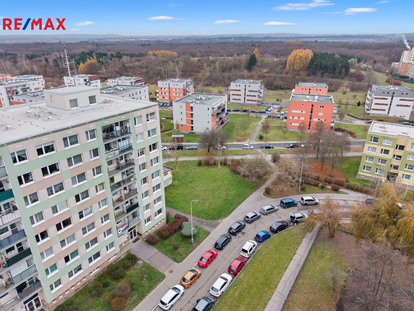 Parkování je volné u domu a v okolí je dostatek zeleně.