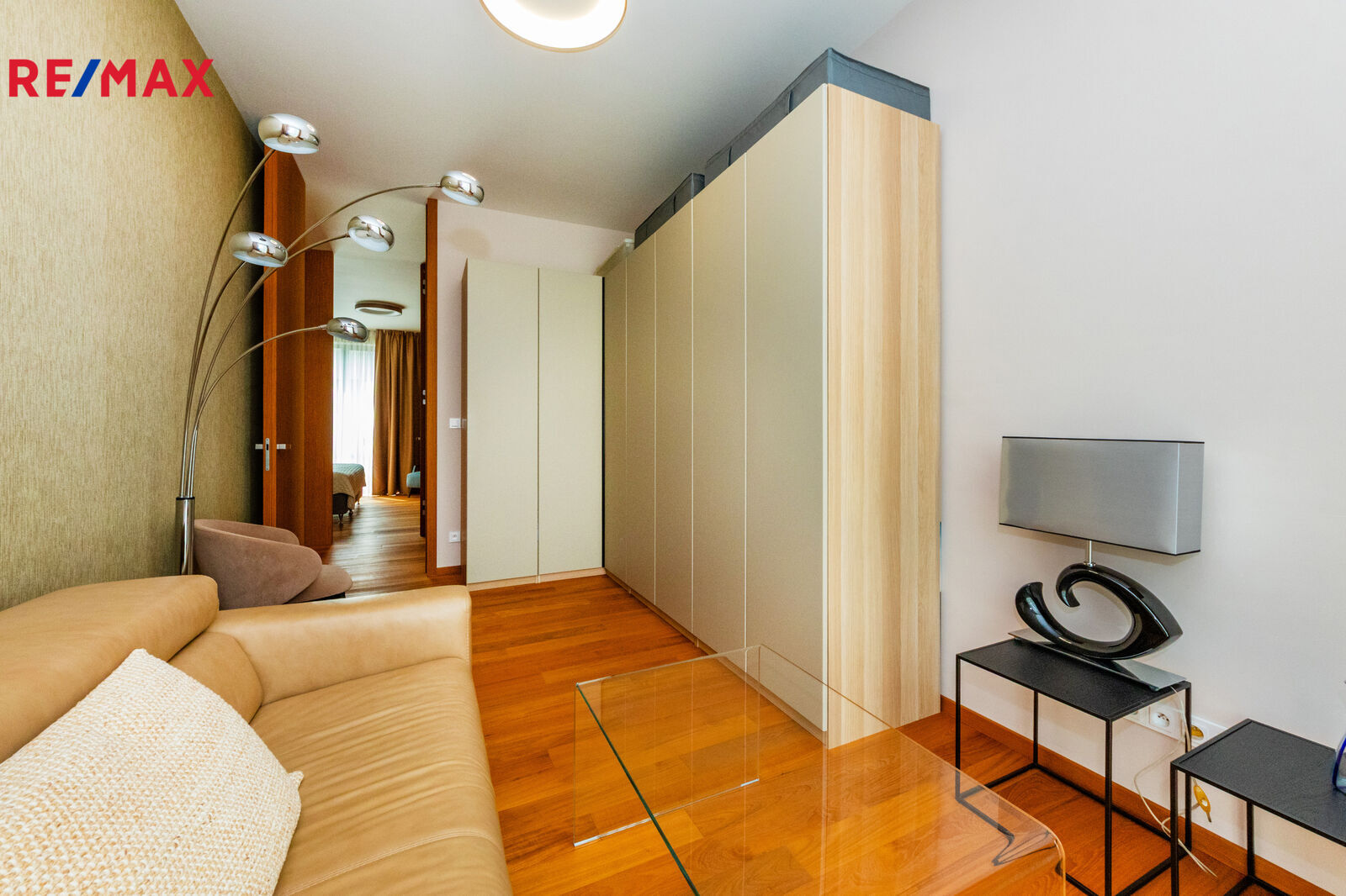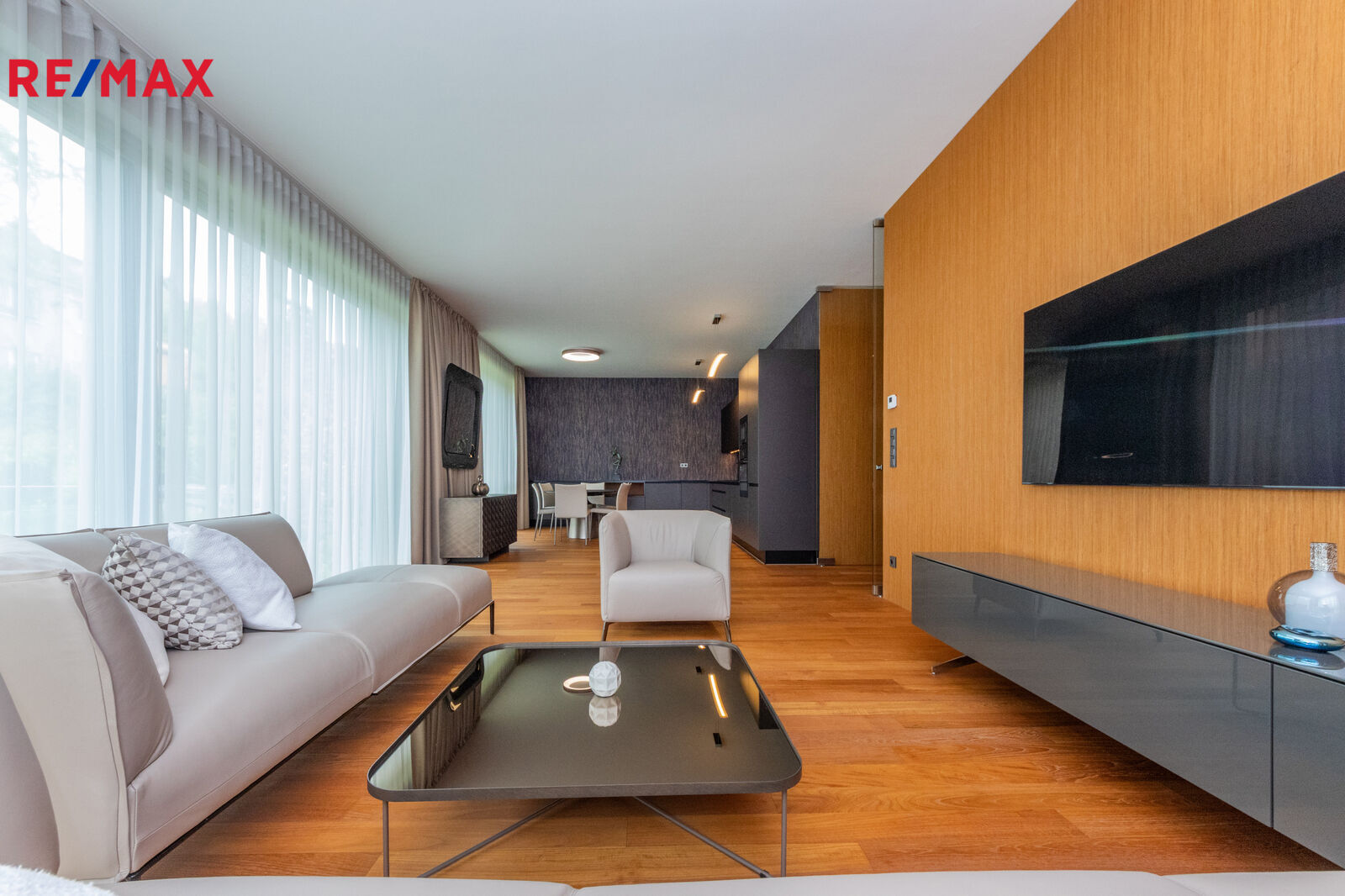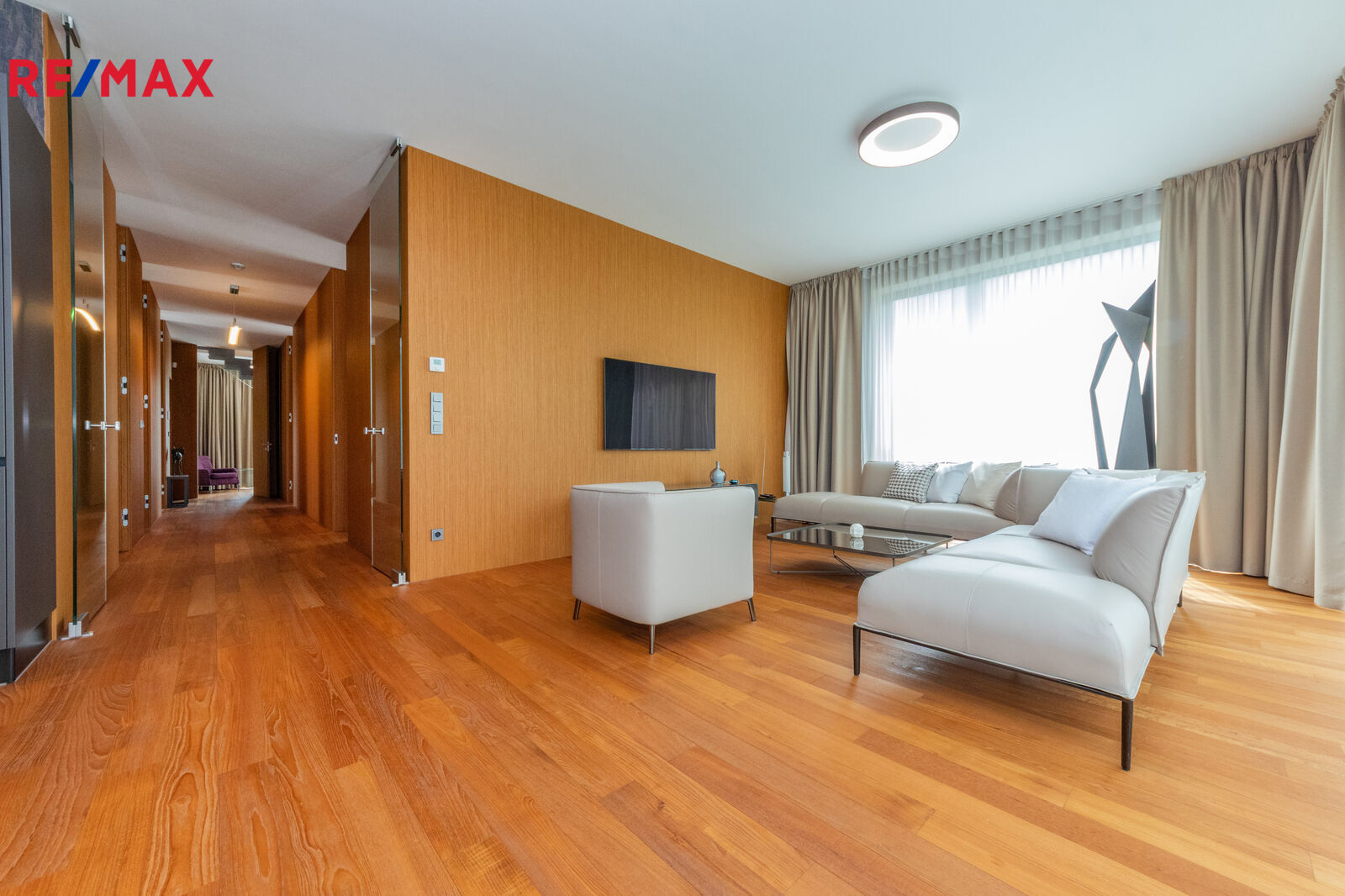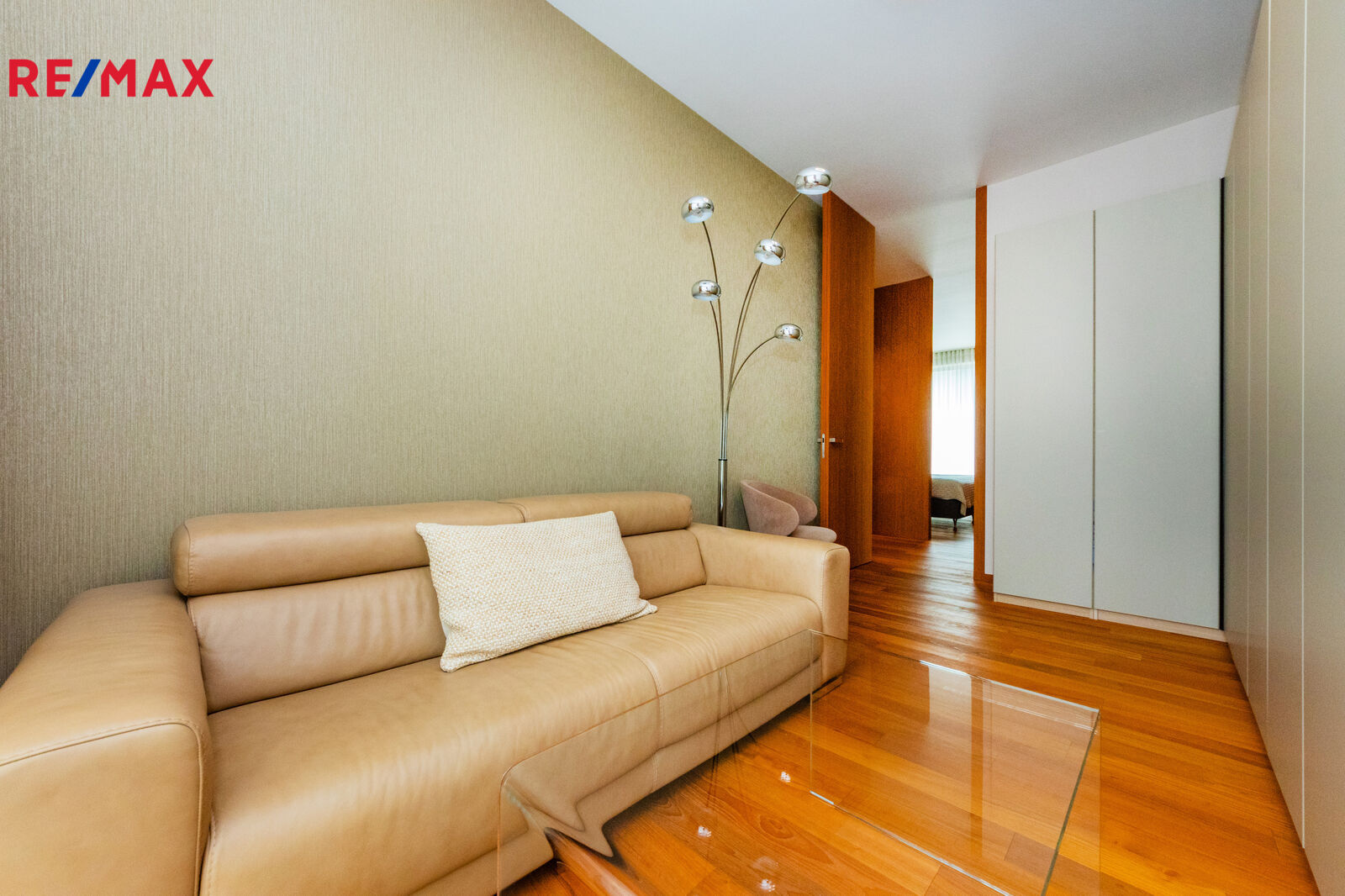 Také vybavení bytu pochází od renomovaných výrobců, například sedací soupravy Natuzzi, komoda Cattelan, postele Hülsta nebo závěsy a záclony ve špičkové kvalitě.