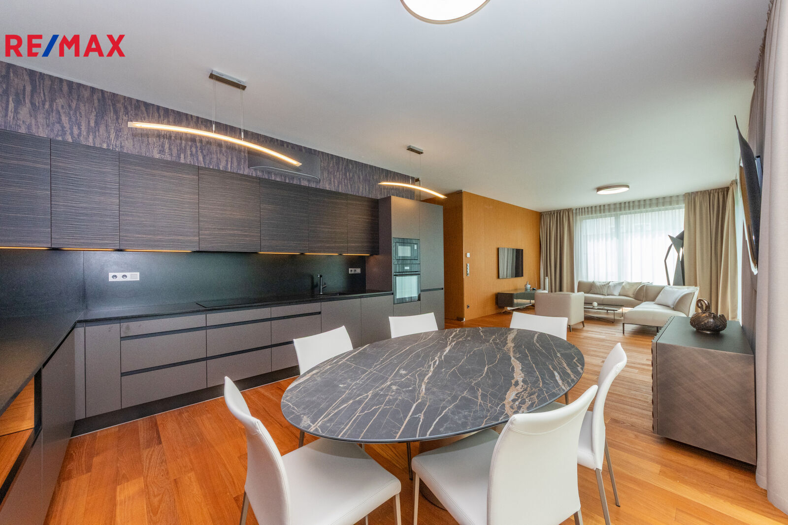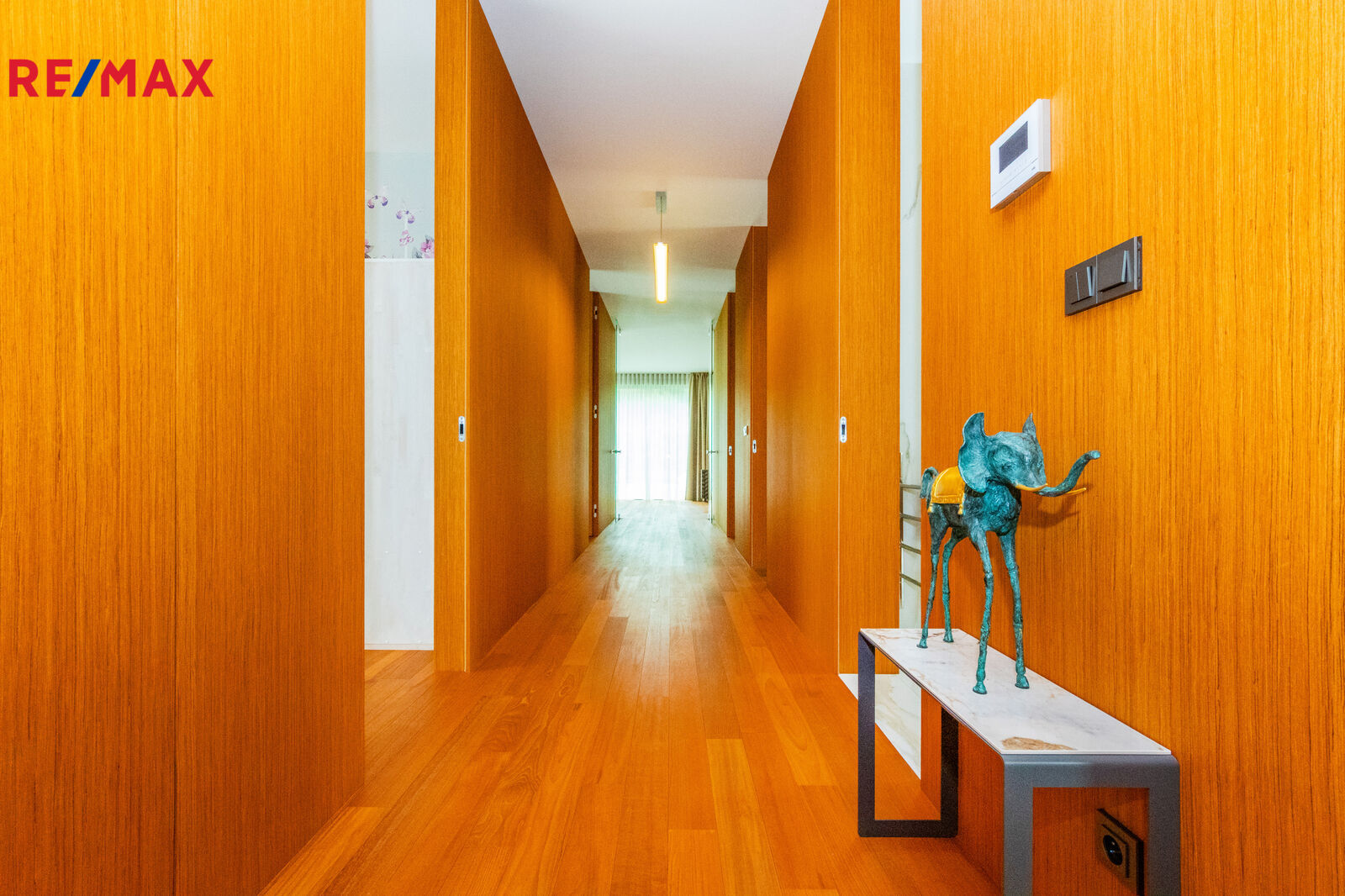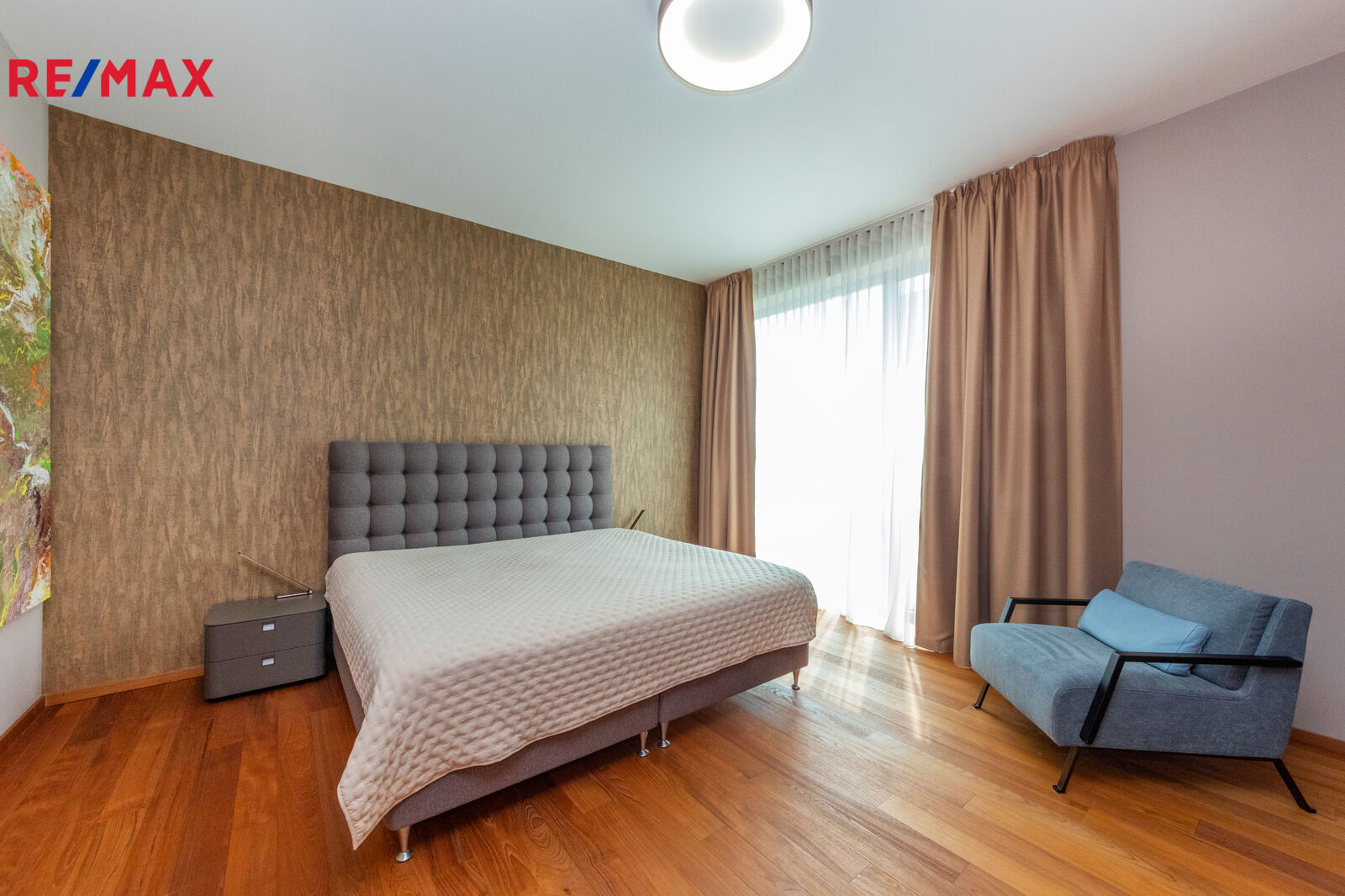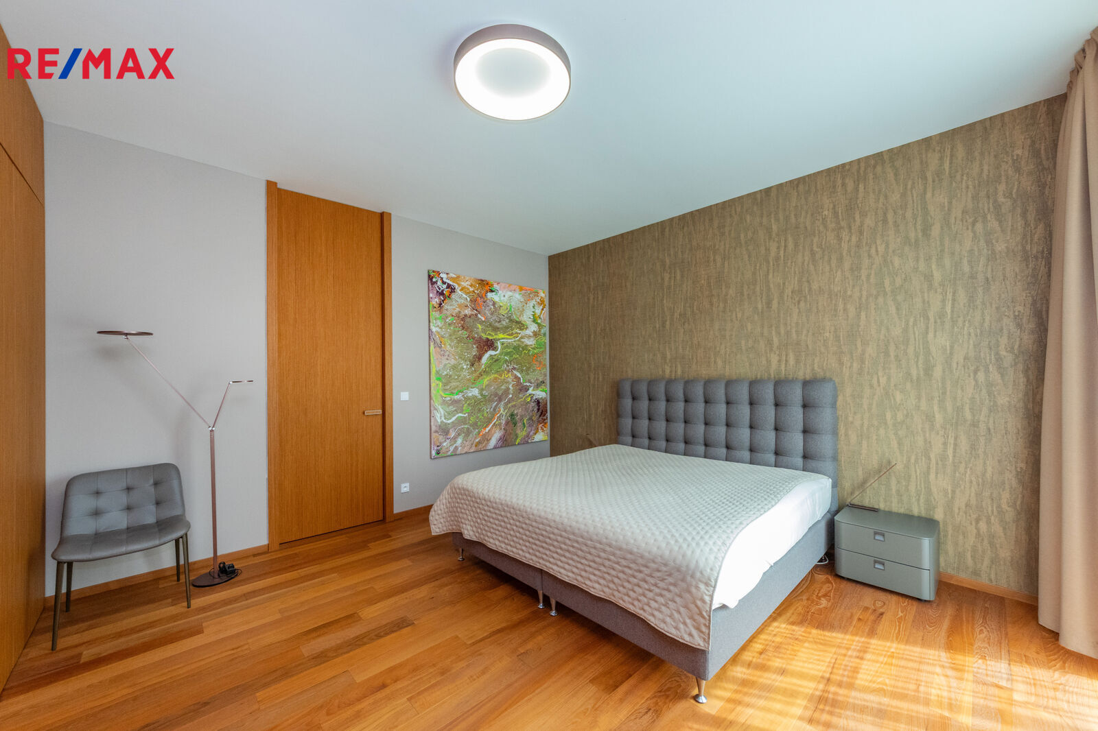 Také vybavení bytu pochází od renomovaných výrobců, například sedací soupravy Natuzzi, komoda Cattelan, postele Hülsta nebo závěsy a záclony ve špičkové kvalitě.