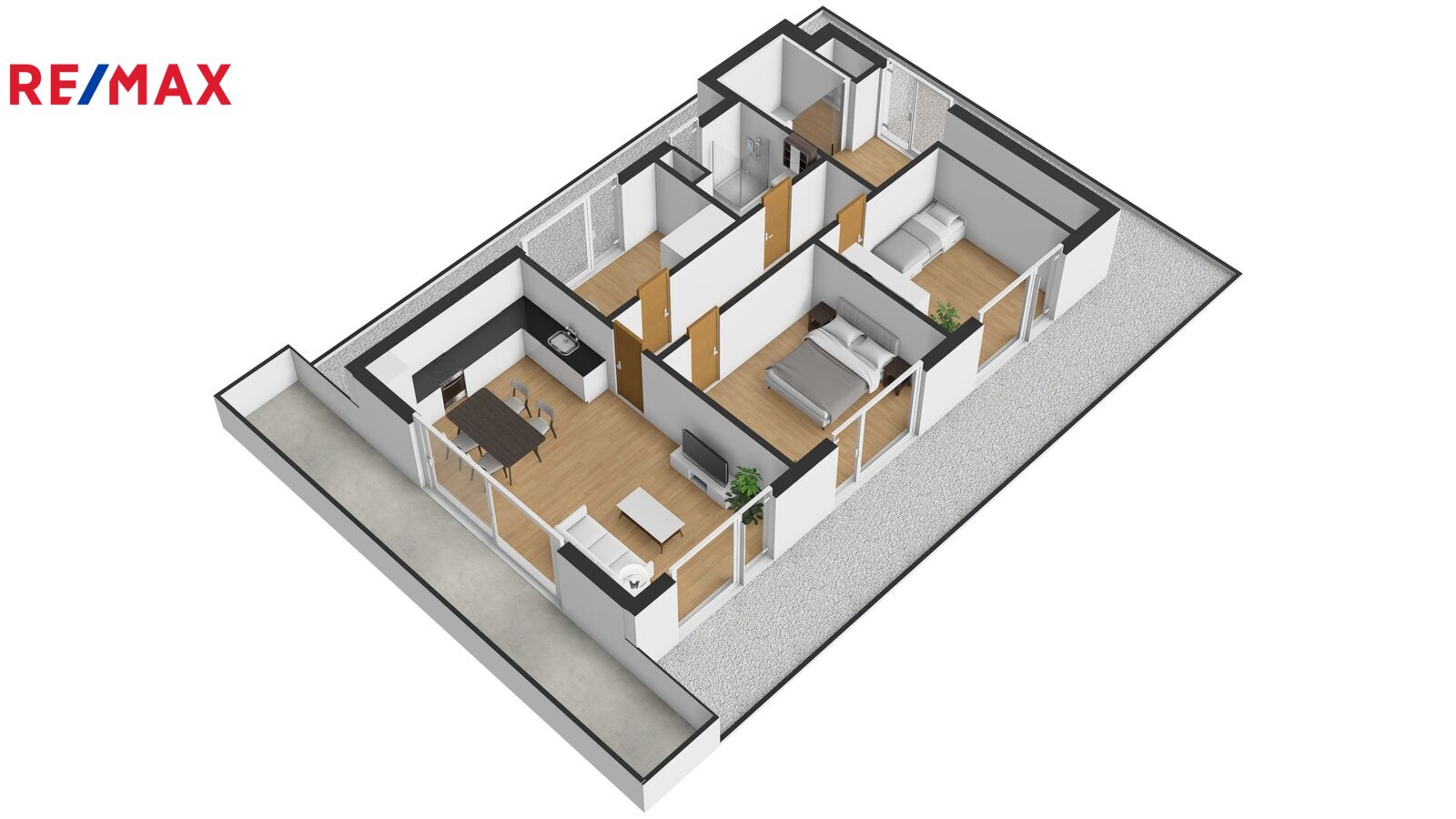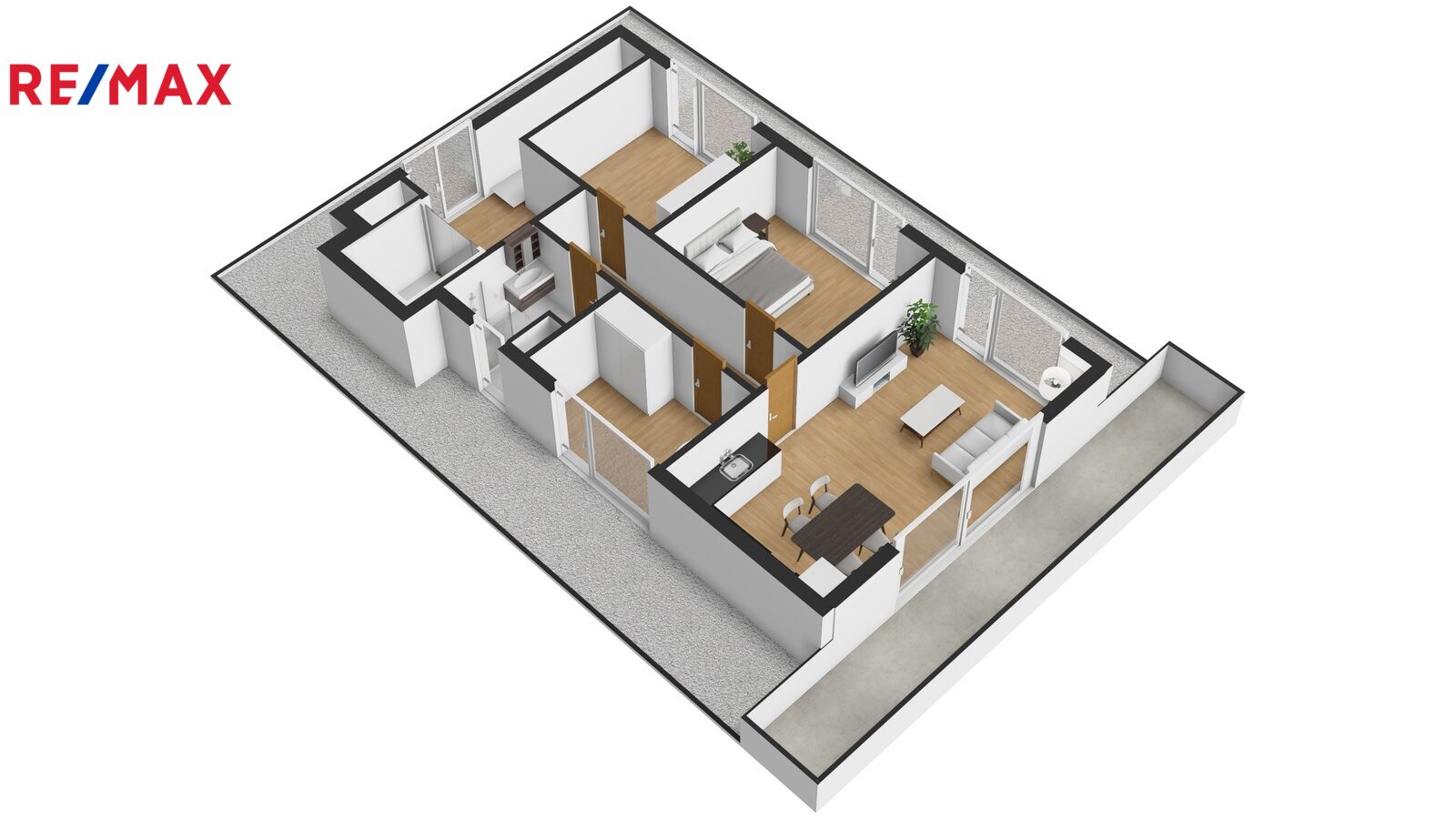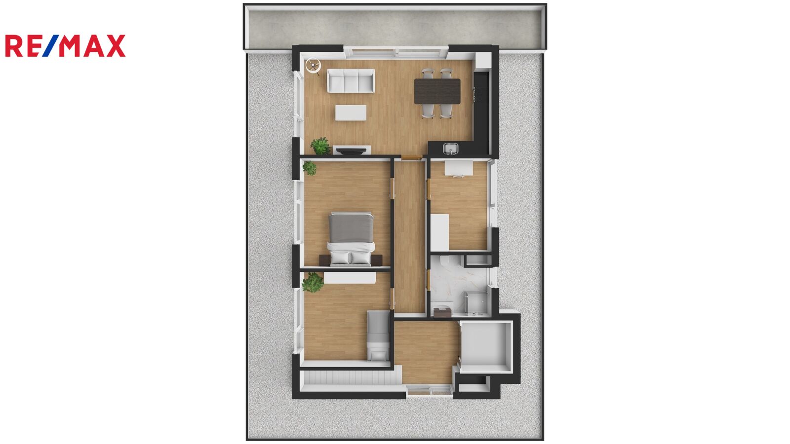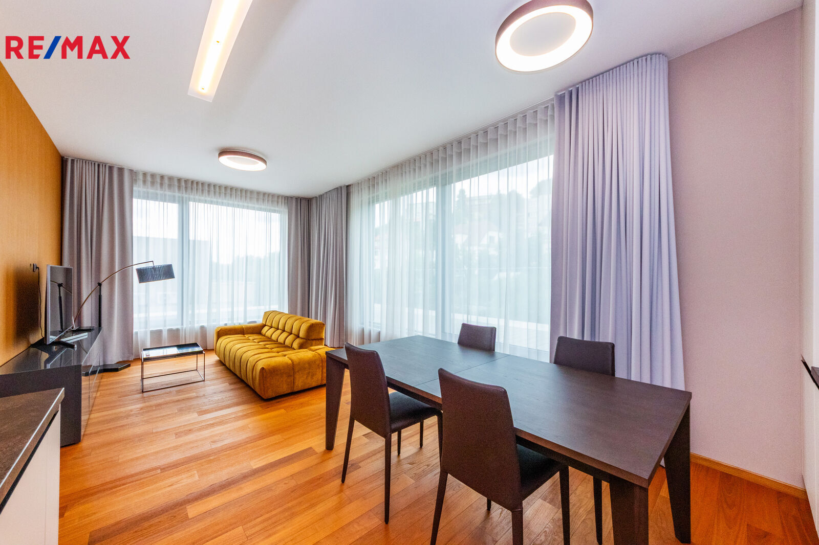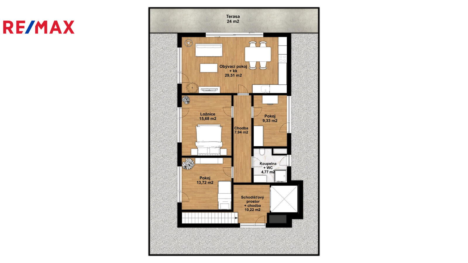 Dispozice jednotky 4+kk v 5. NP zahrnuje obývací pokoj s kuchyňským koutem a výstupem na terasu o výměře 24 m², ložnici, dva pokoje a chodbu.