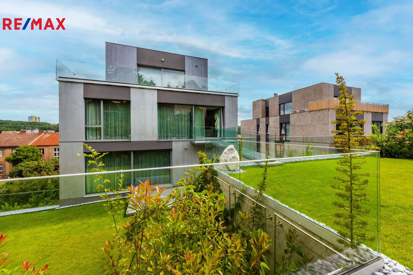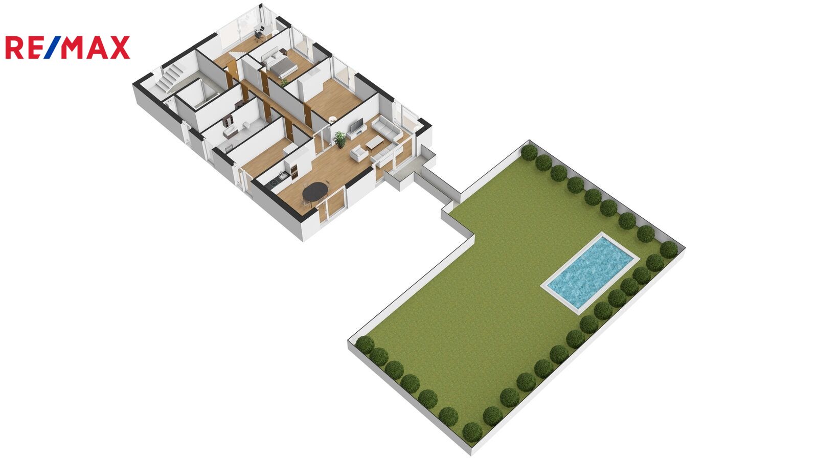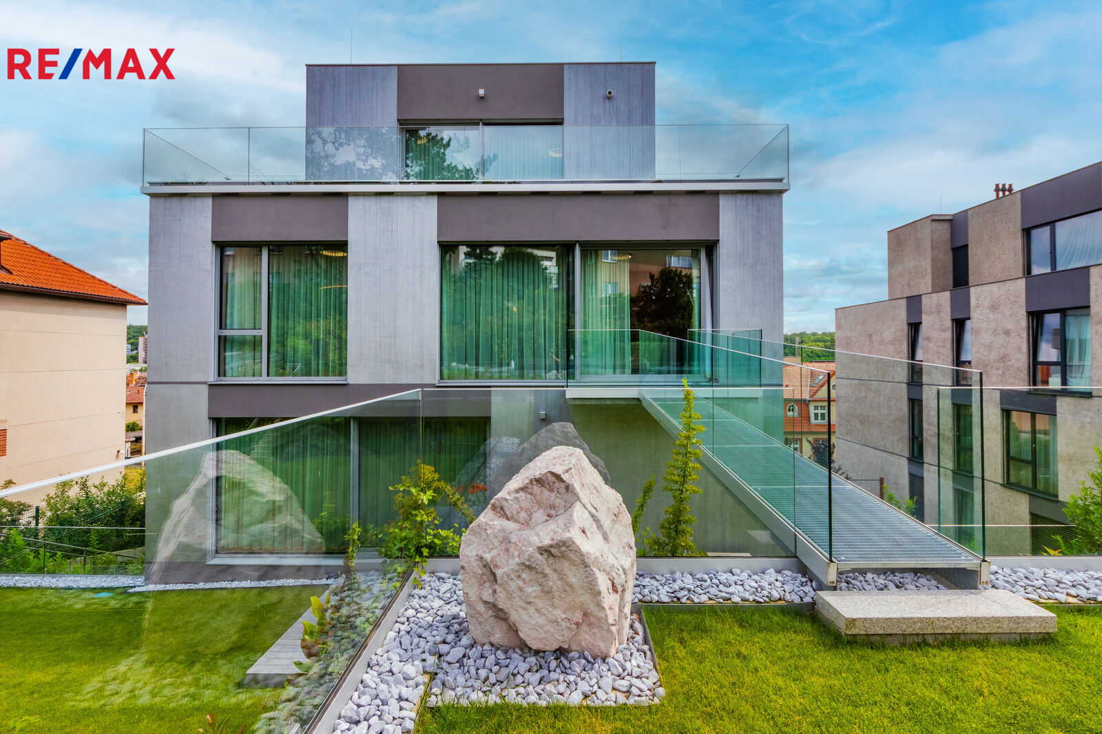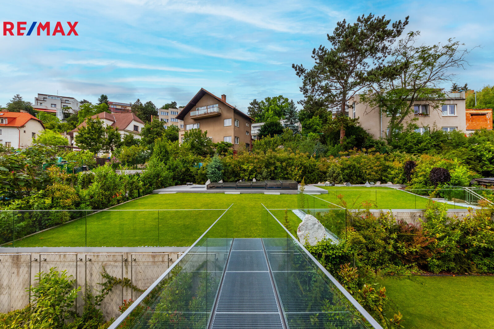 Součástí prodeje je architektonicky řešená zahrada o ploše 290 m² s automatickou závlahou a vzrostlými stromy, bazén se zastřešením, tři parkovací stání (z toho dvě uvnitř domu a jedno na pozemku) a sklep o výměře 6 m².