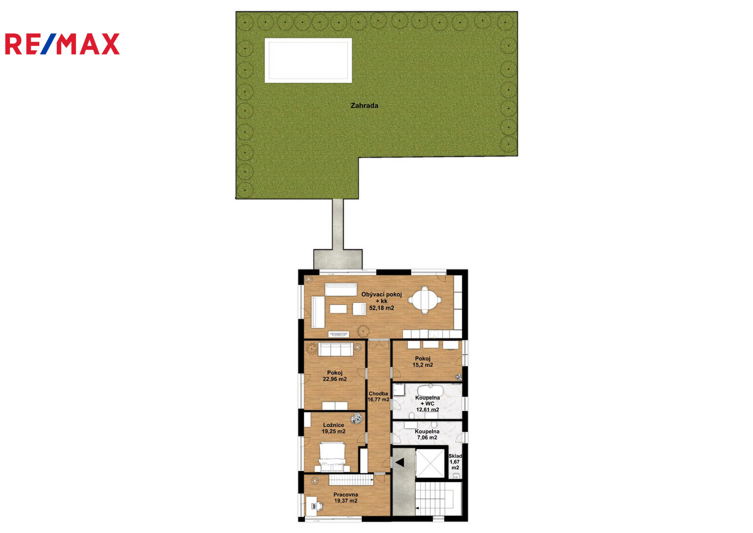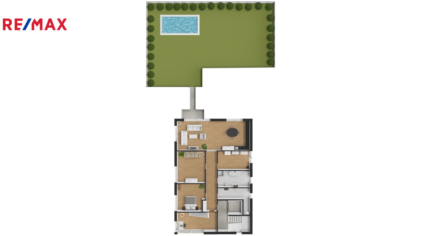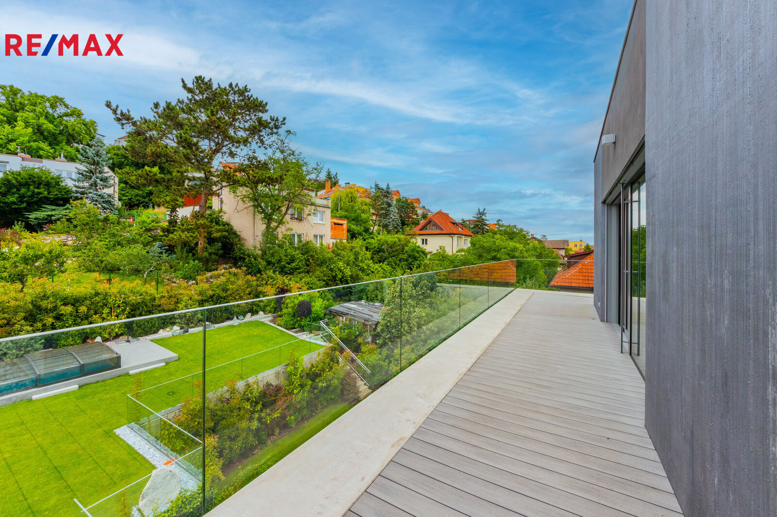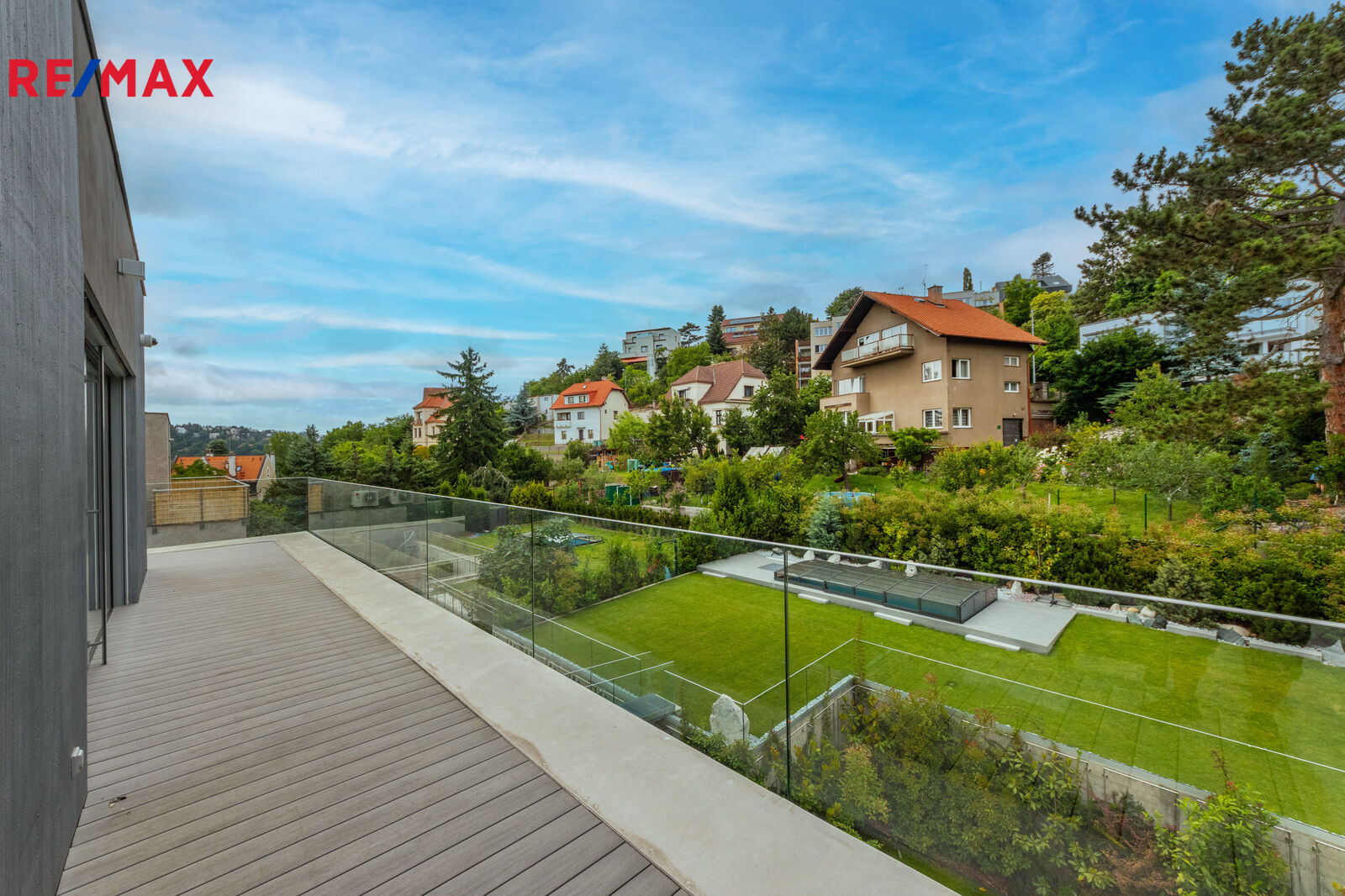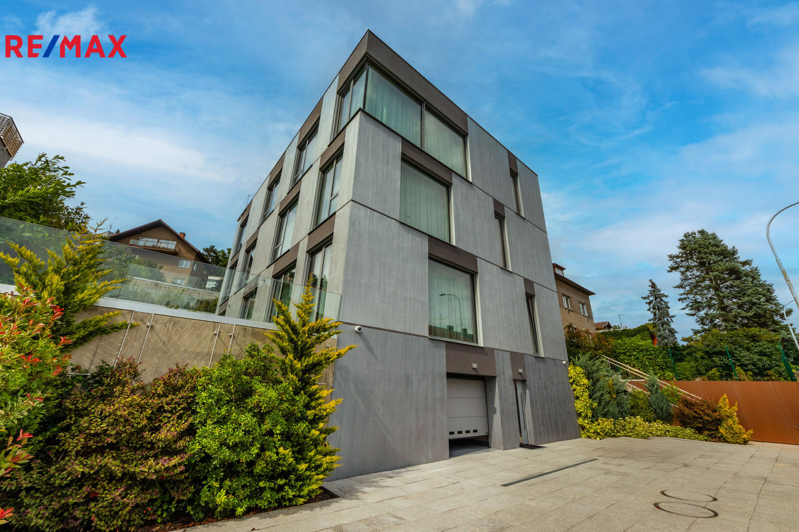 Součástí prodeje je architektonicky řešená zahrada o ploše 290 m² s automatickou závlahou a vzrostlými stromy, bazén se zastřešením, tři parkovací stání (z toho dvě uvnitř domu a jedno na pozemku) a sklep o výměře 6 m².