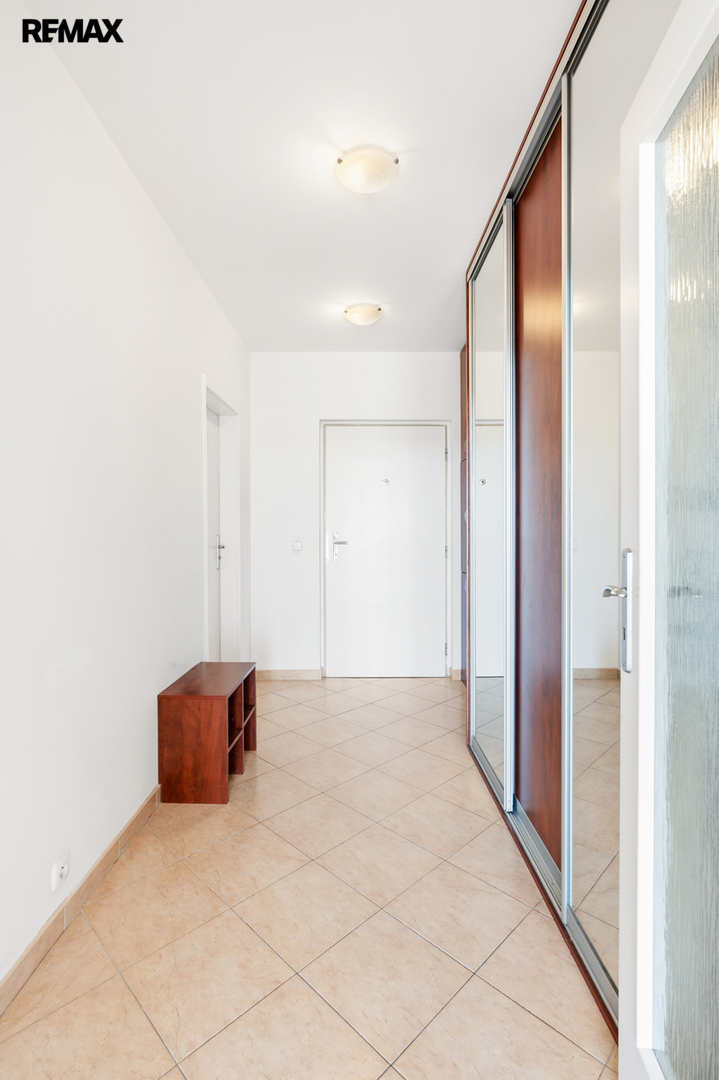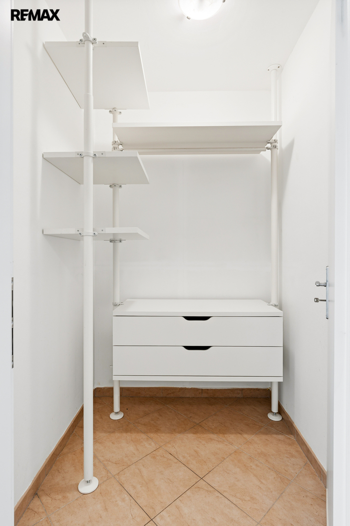 Dispozice bytu nabízí dostatek úložného prostoru – kromě velkého zděného sklepa (7 m²) v 1. podzemním podlaží je přímo v bytě komora, která může sloužit jako šatna. K bytu náleží také vlastní parkovací stání v garáži, což je v této lokalitě velkou výhodou.