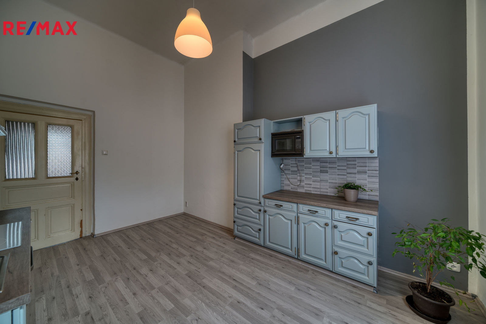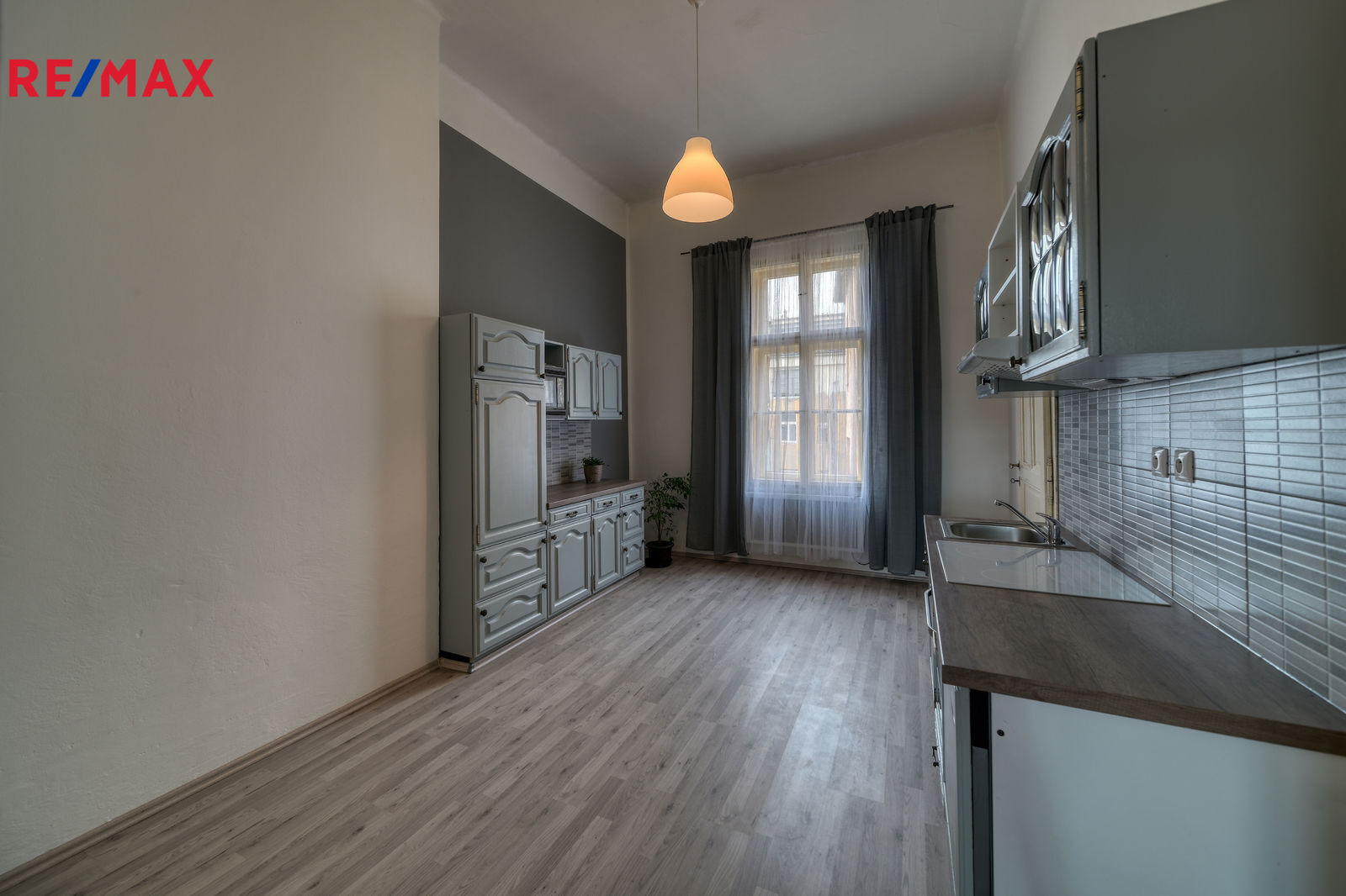 Levé křídlo bytu tvoří 3 pokoje, které jsou navzájem průchozí. Všechna okna jsou orientována na nábřeží a nabízí dechberoucí výhled na řeku. Pravé křídlo bytu tvoří kuchyně s jídelnou, koupelna, WC a úložné prostory. Kuchyně je vybavena kuchyňskými skříňkami, pracovní deskou, vestavěnou lednicí, mikrovlnnou troubou, myčkou, elektrickou troubou, sklokeramickou varnou deskou, dřezem a digestoří se světlem. Za kuchyní je malý pokoj pro služku, dnes využívaný jako spíž. Okna kuchyně a spíže jsou orientovaná do dvora.