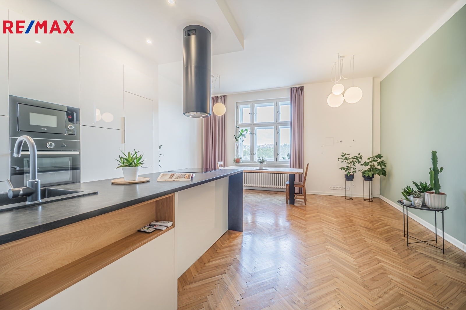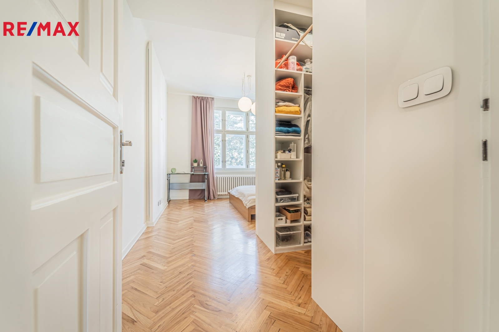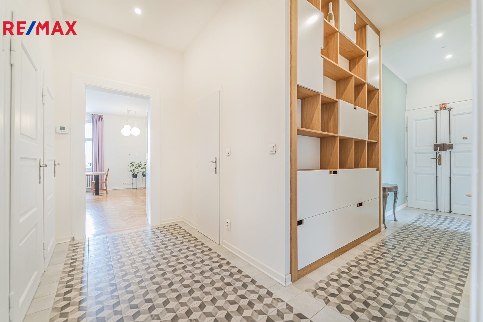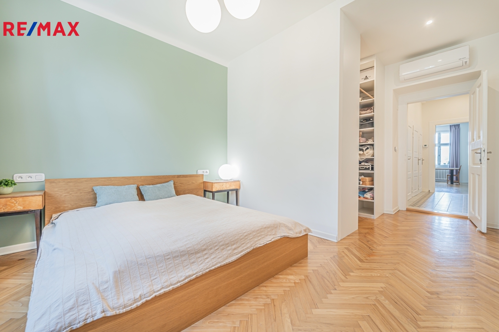 Bytová jednotka v osobním vlastnictví prošla v r. 2018 kompletní, ale velmi citlivou rekonstrukcí s důrazem na zachování ducha nemovitosti a zároveň na propojení původních prvků s moderním bydlením. Renovace dřevěných parketových podlah, interiérových dveří s obložkovými zárubněmi z masivního dřeva, nová avšak dobová dřevěná špaletová okna včetně kování s izolačním trojsklem - vše doplněno moderní kuchyňskou linkou s vestavnými spotřebiči, luxusní koupelnou či klimatizací. Obývací pokoj s kuchyní je orientován na východ s výhledem na Vltavu a Vyšehrad. Okna ložnic pak na západ, do vnitrobloku. Na první pohled Vás zaujme mnoho na míru zhotovených úložných prostor v podobně vestavných skříní, polic a šatníku, včetně průchozí šatny v ložnici. Velkou výhodou je uzavíratelná komora s regálovým systémem, kde je umístěna pračka a sušička. Technická místnost s plynovým kotlem, jenž představuje vlastní zdroj topení a ohřevu TUV je zcela oddělena.