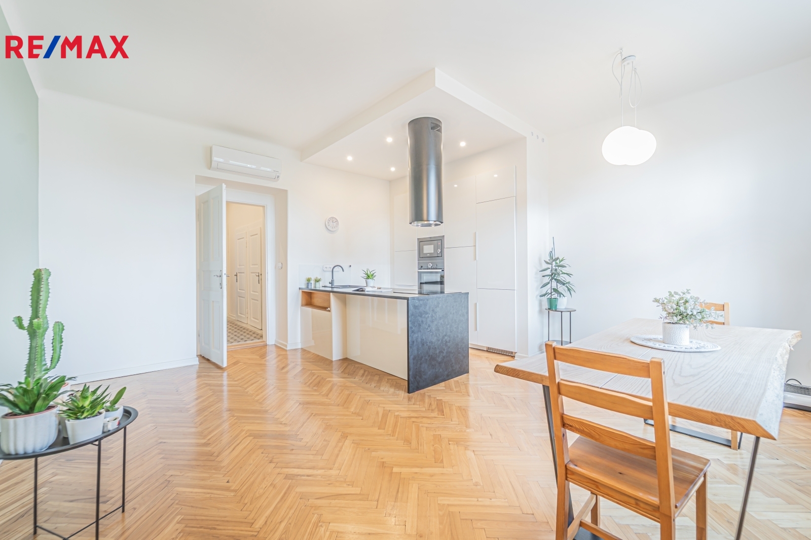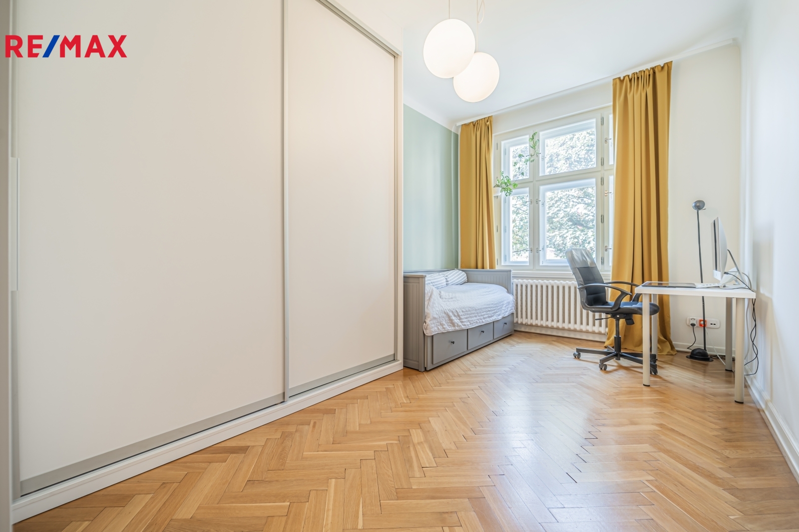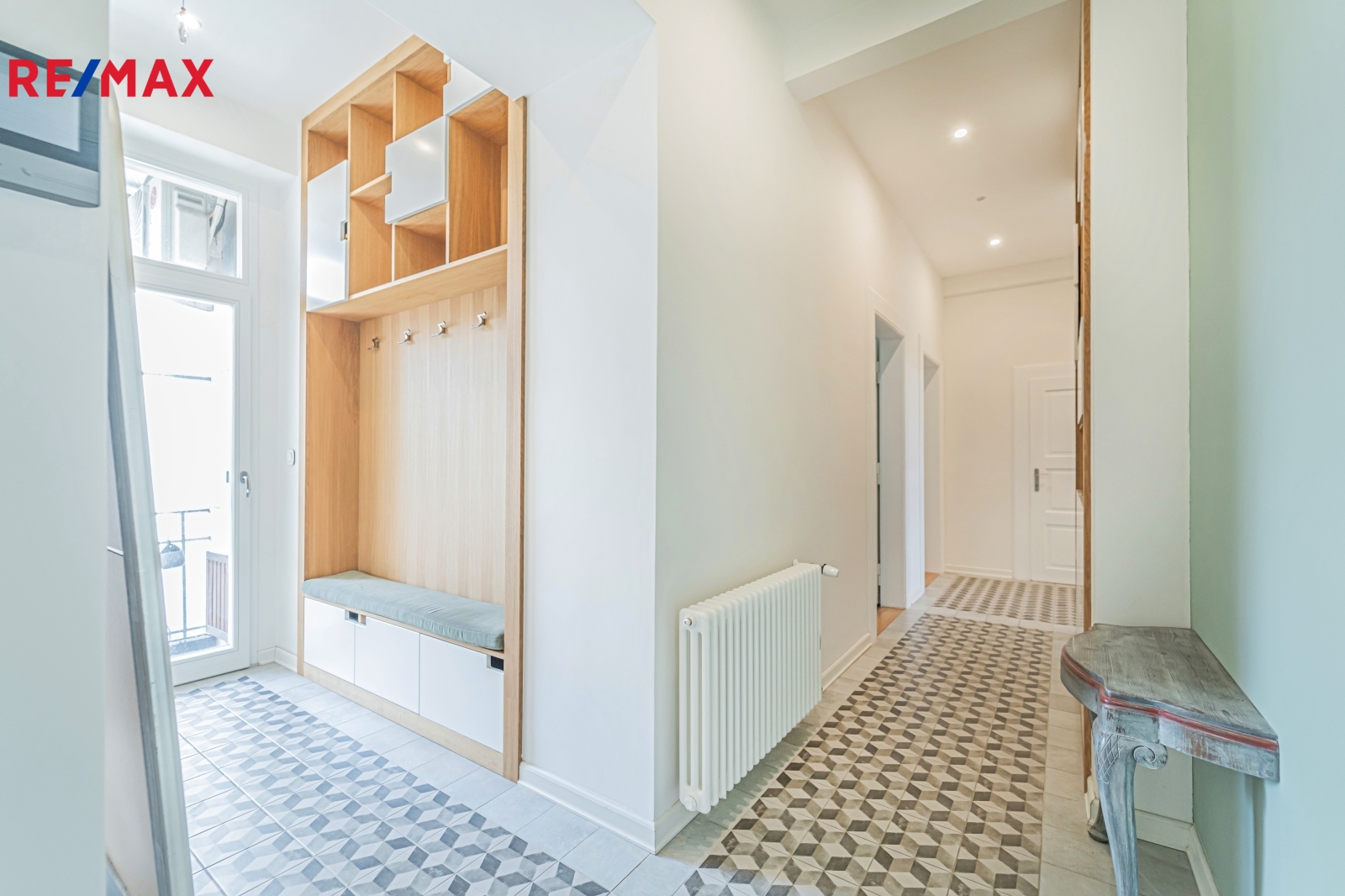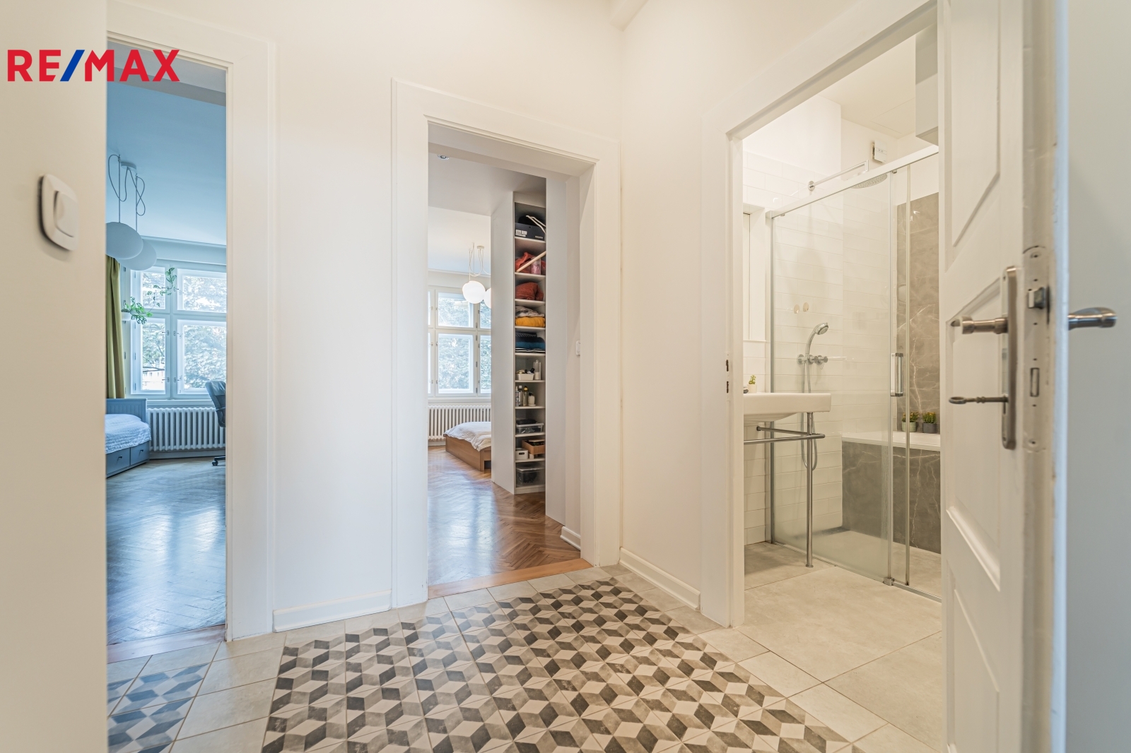 Bytová jednotka v osobním vlastnictví prošla v r. 2018 kompletní, ale velmi citlivou rekonstrukcí s důrazem na zachování ducha nemovitosti a zároveň na propojení původních prvků s moderním bydlením. Renovace dřevěných parketových podlah, interiérových dveří s obložkovými zárubněmi z masivního dřeva, nová avšak dobová dřevěná špaletová okna včetně kování s izolačním trojsklem - vše doplněno moderní kuchyňskou linkou s vestavnými spotřebiči, luxusní koupelnou či klimatizací. Obývací pokoj s kuchyní je orientován na východ s výhledem na Vltavu a Vyšehrad. Okna ložnic pak na západ, do vnitrobloku. Na první pohled Vás zaujme mnoho na míru zhotovených úložných prostor v podobně vestavných skříní, polic a šatníku, včetně průchozí šatny v ložnici. Velkou výhodou je uzavíratelná komora s regálovým systémem, kde je umístěna pračka a sušička. Technická místnost s plynovým kotlem, jenž představuje vlastní zdroj topení a ohřevu TUV je zcela oddělena.