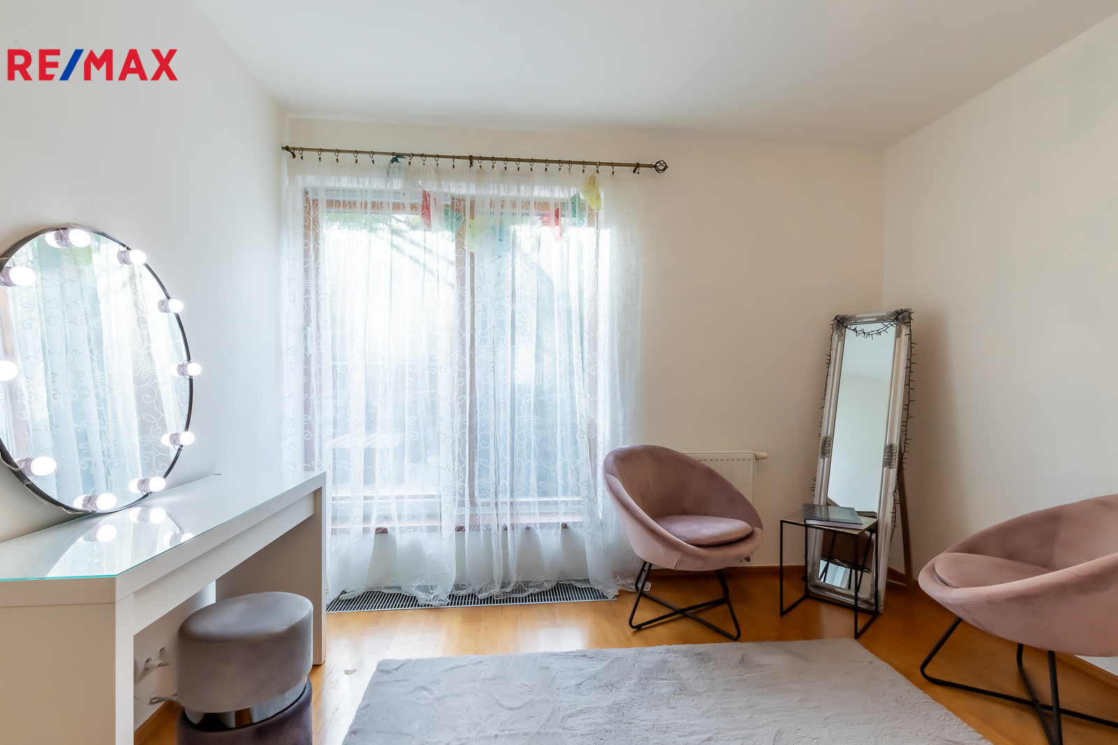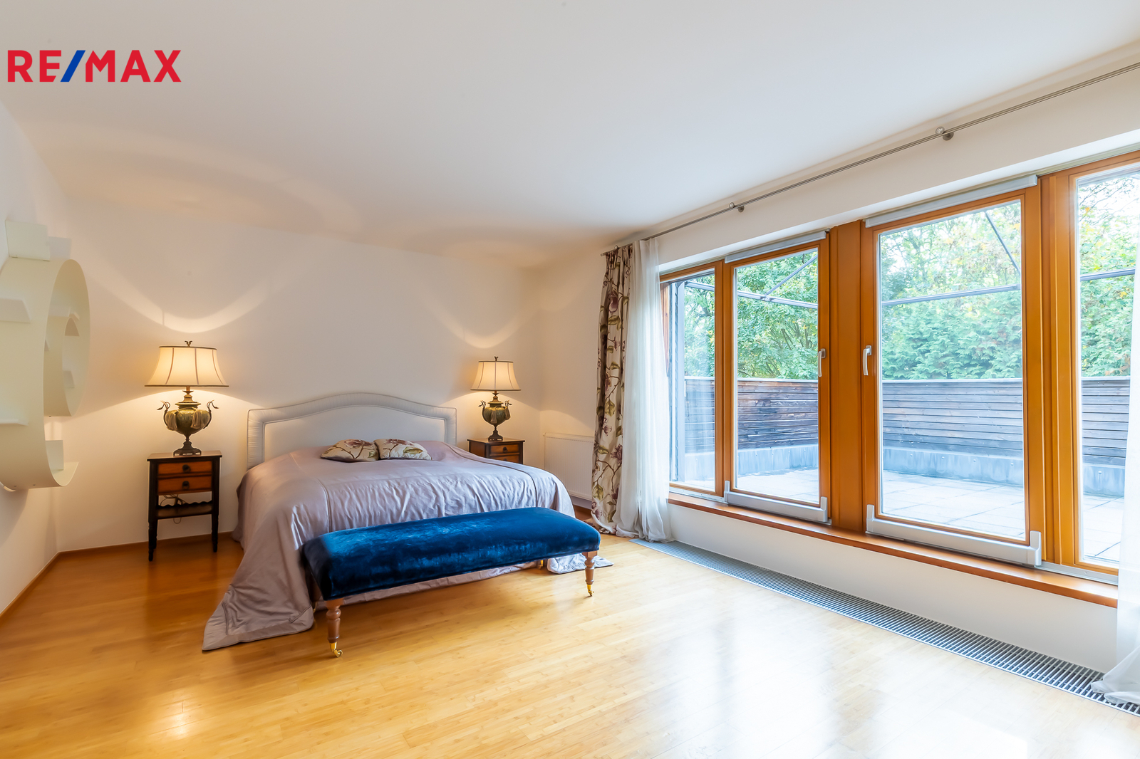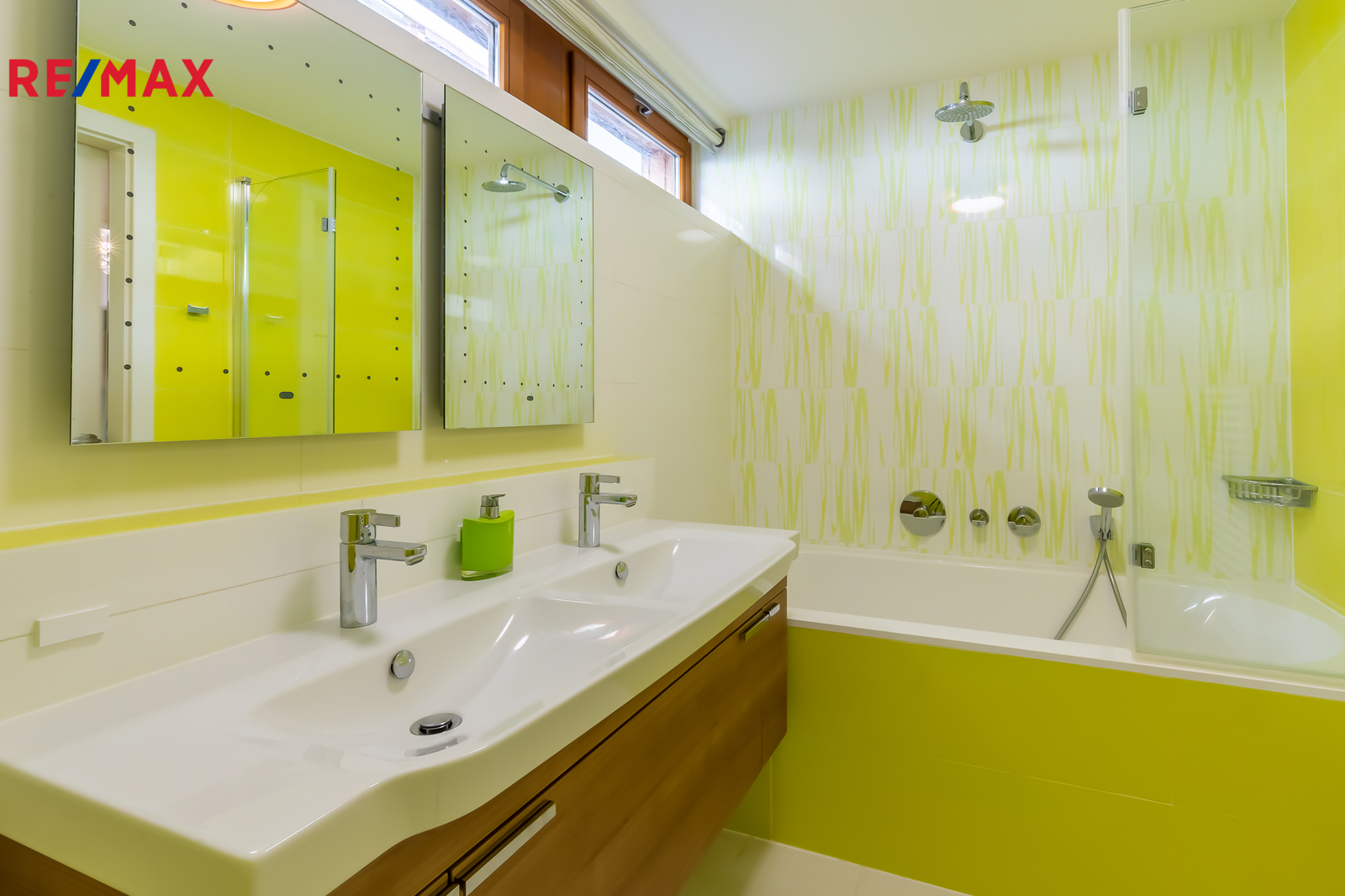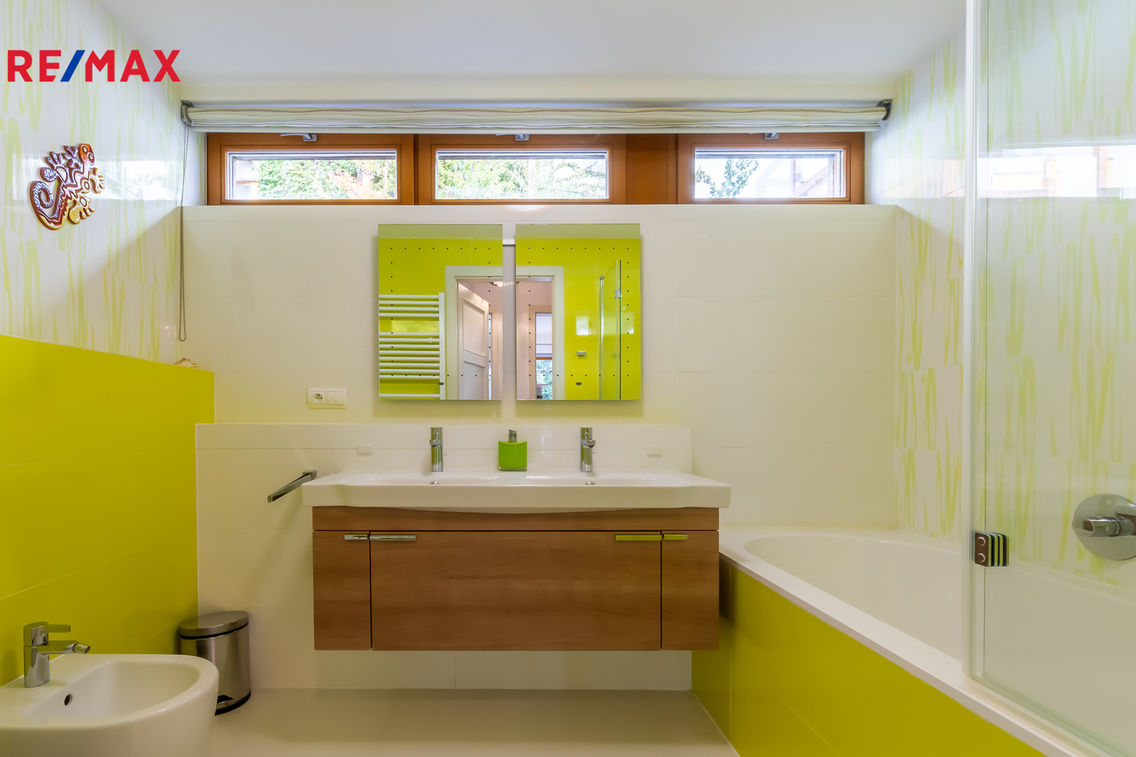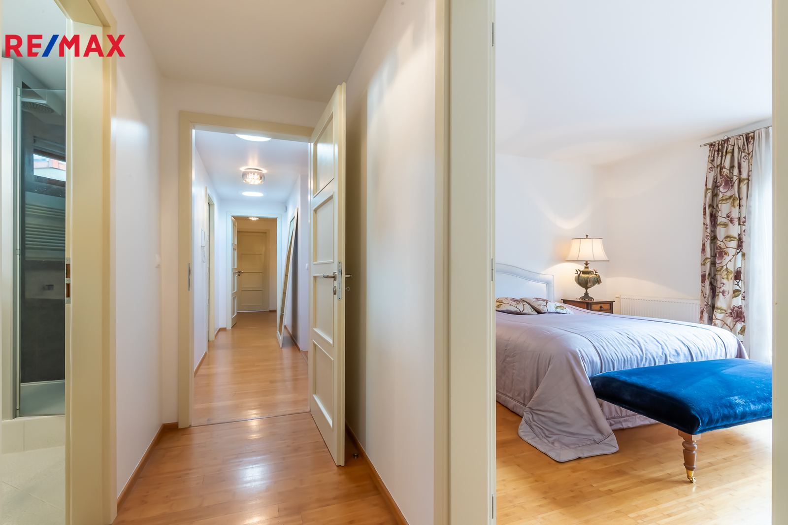 Horní patro je rozděleno na dětskou a rodičovskou část. Každá z nich je oddělena chodbou a má vlastní koupelnu, šatnu i terasu, což zaručuje naprosté soukromí pro všechny členy rodiny. Hned u vstupu do domu se nachází praktická šatna.