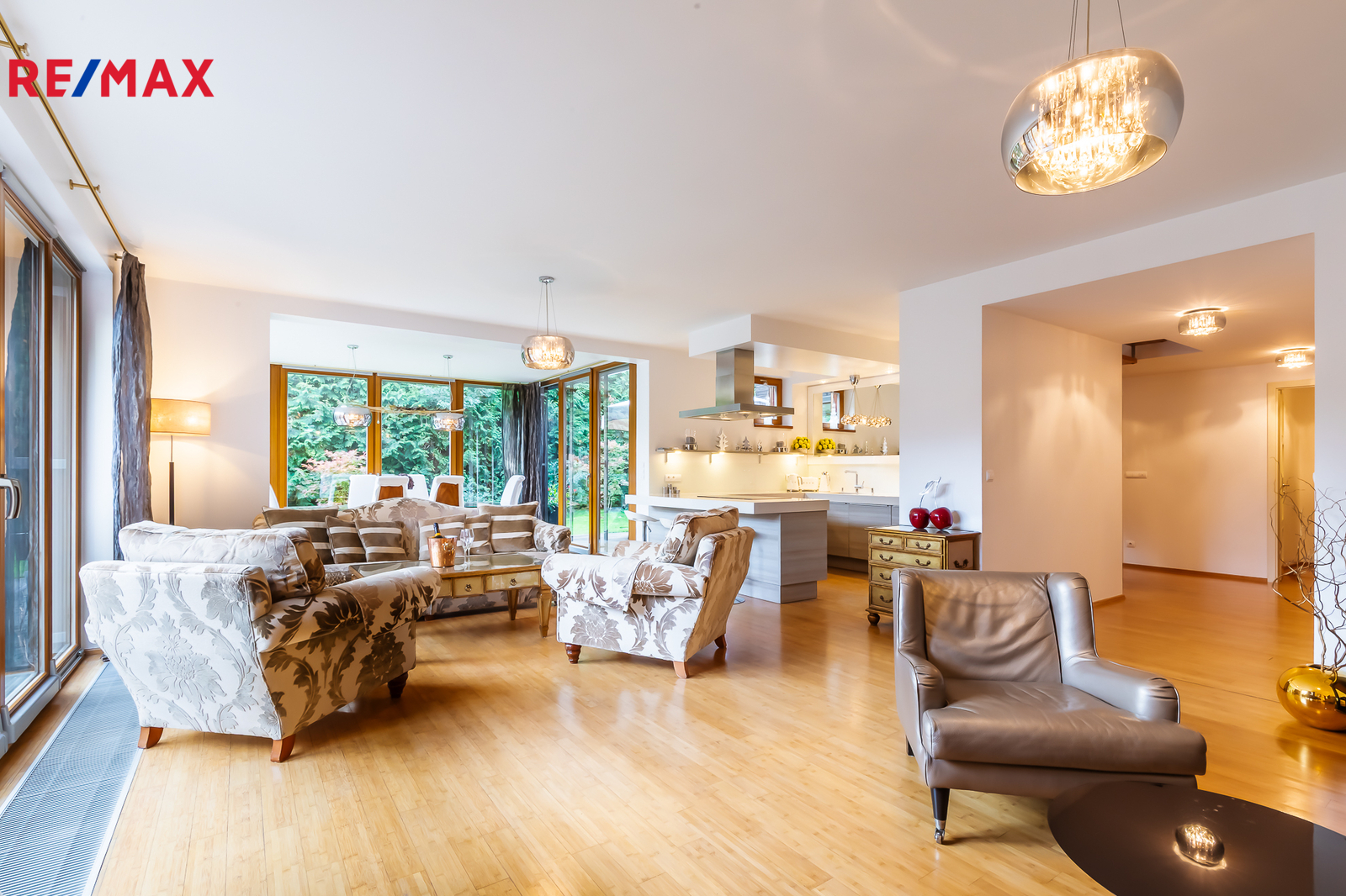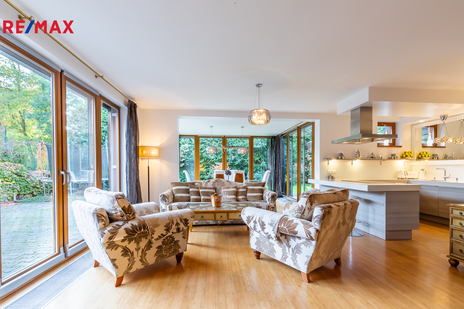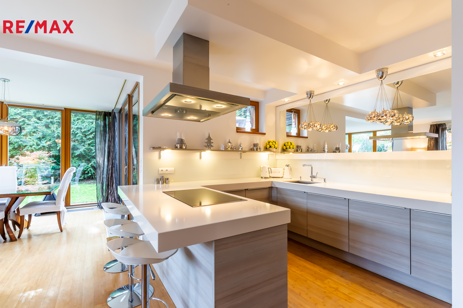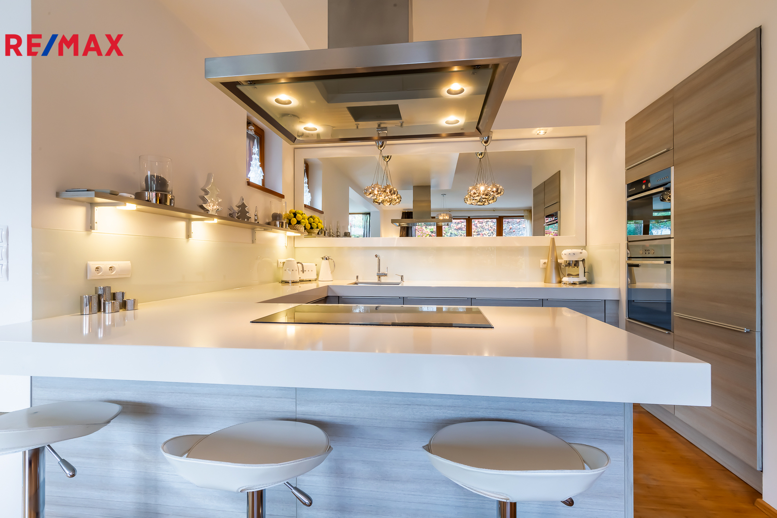 Součástí obytné části je designová kuchyň značky Poggenpohl, vybavená veškerými vestavěnými spotřebiči.
