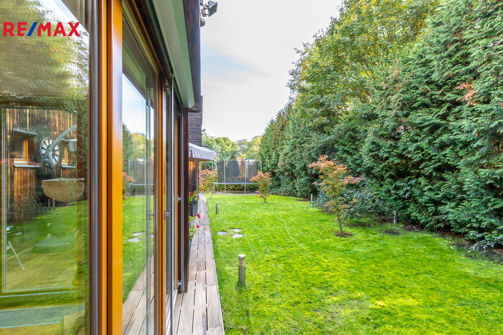 Z obou místností je přímý vstup na zahradu, kde rostou vzrostlé túje o výšce přibližně 7 metrů, které poskytují maximální soukromí.