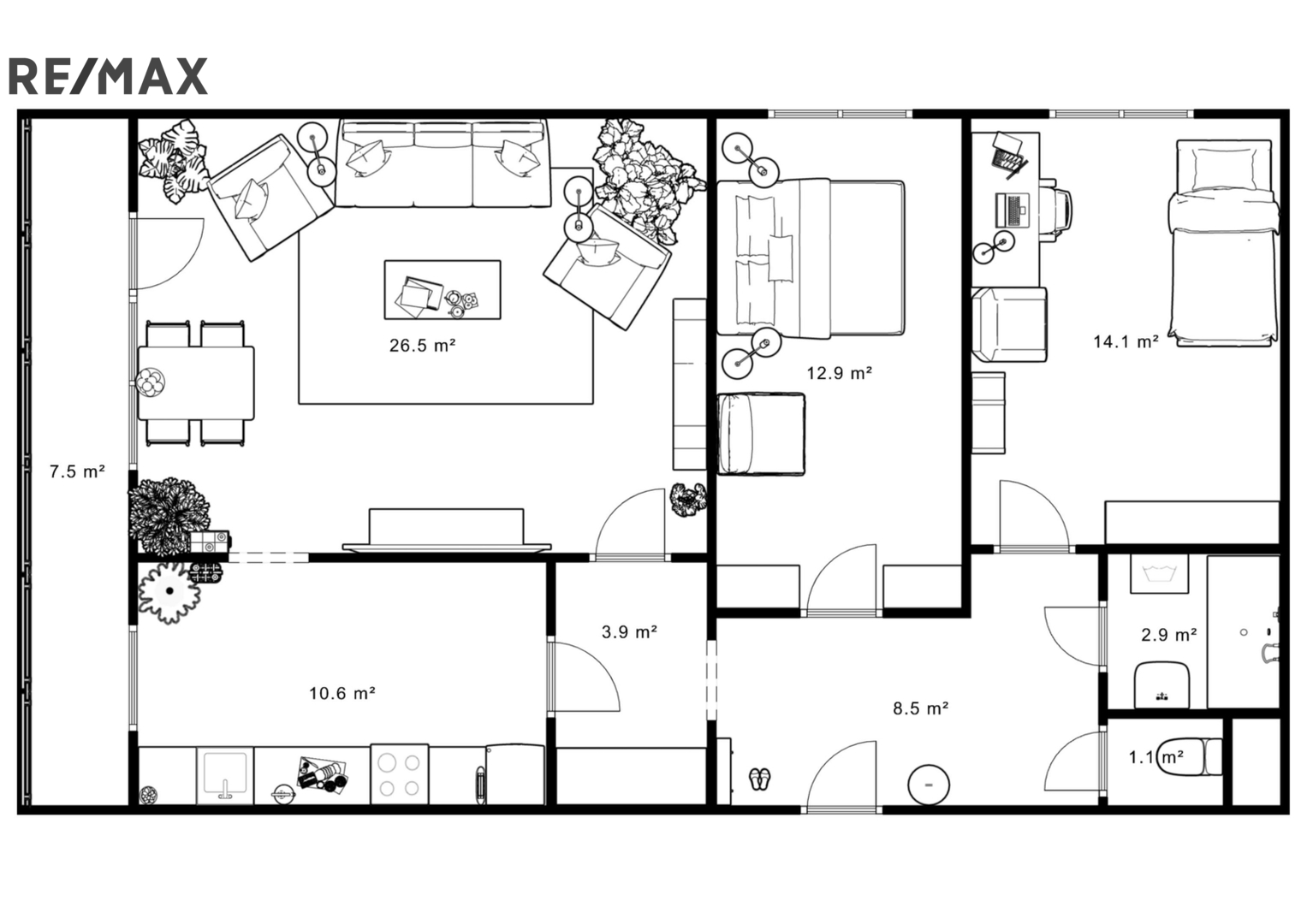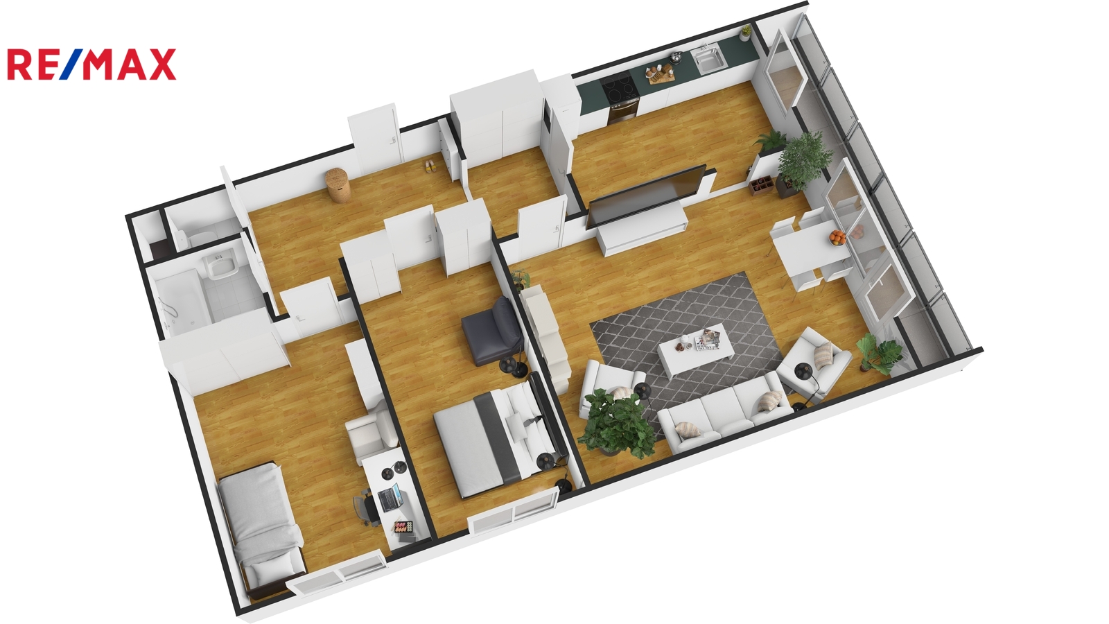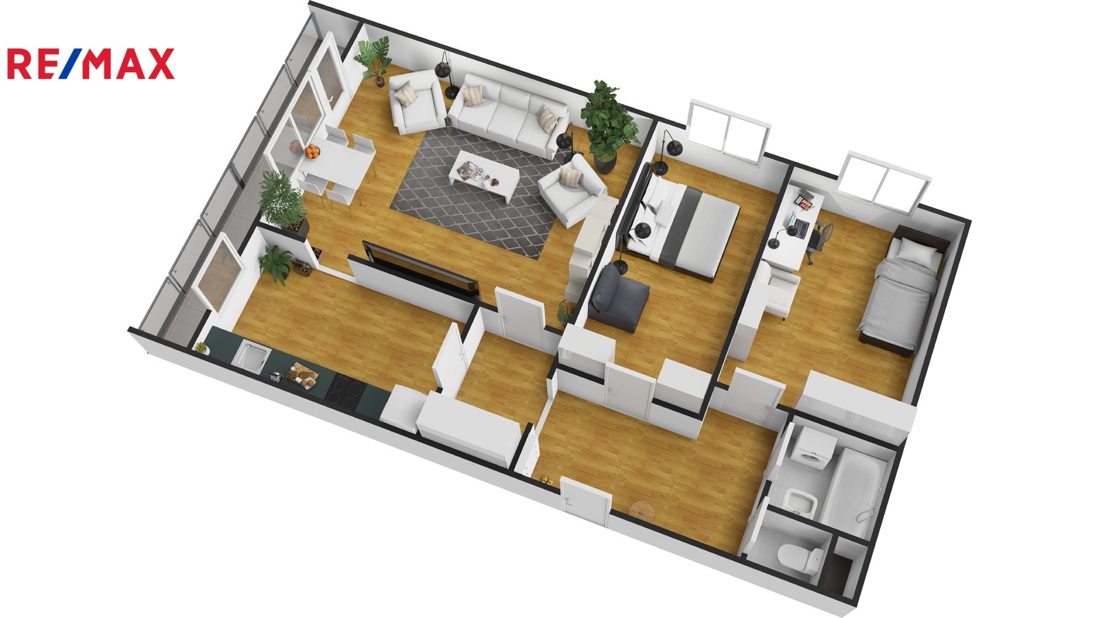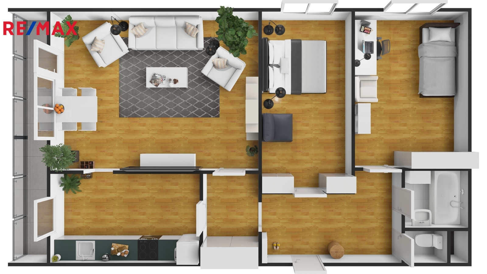 Dispozice zahrnuje obývací pokoj se vstupem na lodžii, samostatnou kuchyň, dvě ložnice, prostornou předsíň, koupelnu a samostatné WC.