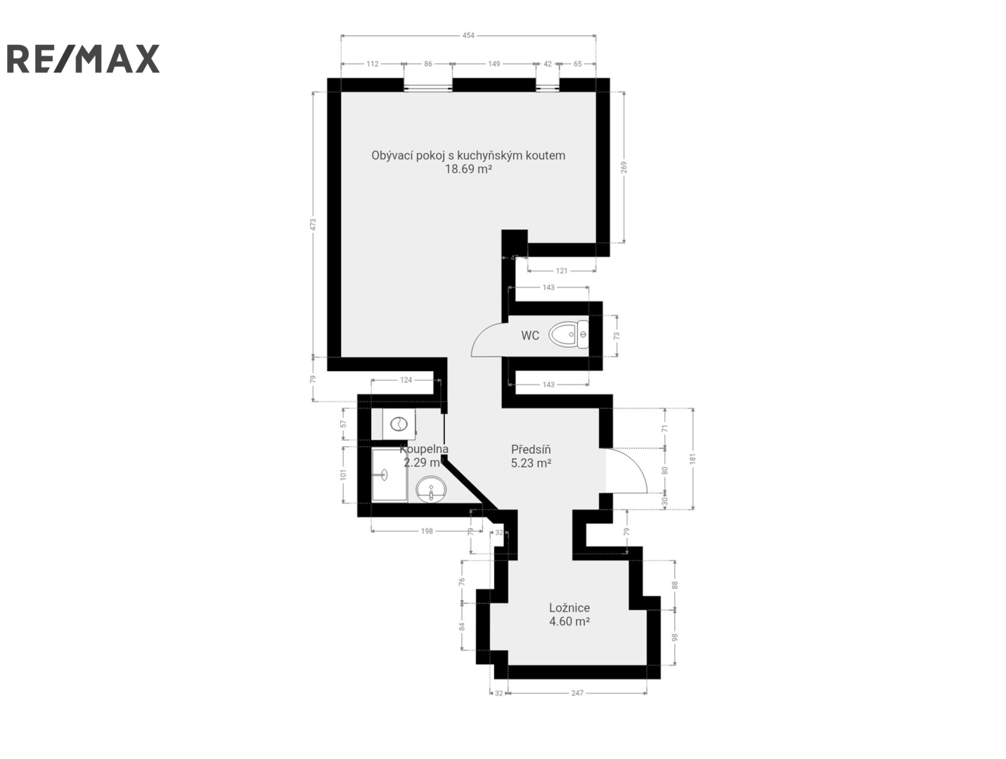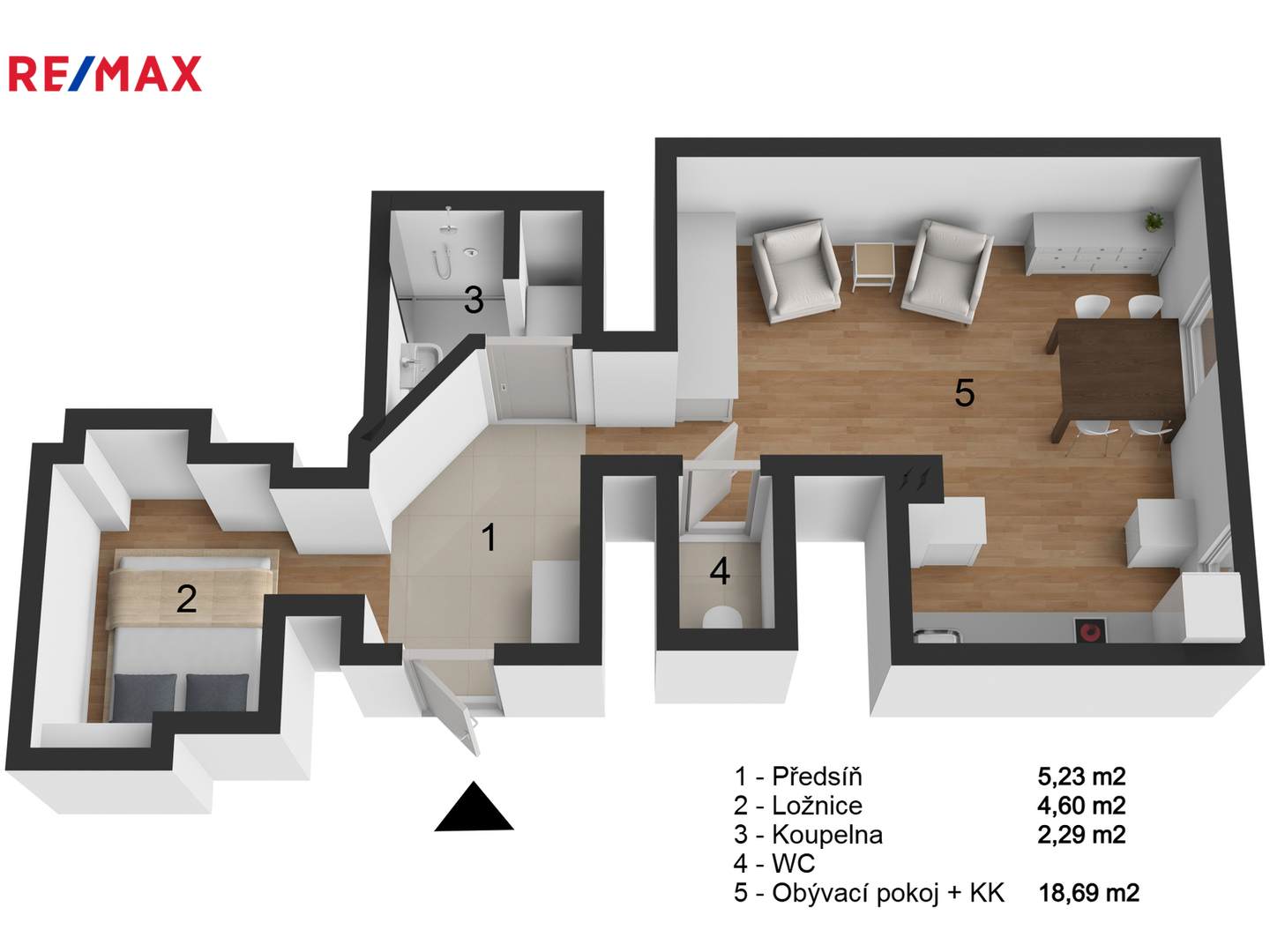 Jednotka disponuje obývacím pokojem s kuchyňským koutem, koupelnou se sprchovým koutem, ložnicí, vstupní chodbou a samostatnou toaletou.