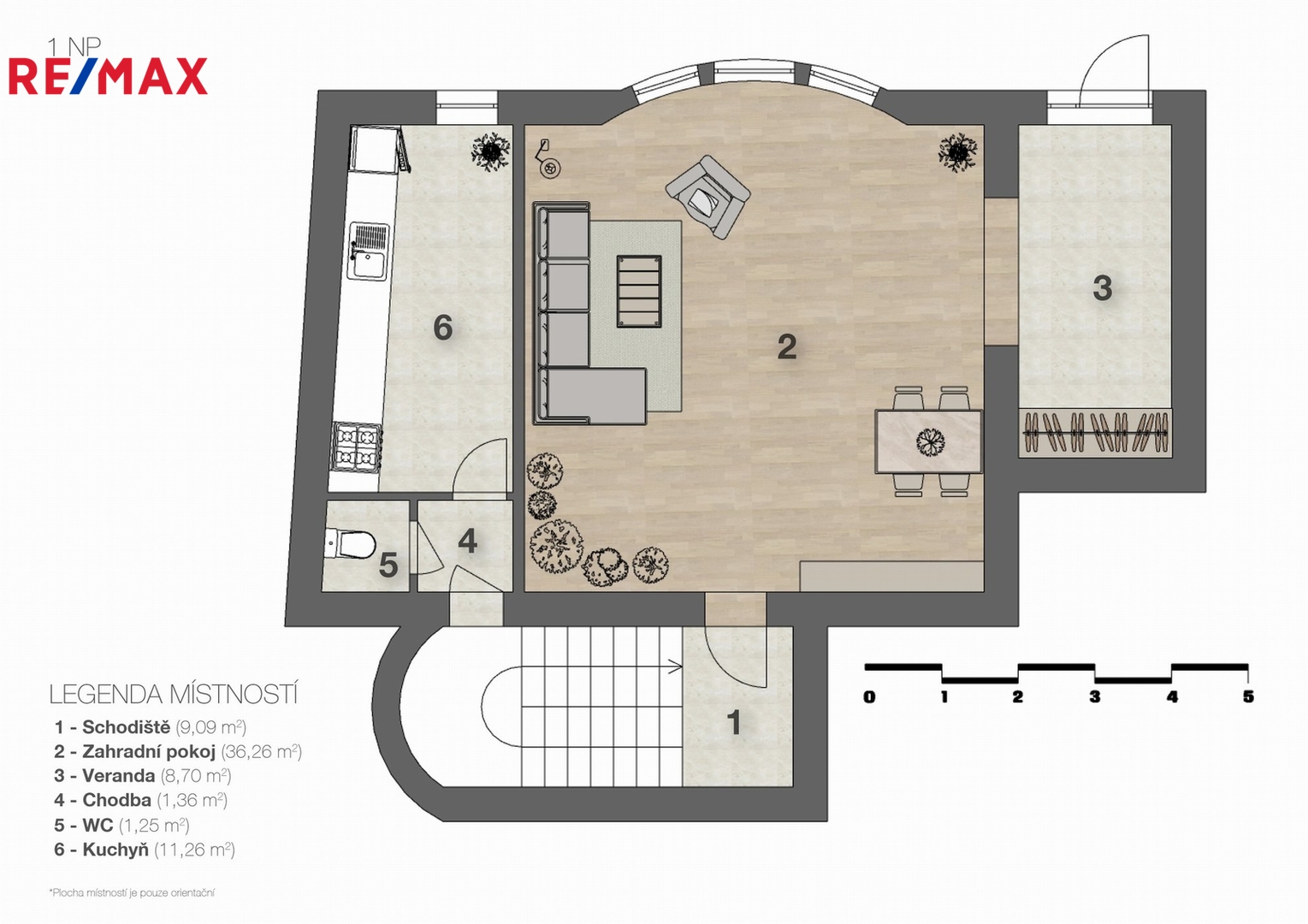 1. nadzemní podlaží (1. NP) – 70,6 m² + terasa 30 m²