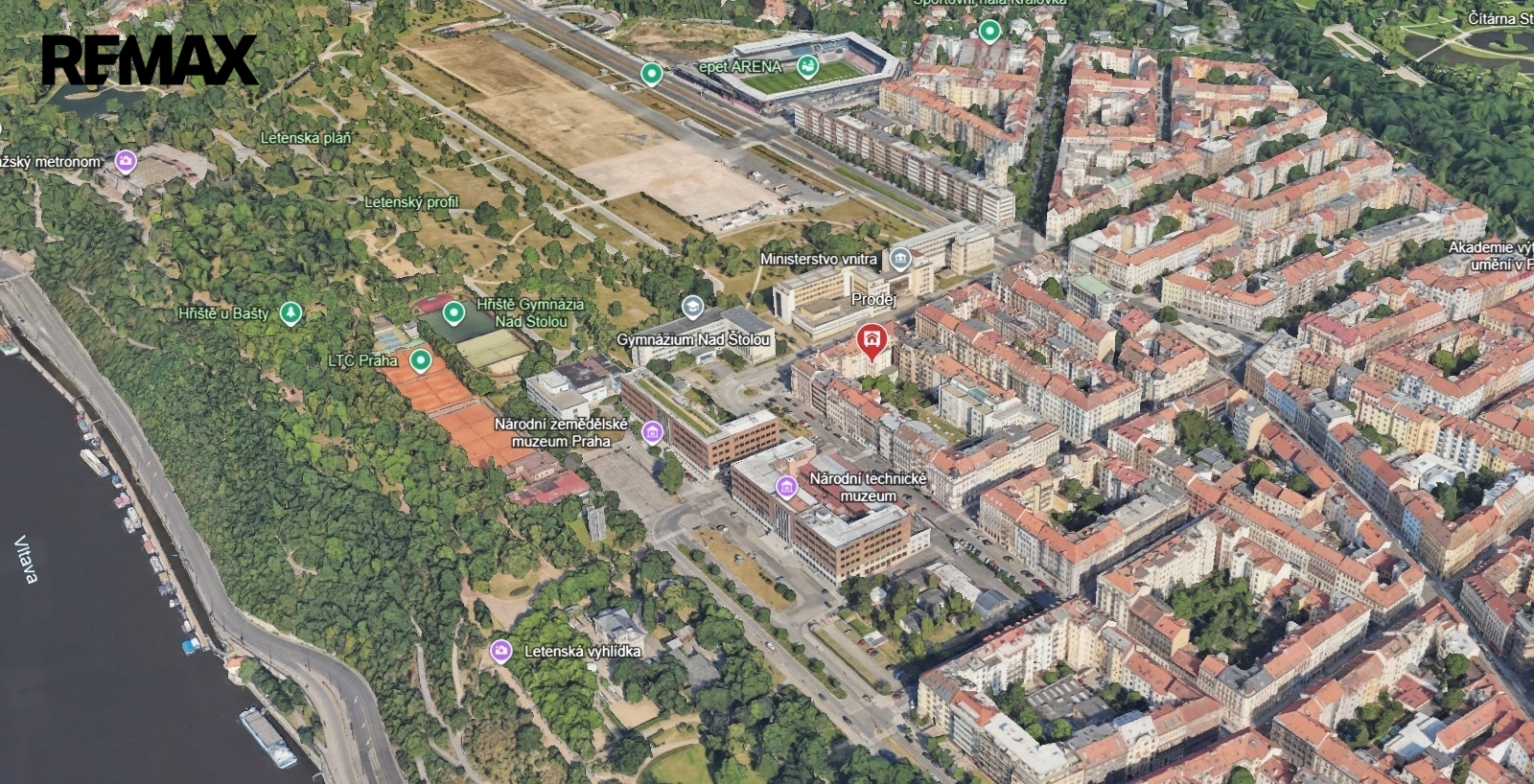 Byt se rozkládá ve třech podlažích a díky svému členění i samostatným vstupům působí spíše jako vila než klasický byt. Nachází se v elegantním domě s výtahem na prestižní adrese Nad Štolou, jen pár kroků od Letenských sadů.