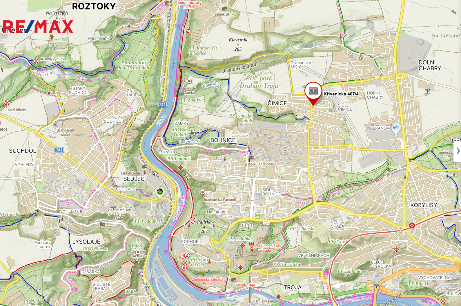 Nedaleko jsou zajímavá přírodní a historická místa na severním okraji hlavního města nebo západně nad tokem řeky Vltavy. Přírodní park Drahanské údolí, Čimické údolí, pěšky až do Bohnic nebo do Troji.