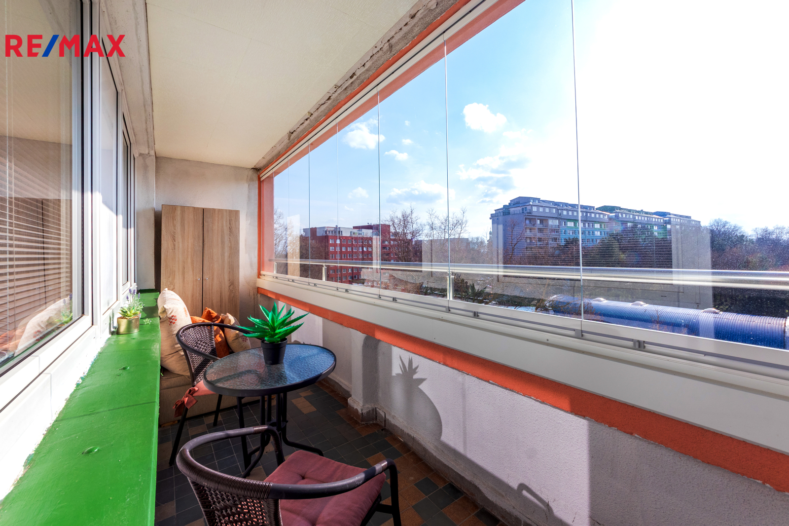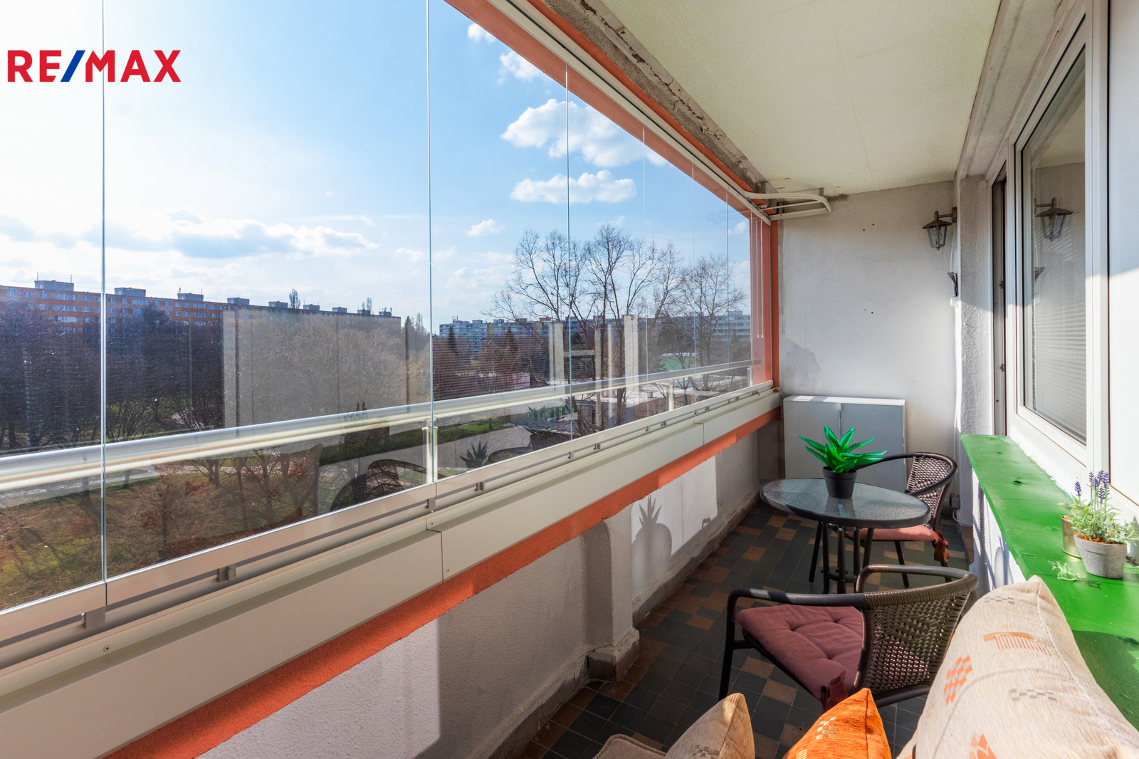 Velkou předností tohoto bytu je prostorná zasklená lodžie ( 7,9 m2 ) a poloha přímo u metra, orientace je do klidné části ( NE do ul. Vysočanská ).