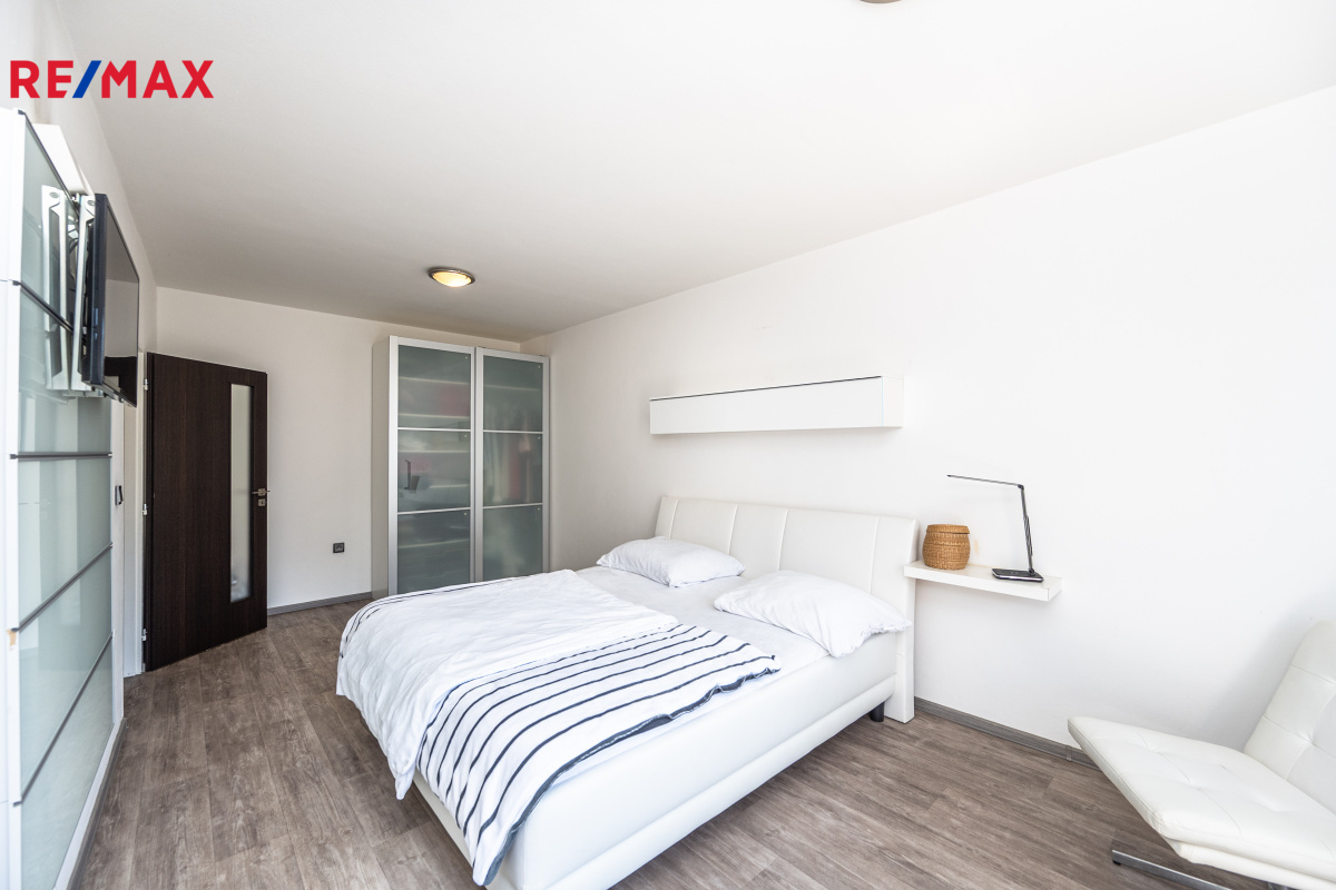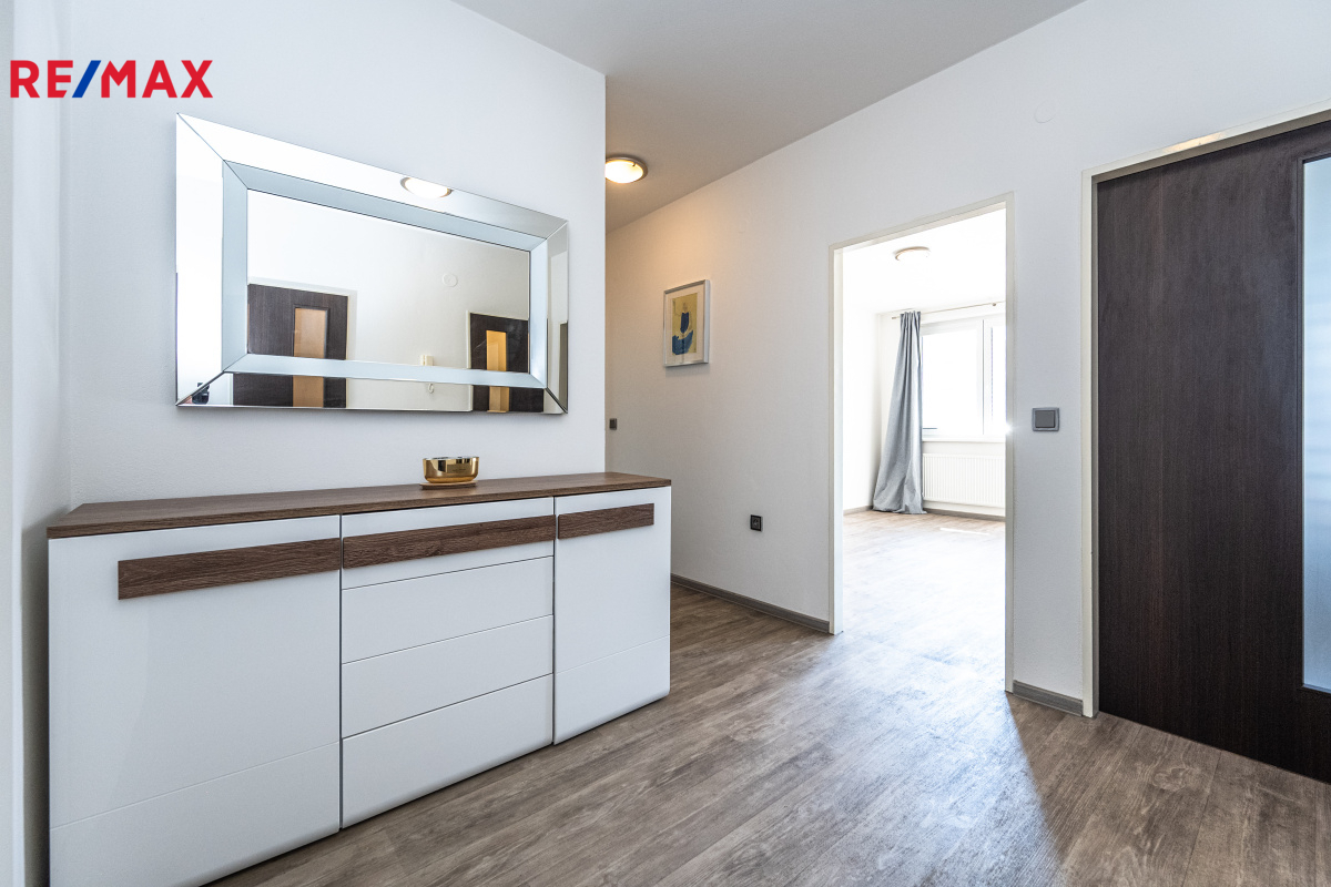 Byt prošel kompletní rekonstrukcí – nové podlahy, kuchyňská linka, koupelna, dveře.