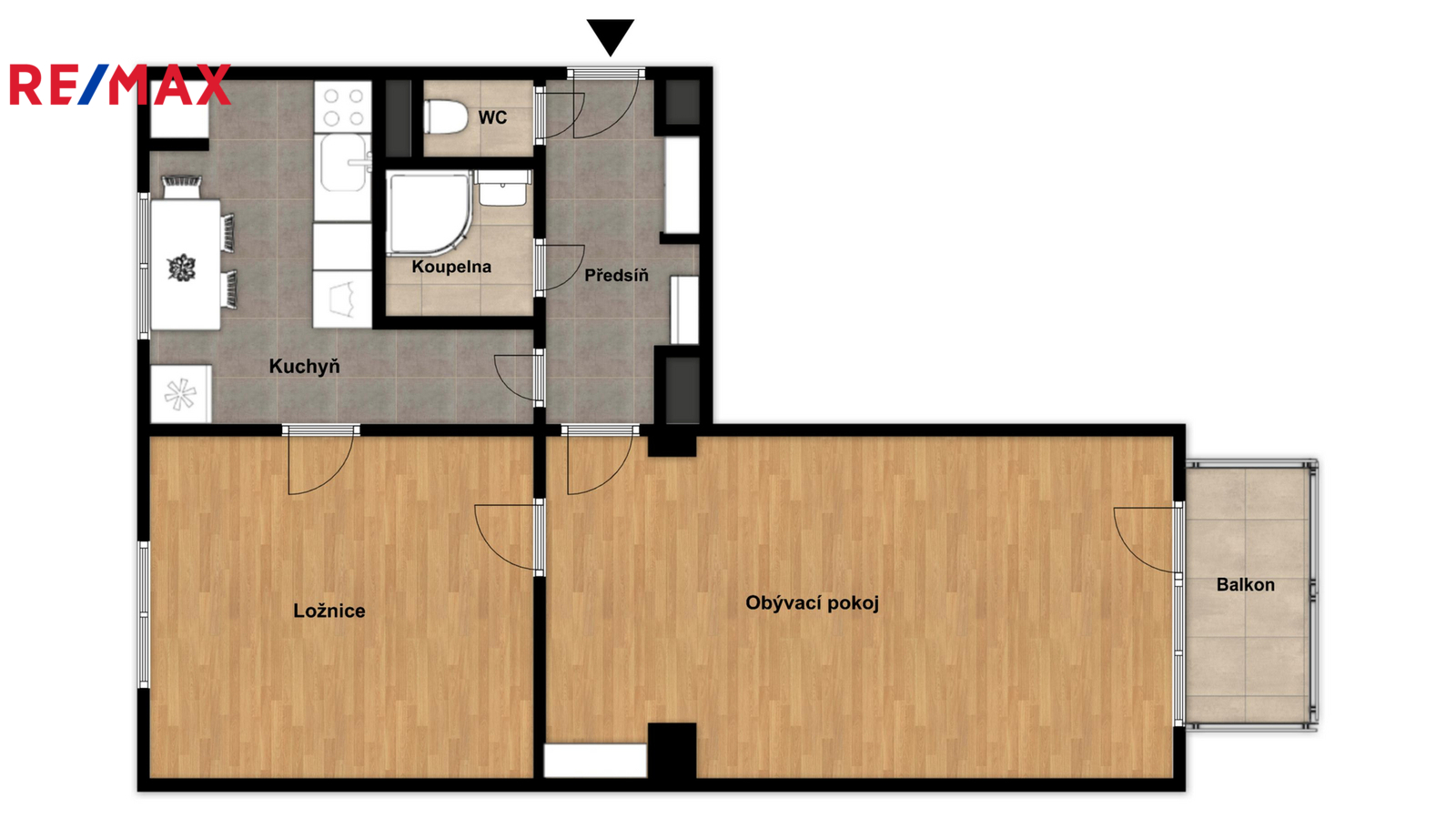 Podlahová plocha bytu: Obývací pokoj 21,8 m², ložnice 13,4 m², kuchyň 9,4 m², koupelna 2,1 m², wc 1,0 m², chodba 3,5 m² - celkem 51 m²
