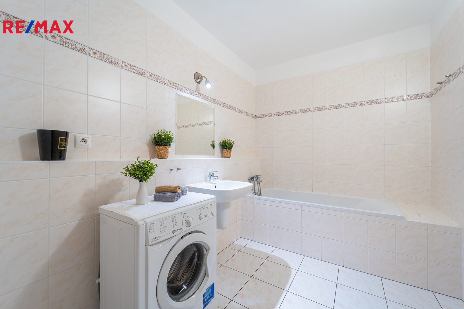 Velká koupelna nabízí vanu, WC i prostor pro pračku, vše pohodlně na jednom místě.