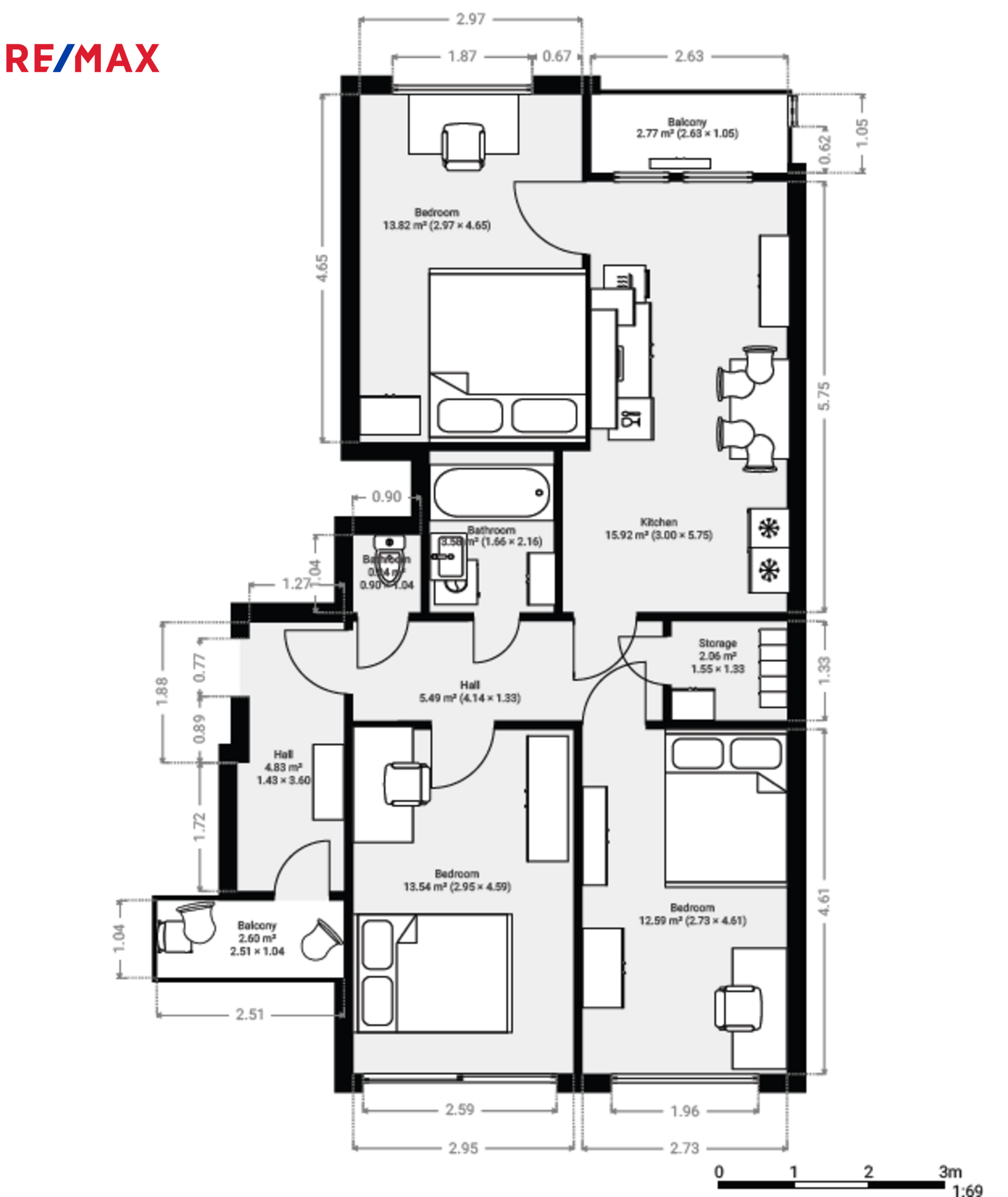 Kuchyně s přímým vstupem na balkon a 3 pokoje tvoří ideální dispozici pro spolubydlení nebo velkou rodinu.