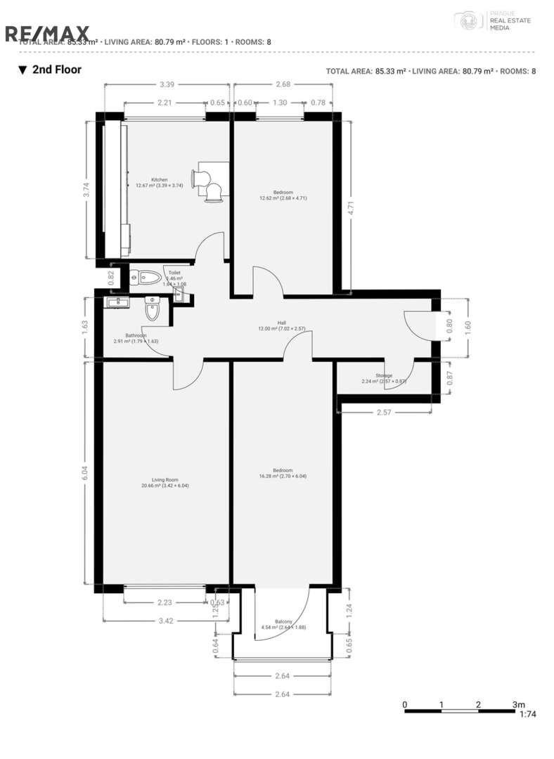Kuchyně o velikosti téměř 13 m² poskytuje dostatek místa pro pohodlné vaření i jídelní stůl. Obývací pokoj o výměře 21 m² je pěkně vzdušný a ideální pro rodinné setkávání. Dva neprůchozí pokoje o velikosti 13 m² a 16 m² nabízí využití jako ložnice, dětský pokoj či pracovna. Velkým benefitem je prostorná komora a také dvě samostatné toalety, což výrazně zvyšuje rodinný komfort.