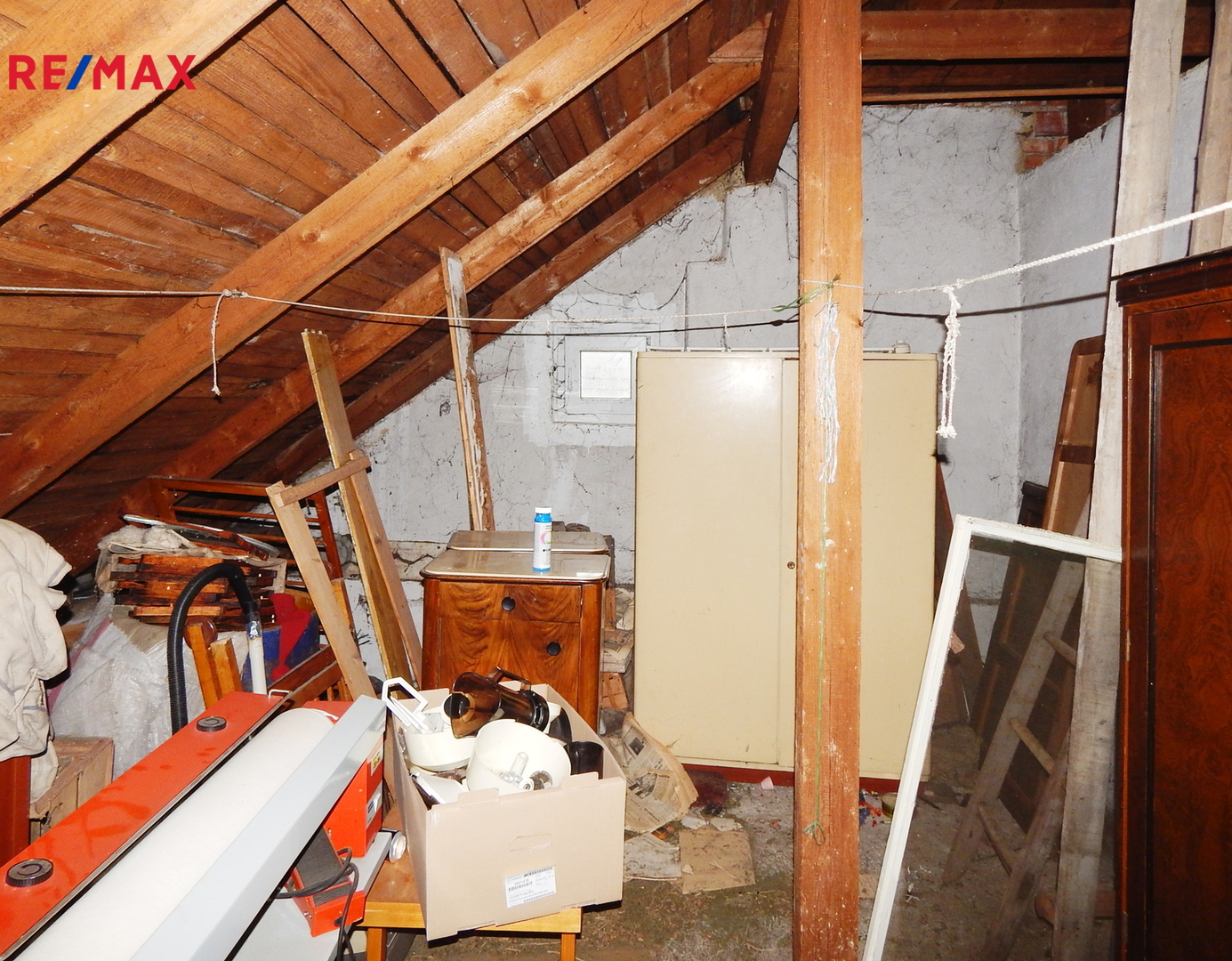 Dům je o dispozici 5 + 1 včetně chodby, spíže, koupelny a WC. Dům je celý podsklepen, vjezd do garáže v suterénu je přímo z ulice. Vchod do obytné části domu je situován při pohledu z ulice v levé části domu a překonáme k němu 12 schodů. V prvním podlaží projdeme předsíní do chodby se schodištěm do dalšího patra, zadního vchodu a sklepa. Dále projdeme do bytu (koupelna s WC, dva pokoje, kuchyň a jídelna). V dalším poschodí pak najdeme jeden větší a jeden menší pokoj, Je zde také vchod na balkon a do dalších půdních prostor. Ve sklepě najdeme zánovní kotel na plyn a několik místností. Dům není zateplen, střecha je pokryta eternitovými šablonami. Okna a dveře jsou již plastová. Kolem celé nemovitosti je drátěné oplocení. Na pozemek vstupujeme přímo z obecní komunikace.