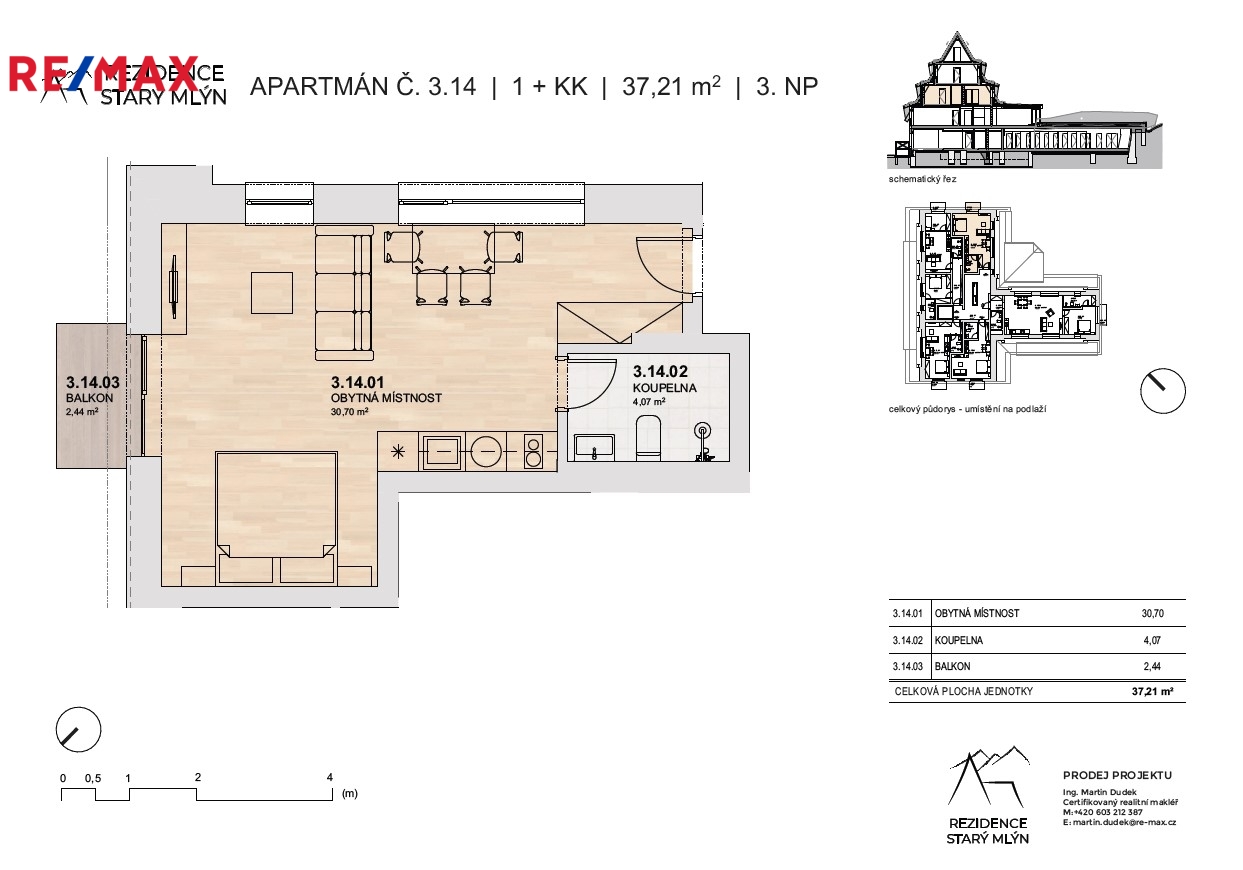 Prezentovaný apartmán č. 14 o dispozici 1+KK se nachází ve druhém patře (3 NP) a disponuje celkovou podlahovou plochou 37,8 m². K jednotce náleží balkon o velikosti 2,4m², který umožňuje relaxaci s výhledem na okolní přírodu. Výhodou je jihozápadní orientace. K apartmánu náleží privátní uzamykatelná kolárna + lyžárna o velikosti 2,4m², možnost využívat společného wellness.