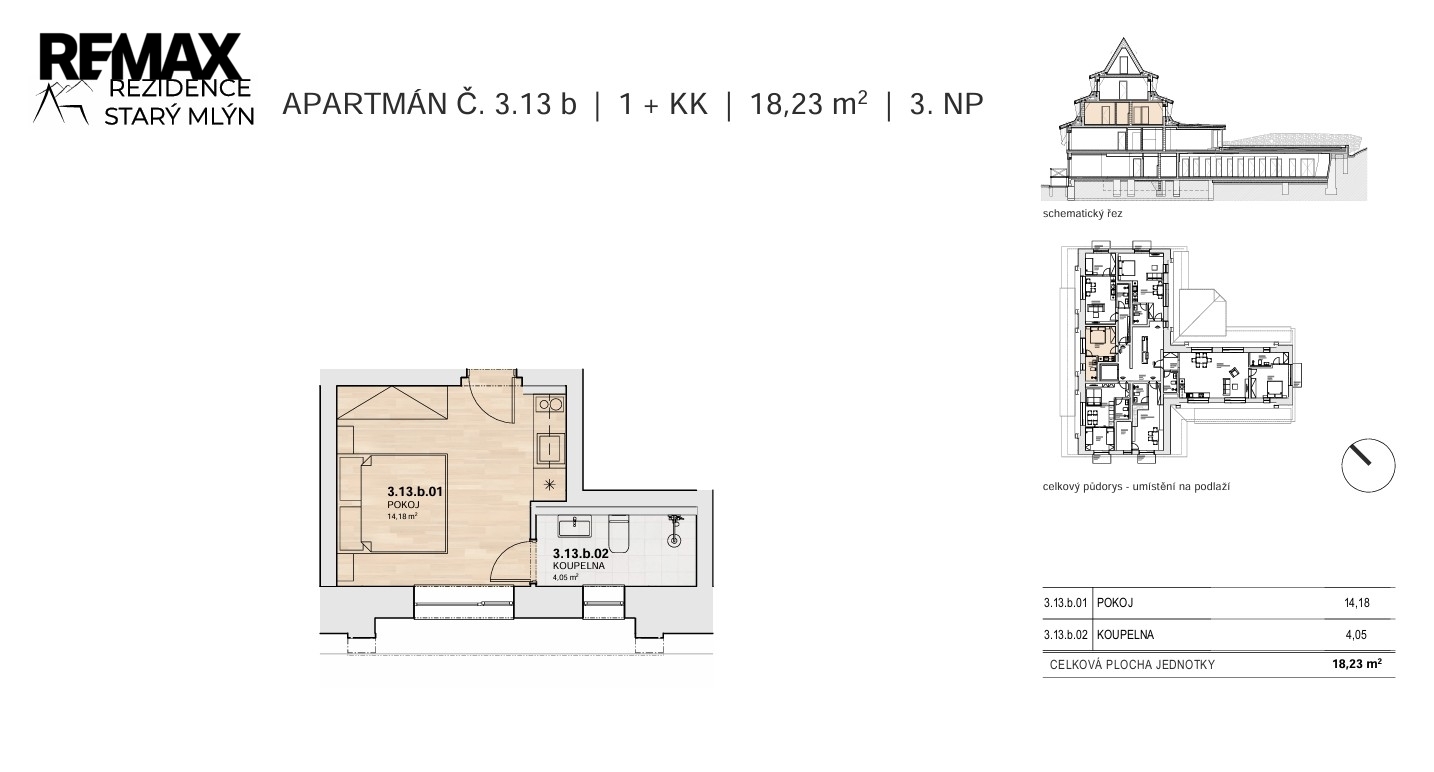 Prezentovaný apartmán č. 13b o dispozici 1+KK se nachází ve 3NP a disponuje podlahovou plochou 18,2 m². K apartmánu dále náleží privátní uzamykatelná kolárna + lyžárna (2,5m²), možnost využívání společného wellness. Cena za apartmán je uváděna včetně parkovacího stání (v hodnotě 400tis Kč) a DPH s možností odpočtu ve výši 21%. Aktuálně nabízíme voucher na kuchyňskou linku v hodnotě 100 tis Kč. Stavba byla již zahájena a plánované dokončení je do konce roku 2026.