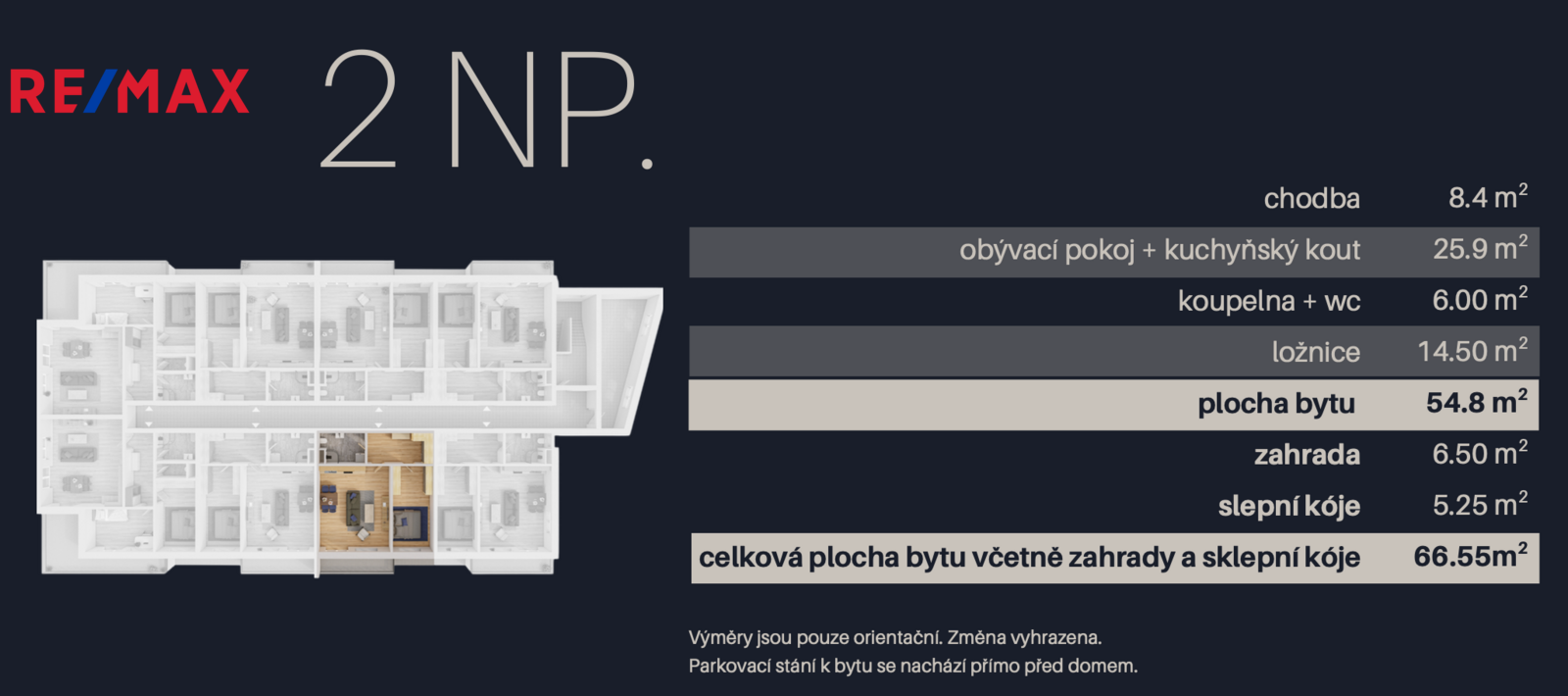 Byt o celkové ploše 66,55 m² se nachází ve 2. nadzemním podlaží. Samotná obytná plocha činí 54,8 m² a zahrnuje prostorný obývací pokoj s kuchyňským koutem (25,9 m²), ložnici (14,5 m²), chodbu (8,4 m²) a koupelnu s WC (6,0 m²). K bytu dále náleží terasa o velikosti 6,5 m² a praktická sklepní kóje (4,35 m²).