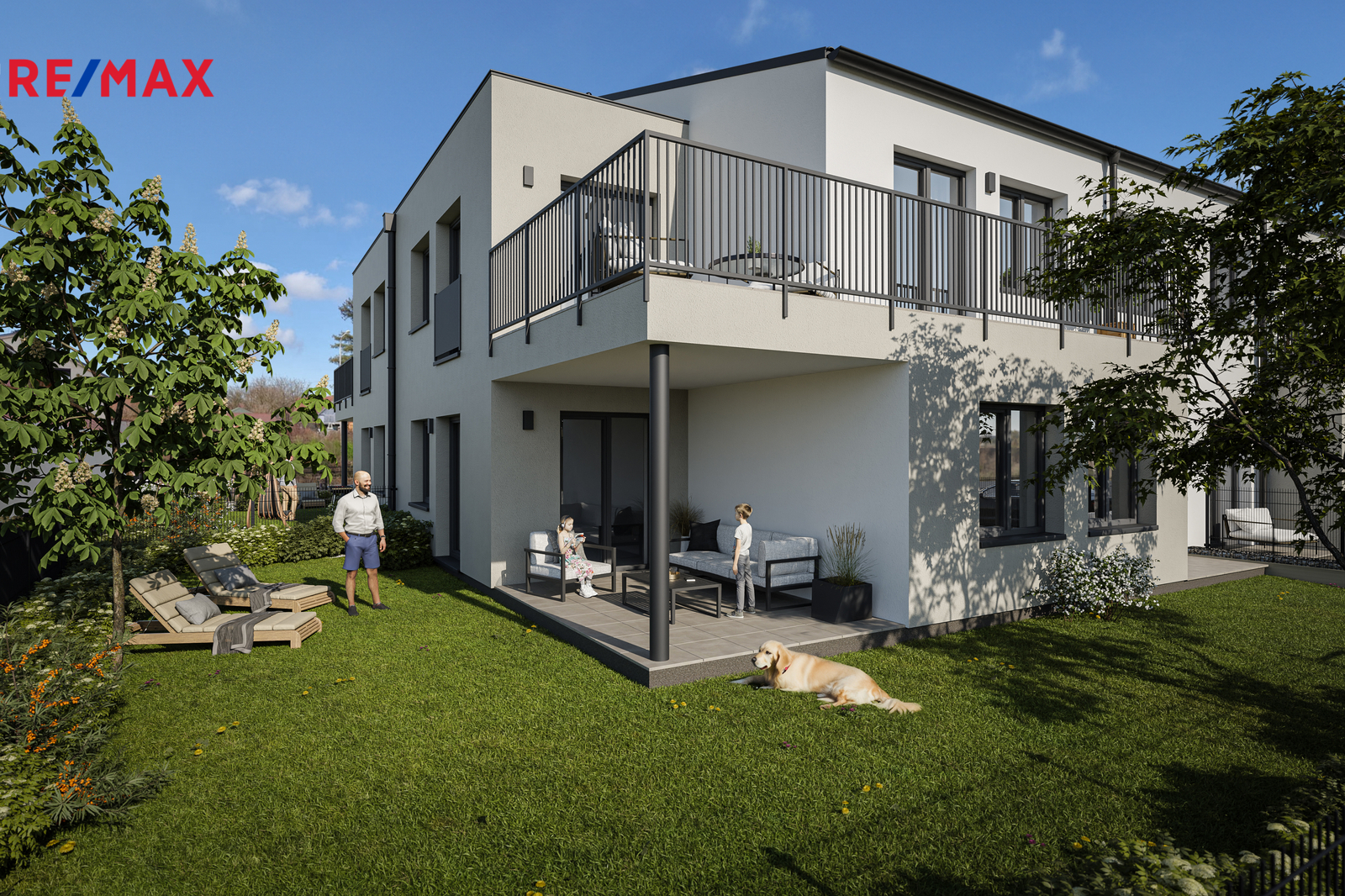 Každý byt disponuje vlastním venkovním prostorem – terasou nebo zahradou, praktickým sklepem a komfortním parkovacím stáním přímo u domu.