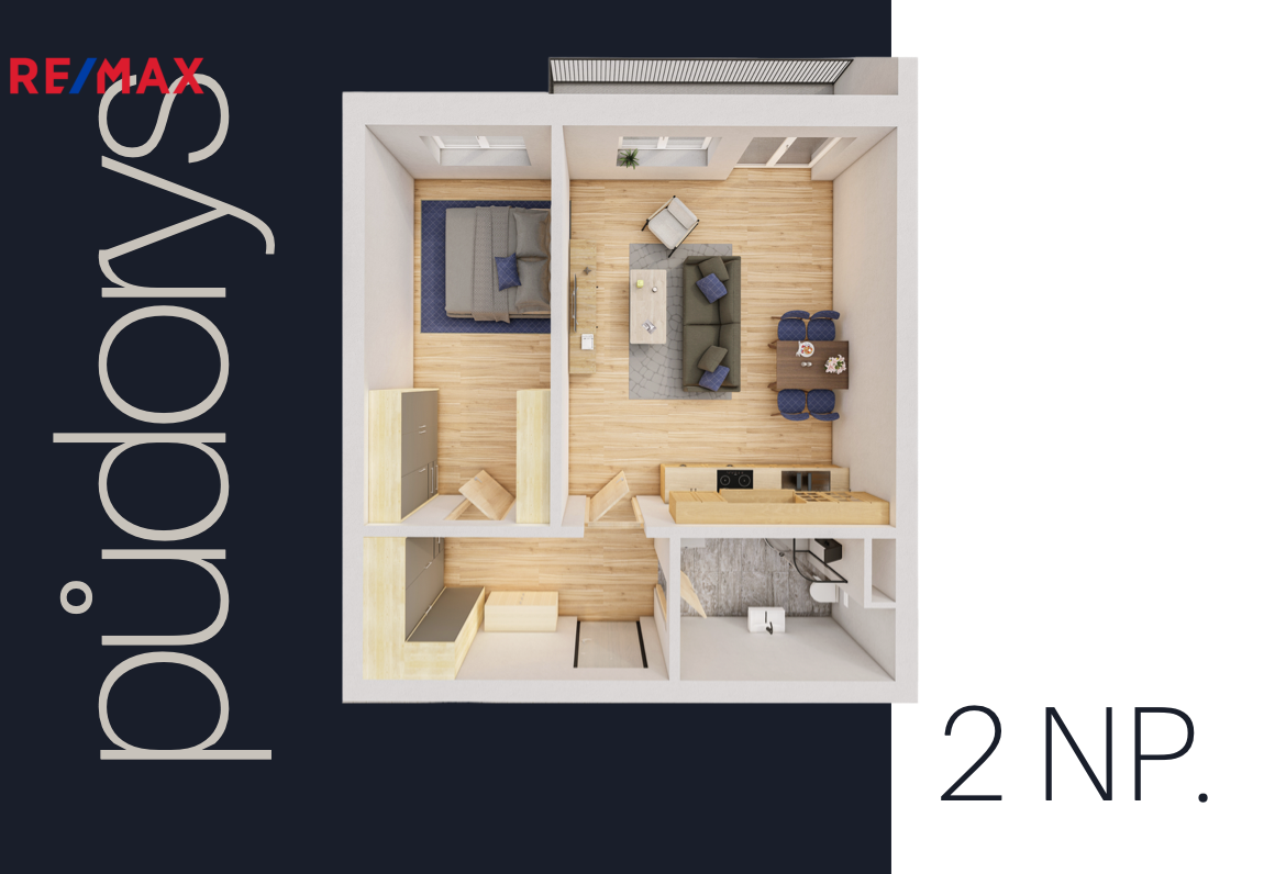 Byt o celkové ploše 54,2m² se nachází ve 2. nadzemním podlaží. Samotná obytná plocha činí 54,2 m² a zahrnuje prostorný obývací pokoj s kuchyňským koutem (25,9 m²), ložnici (14,5 m²), chodbu (8,4m²) a koupelnu s WC (5,4 m²). K bytu dále náleží terasa o velikosti 6m² a praktická sklepní kóje (4,15 m²).