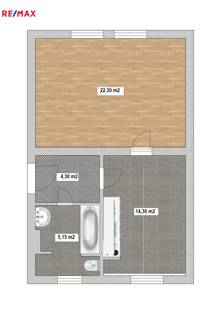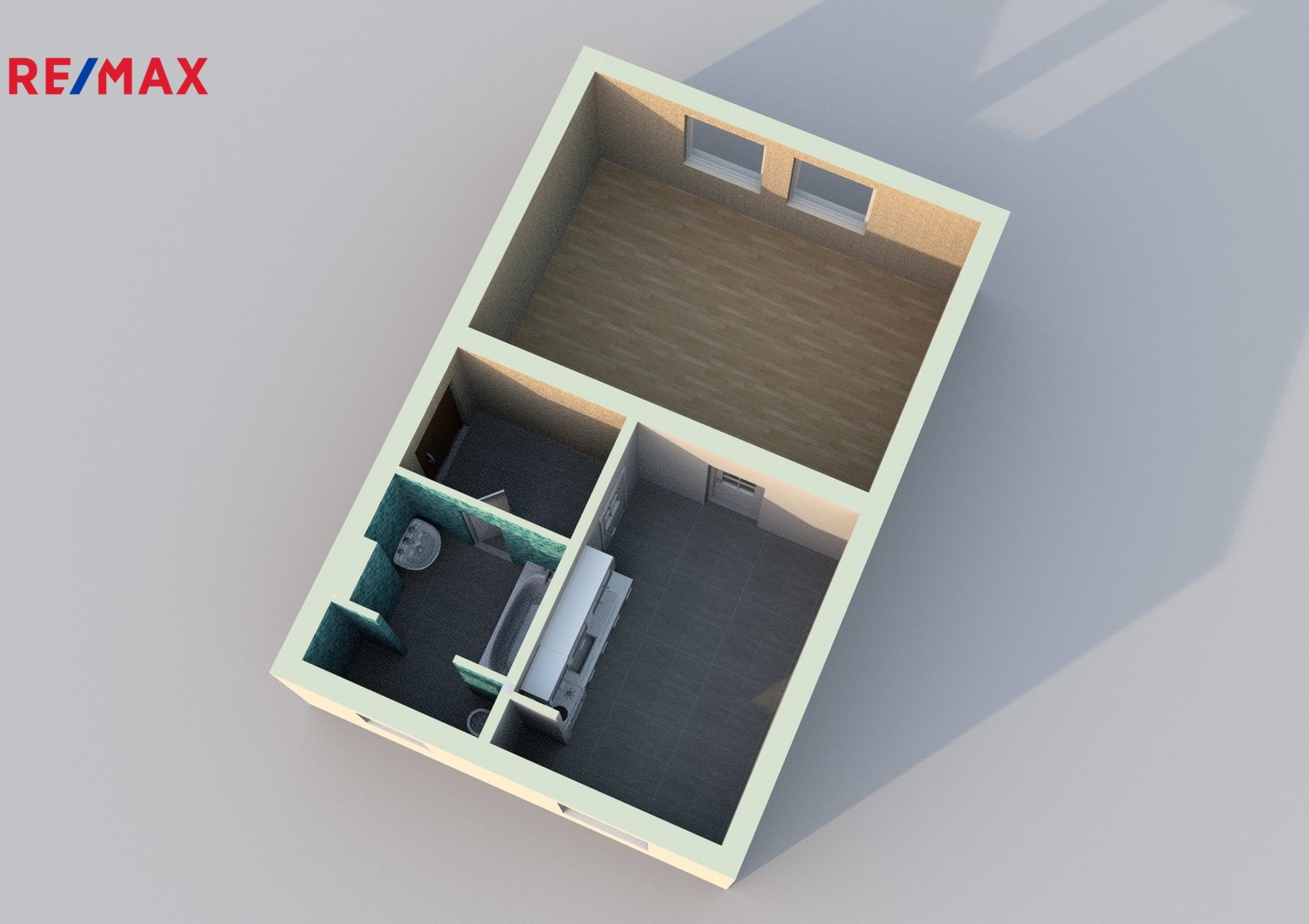 Byt se sestává z předsíně, kuchyně, pokoje a sociálního zařízení (koupelny s WC).