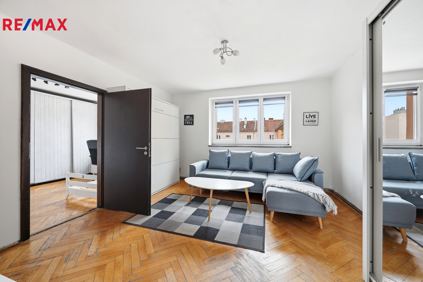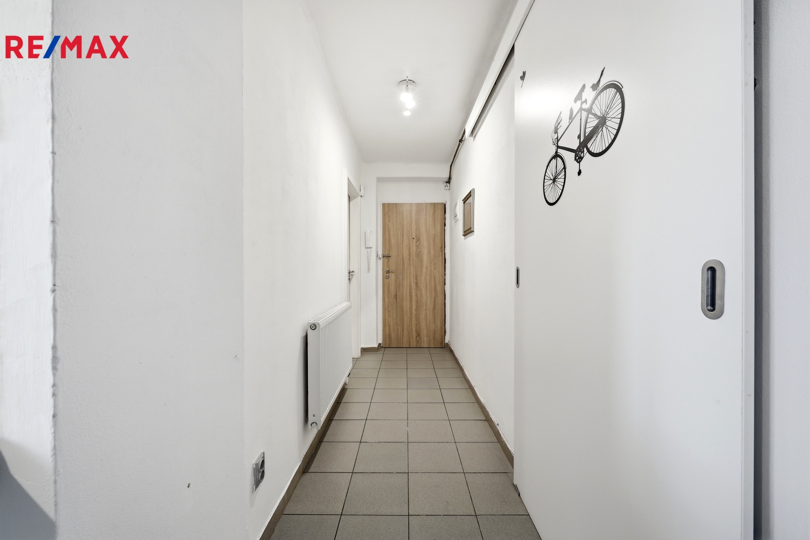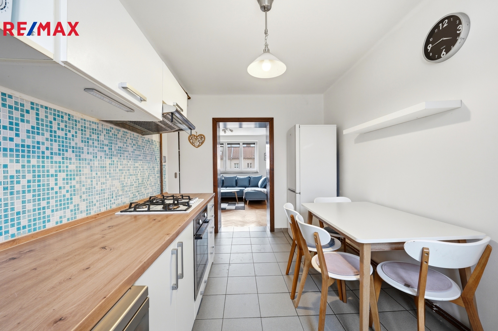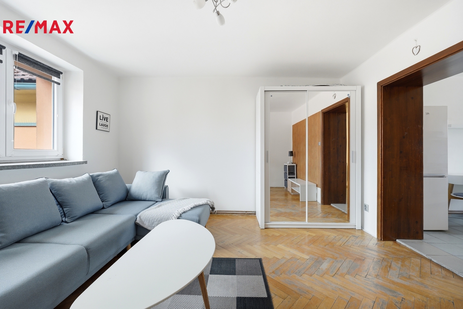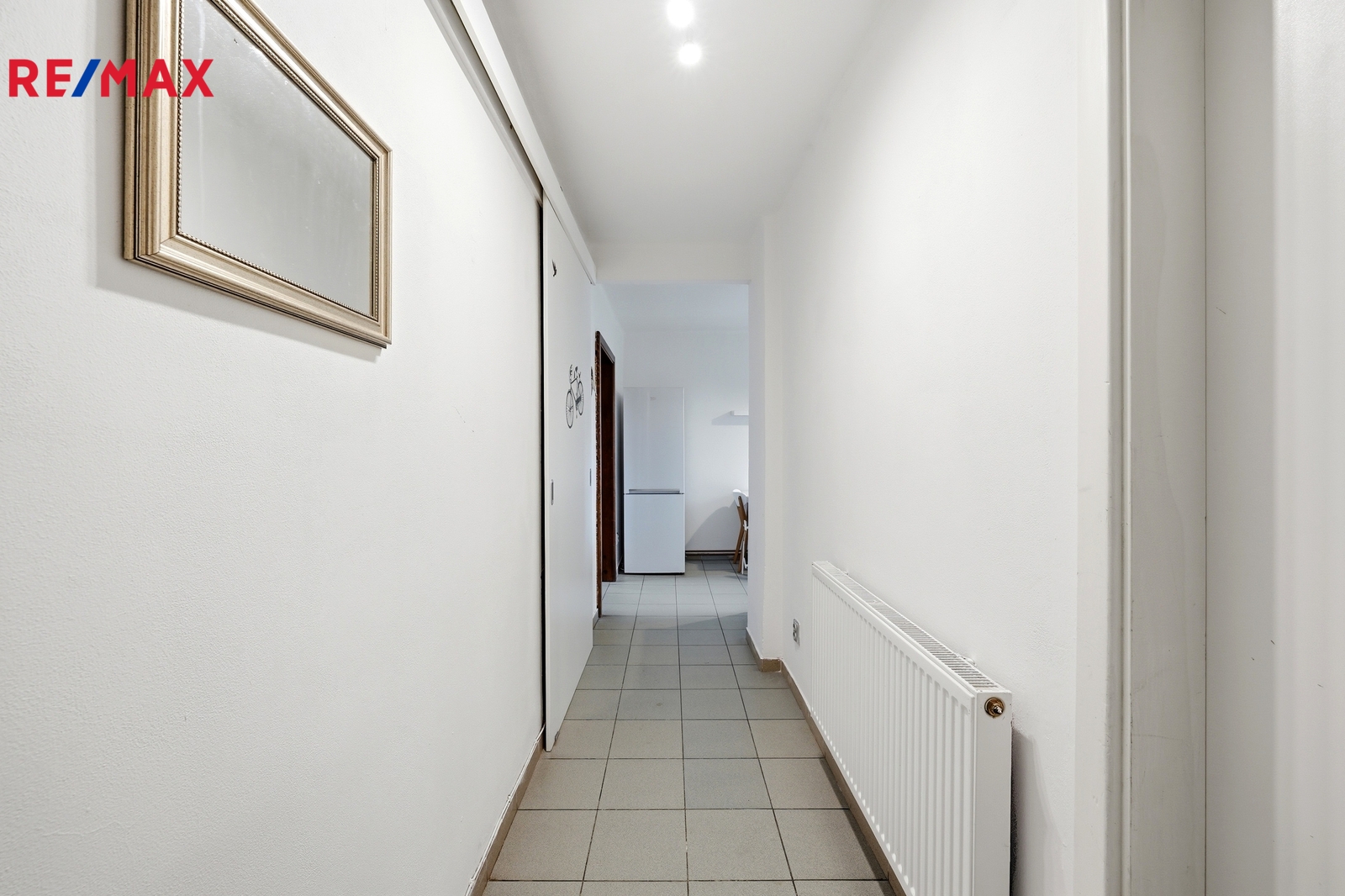 Do bytu vstoupíte dlouhou prostornou chodbou, která poskytuje dostatek místa pro pohyb i úložné řešení. Na levé straně je praktická vestavěná posuvná skříň, hned napravo od vstupu se nachází prostorná koupelna s vanou, kde je umístěn plynový kondenzační kotel. Z chodby se dostanete do kuchyně s kuchyňskou linkou ve velmi dobrém stavu, vybavenou funkčními spotřebiči – myčkou Midea, troubou Fagor, plynovým sporákem a digestoří. Kuchyně přirozeně navazuje na obývací pokoj o velikosti 17 m², který zaujme dřevěnými parketami, gaučem a vysouvací postelí. Z okna se otevírá klidný výhled do vnitrobloku. Další pokoj o velikosti 14 m² je vybaven velkou posuvnou skříní.